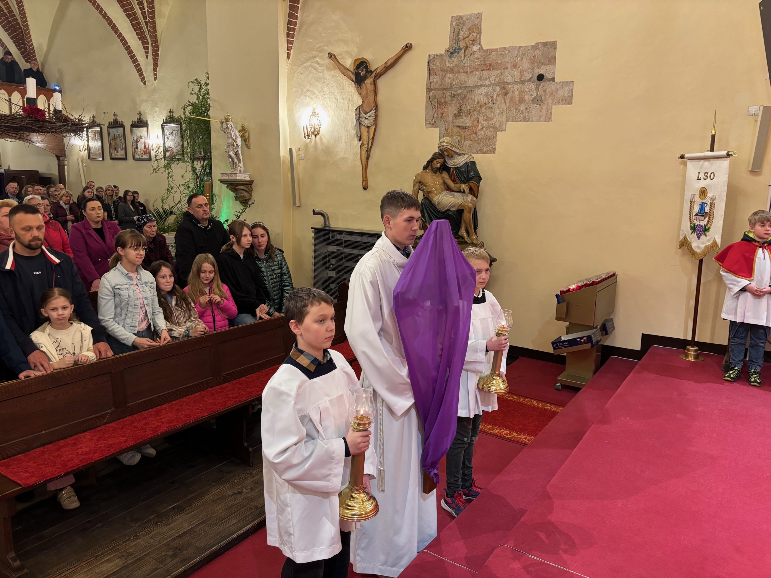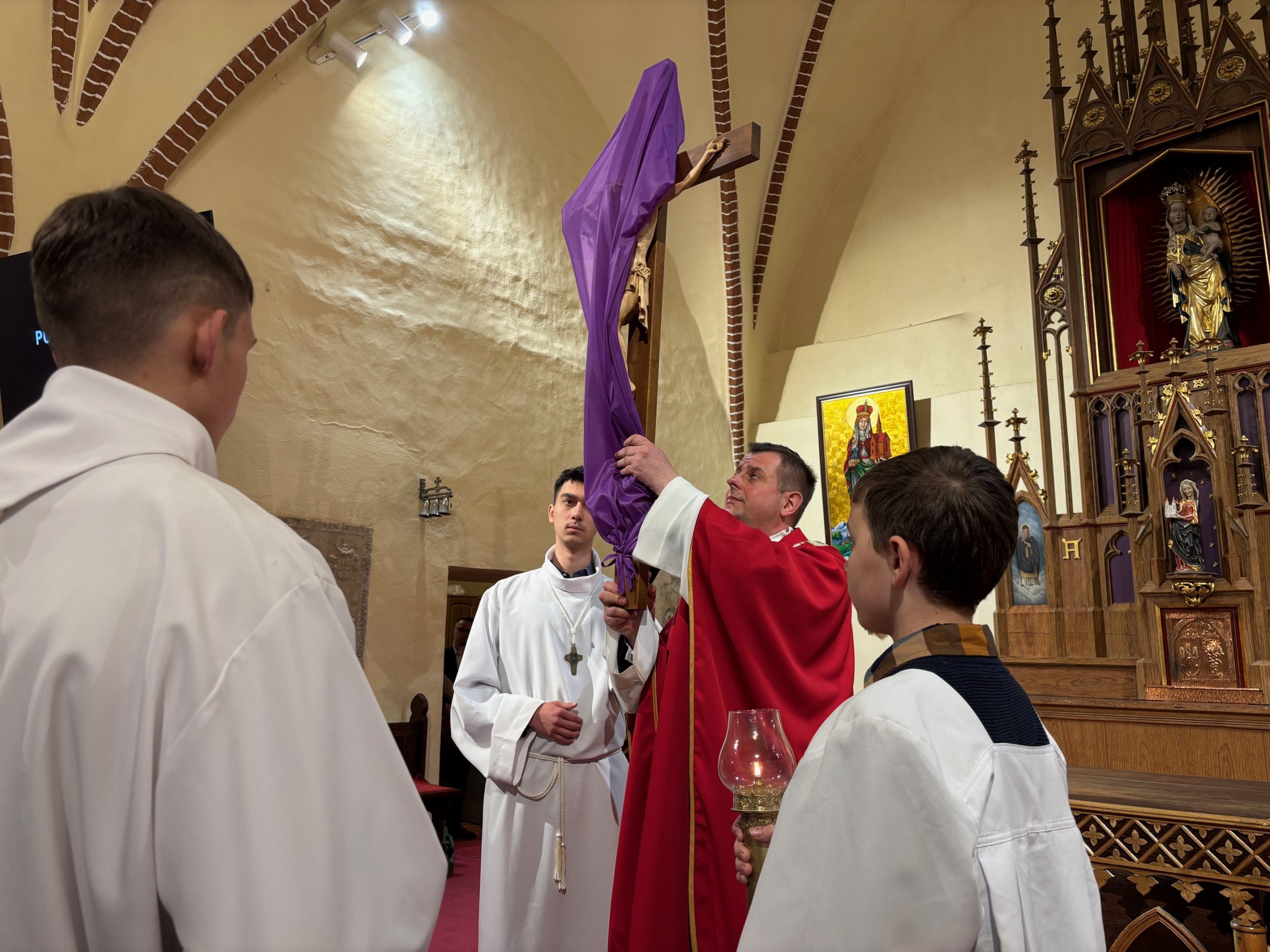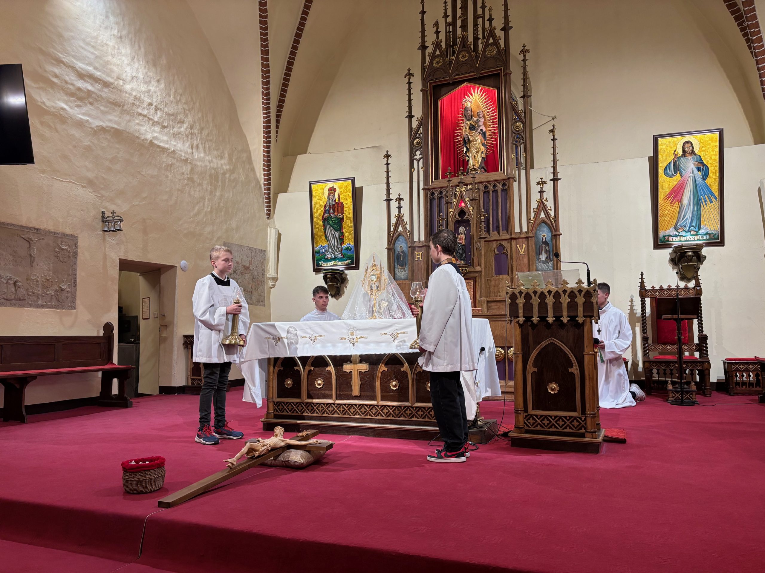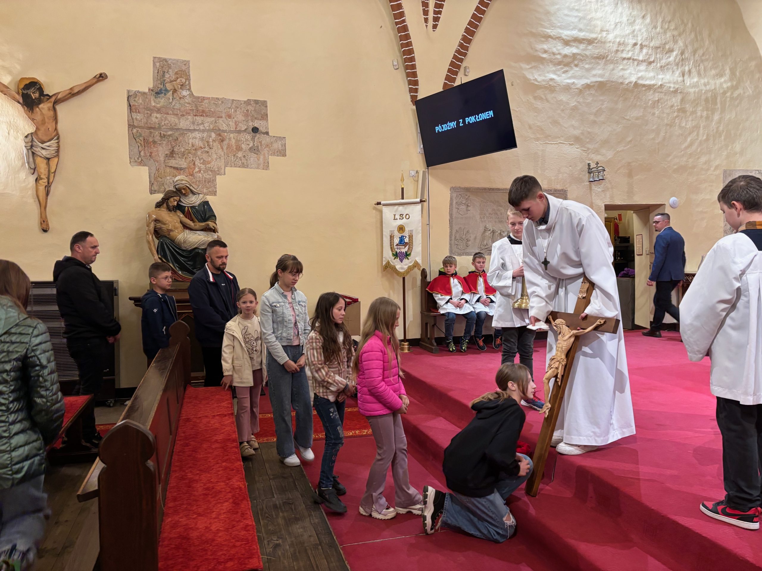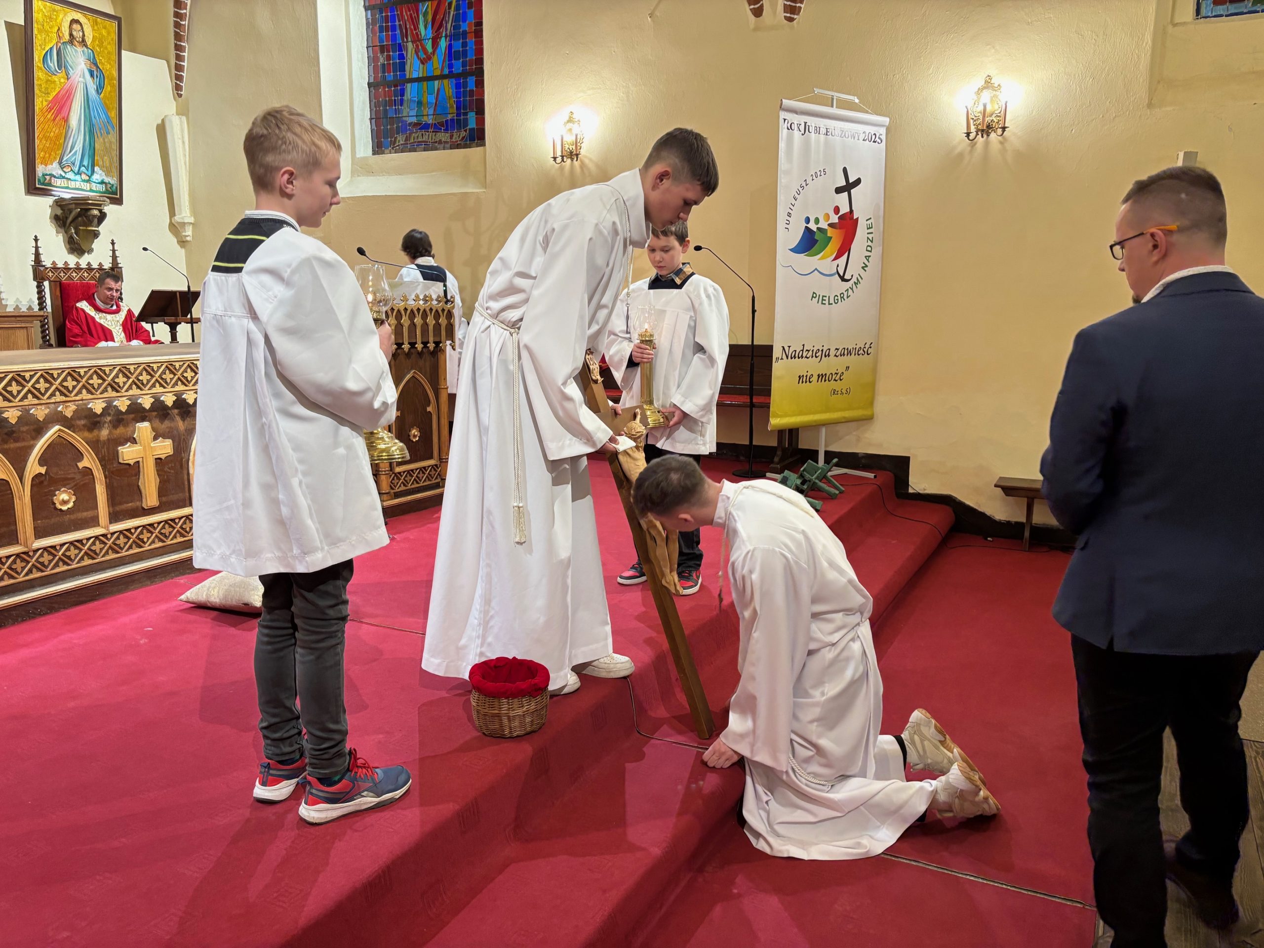W Wielki Piątek Kościół wspomina Mękę i Śmierć Jezusa Chrystusa. Od najdawniejszych czasów w tym dniu nie odprawia się Mszy świętej. Jest to dzień postu ścisłego i umartwienia. O godzinie 17.30 uczestniczyliśmy w Drodze Krzyżowej, następnie rozpoczęła się Liturgia Wielkiego Piątku. Po dojściu asysty do ołtarza – kapłan upadł na twarz w postawie prostracji, czyli geście uniżenia się człowieka oraz smutku i bólu Kościoła. Pierwsza część obrzędów to Liturgia Słowa. Po wysłuchaniu opisu Męki Chrystusa według św. Jana odśpiewanej i homilii, rozpoczęła się uroczysta Modlitwa Powszechna zawierająca 10 wezwań, obejmująca wszystkie potrzeby Kościoła i świata. Następnie rozpoczęła się Adoracja Krzyża. Po oddaniu czci Krzyżowi przez kapłana i asystę rozpoczęła się adoracja przez wiernych. Podchodzili oni ze wszystkich stron i oddawali cześć Krzyżowi poprzez ucałowanie. W tym czasie można było także złożyć ofiarę na Boży Grób w Jerozolimie i na chrześcijan żyjących w Ziemi Świętej. Po zakończeniu Adoracji Krzyża miał miejsce obrzęd Komunii świętej, przechowywanej ze Mszy Wieczerzy Pańskiej, odprawionej w Wielki Czwartek. Na zakończenie liturgii Wielkiego Piątku procesyjne przeniesiono Najświętszy Sakrament do Grobu Pańskiego oraz obnażono ołtarz.