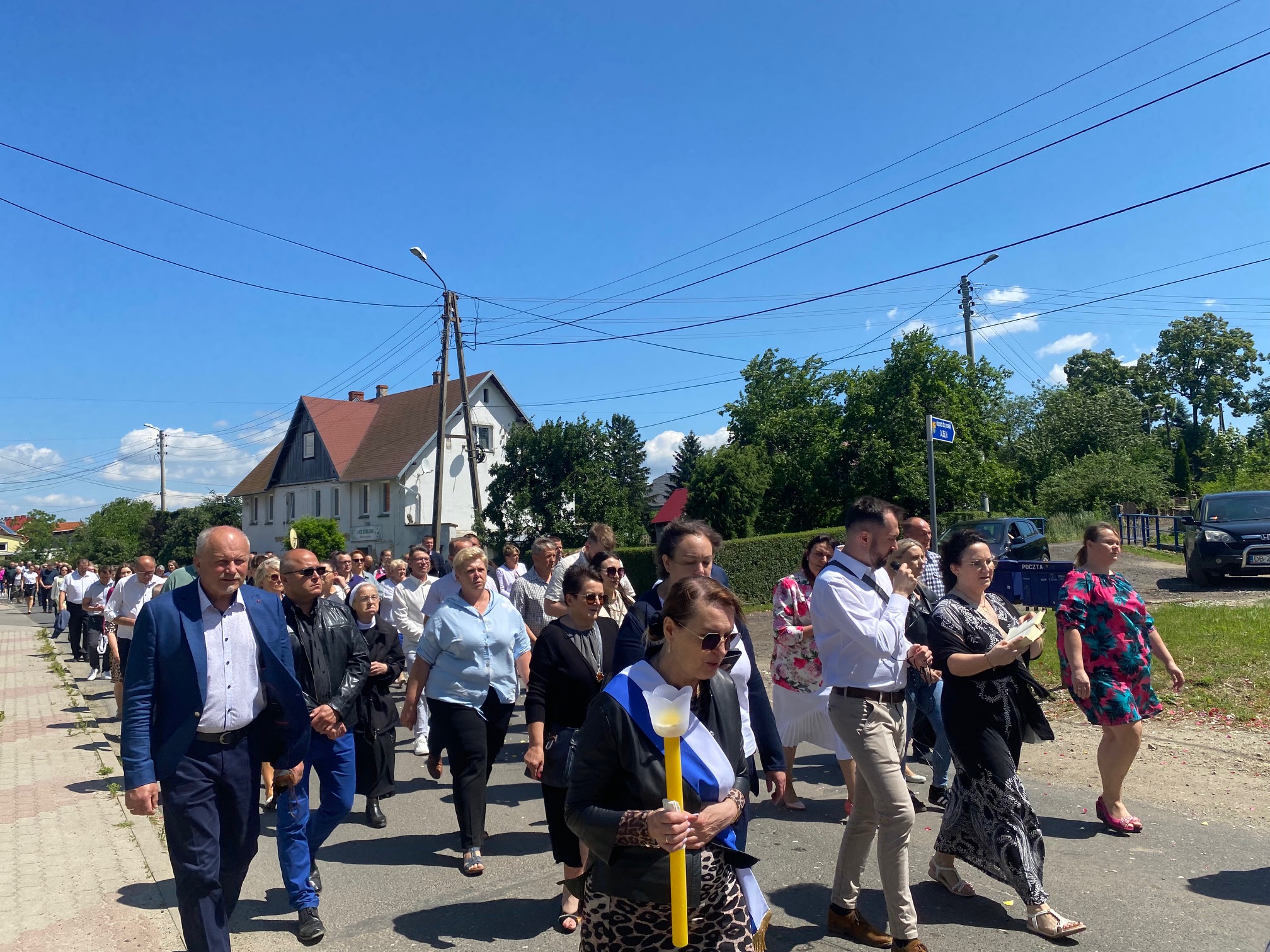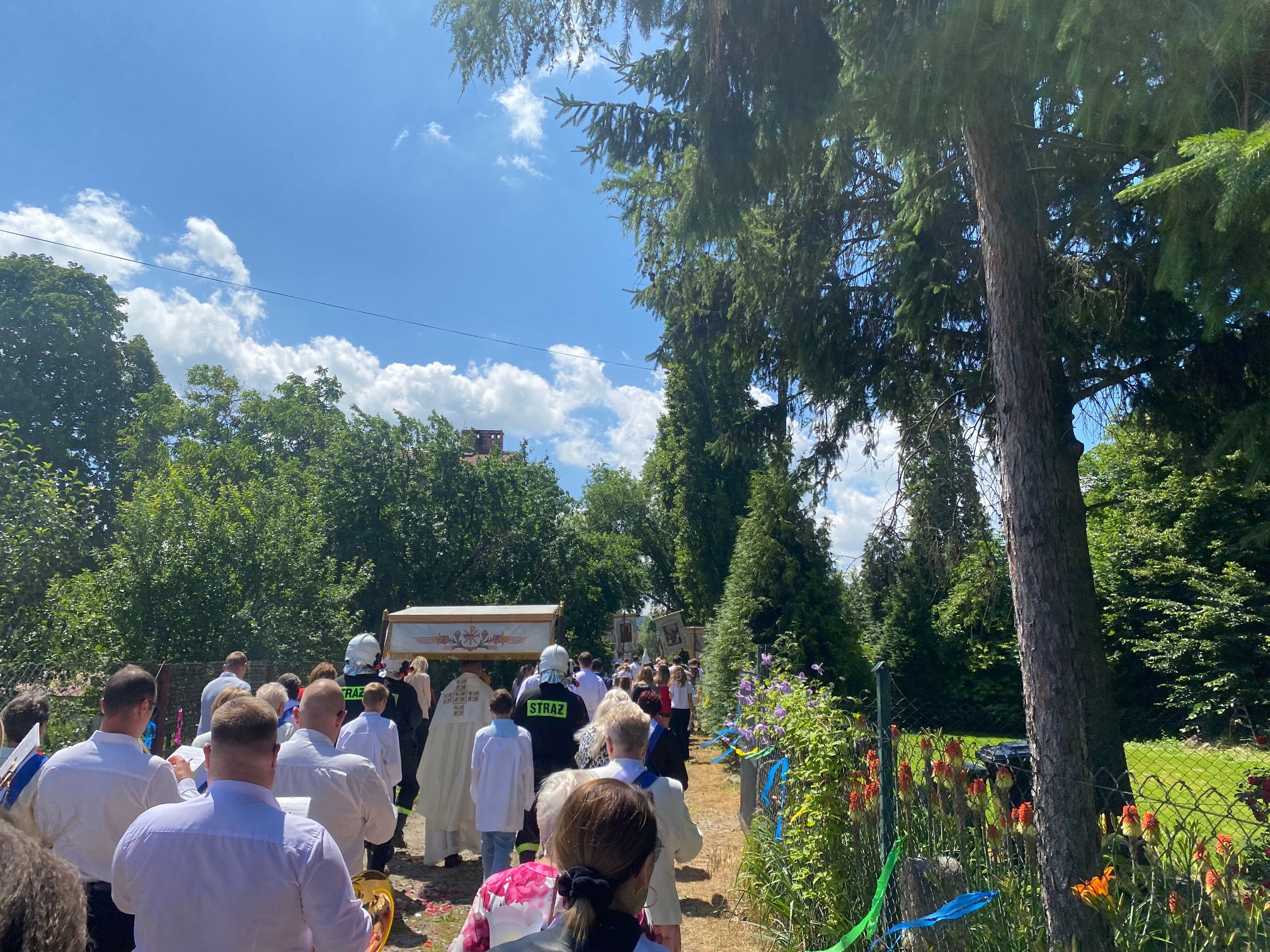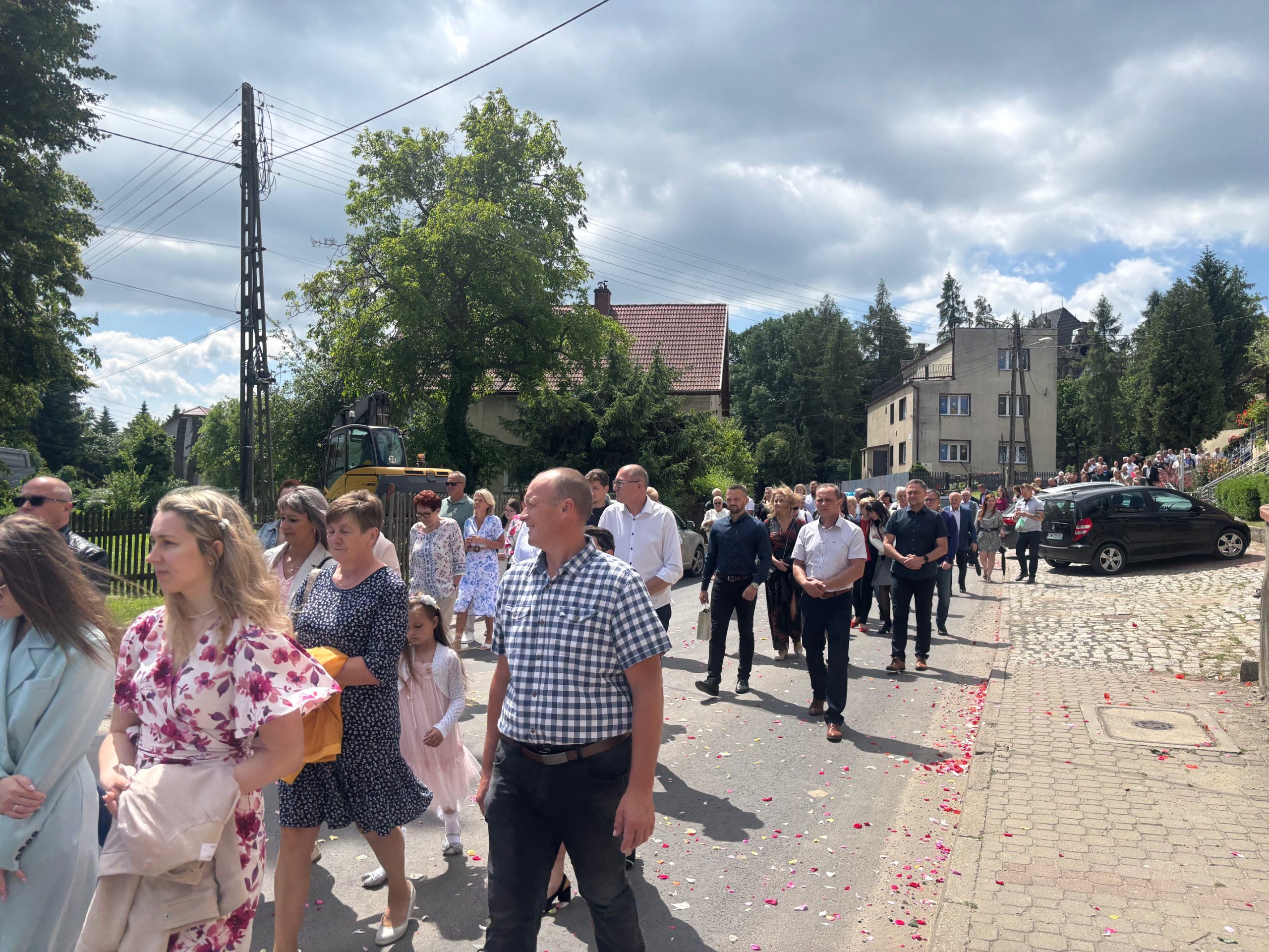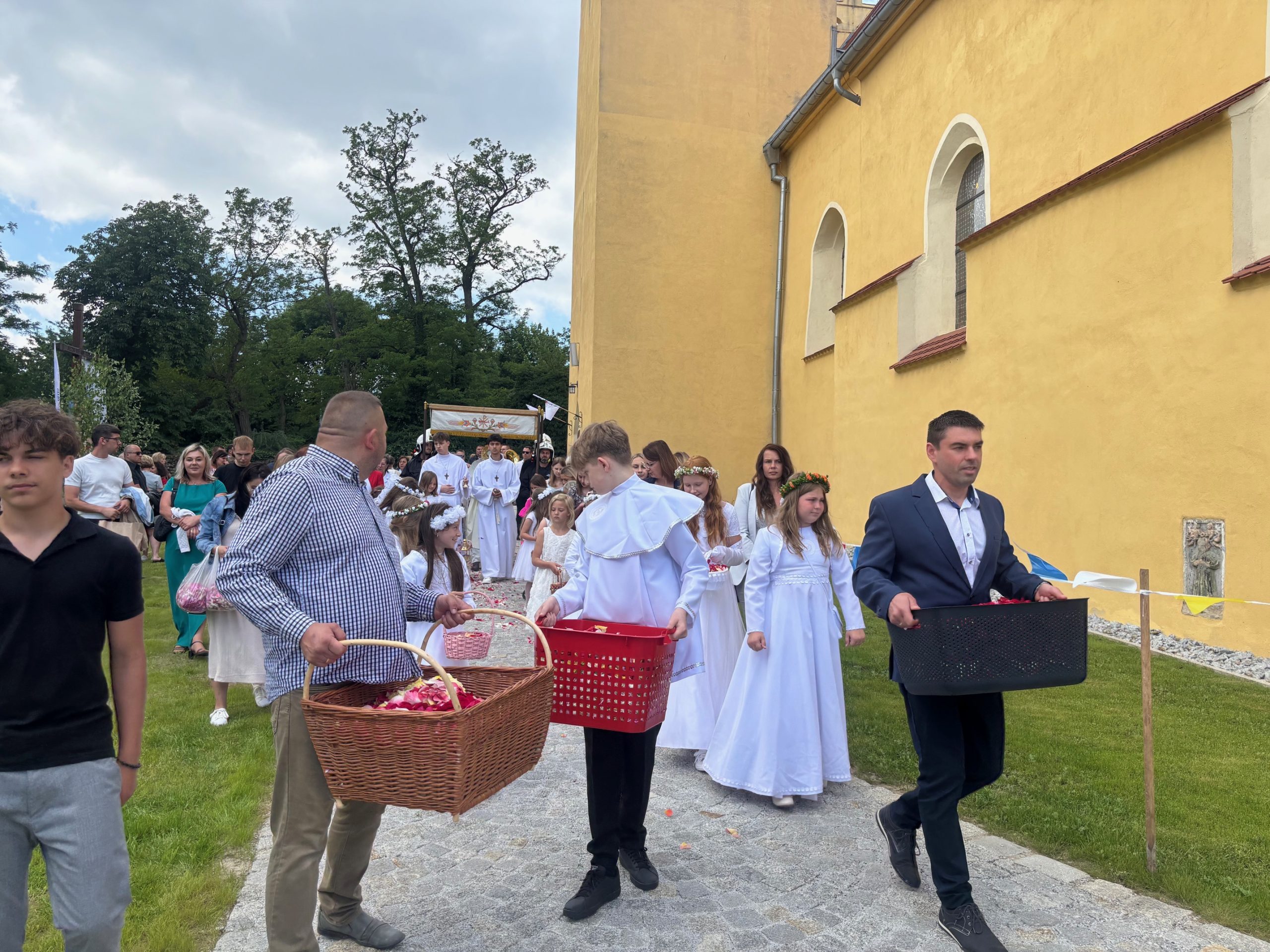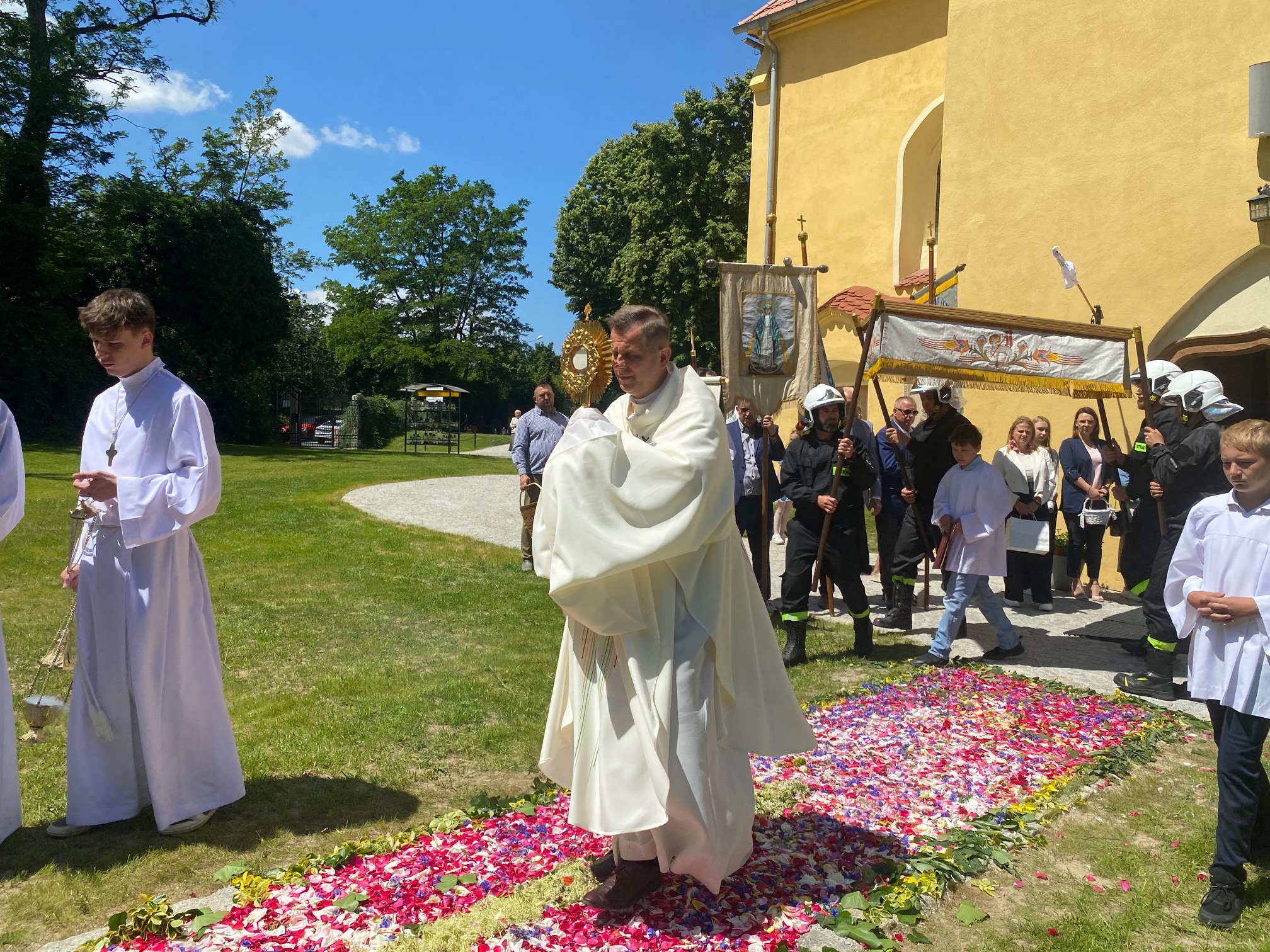 Aby świętować Uroczystość Najświętszego Ciała i Krwi Chrystusa, czyli wyruszyć w procesji eucharystycznej, prosząc Jezusa, by pobłogosławił parafię, potrzeba pracy. Pracę, którą rozpoczęli przedstawiciele grup parafialnych w środę po południu należy widzieć nie tylko jako zadanie „by było ładnie, bezpiecznie”, ale jako świadectwo. Pani Agnieszka, pytana w środę na przygotowaniu ołtarzy dlaczego przyszła, odpowiedziała bez namysłu: „Tak mi serce podpowiada, by tu być i swoją pracą wyrazić moją miłość do Jezusa”. W czwartek o godzinie 10.30 rozpoczęła się Msza Święta. W kazaniu ks. Marcin zachęcił do miłości do Eucharystii, przejawiającej się w chodzeniu na Mszę św. i na adorację w ciągu dnia. Kapłan prosił: chodźmy do kościoła jak najczęściej, mimo pracy, aby przyjąć Jezusa w Komunii św. Bo On czeka na nas każdego dnia. Niech nie czeka nadaremnie! Po Mszy św. z kościoła wyruszyła procesja, wraz z dziećmi obchodzącymi w tym uroczystym dniu swoją Pierwszą Rocznicę Komunii Świętej oraz ich rodzicami. W tym roku procesja do czterech ołtarzy wyszła poza mury kościoła, w stronę Dolnego Mokrzeszowa. Dziewczynki sypiące kwiaty, ministranci, lektorzy – piękne świadectwo miłości do Jezusa. Furorę na procesji zrobiła mała Julka, która z wielką uwagą sypała kwiaty. Ona tak wyznała wiarę. Uczestnicy procesji w skupieniu zatrzymywali się przy kolejnych ołtarzach, przy których następowało odczytanie fragmentów Ewangelii. Przy pierwszym z nich odczytywany jest fragment Ewangelii wg św. Mateusza o ostatniej wieczerzy, a więc nawiązujący do ustanowienia przez Jezusa Eucharystii. Drugi ołtarz jest związany z fragmentem Ewangelii wg św. Marka, dotyczącym rozmnożenia chleba. Przy trzecim ołtarzu odczytywany jest fragment Ewangelii wg św. Łukasza, który opowiada o zaproszonych na ucztę. Zaś ostatni, czwarty ołtarz związany jest z Ewangelią wg św. Jana i sakramentem zjednoczenia. Przy nim kapłan zachęcał do „zakochania się w Eucharystii” i na koniec podziękował za pomoc w przygotowaniu procesji.