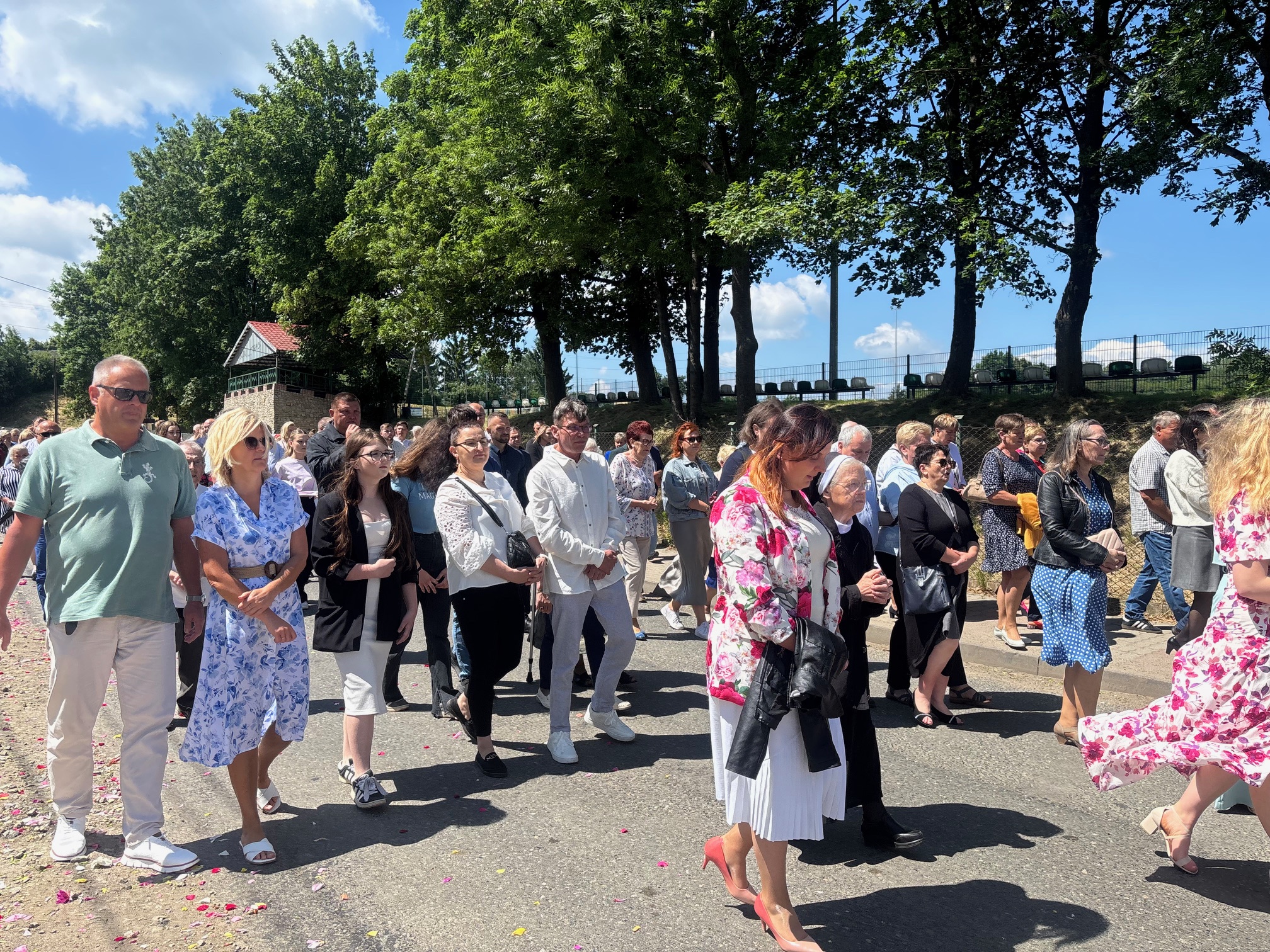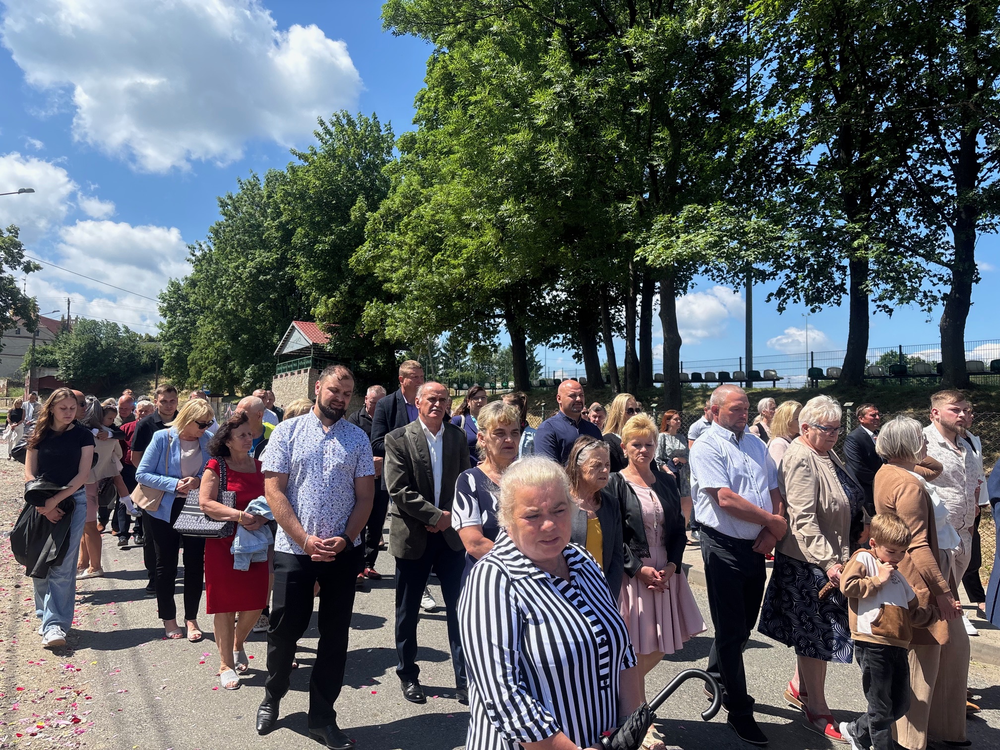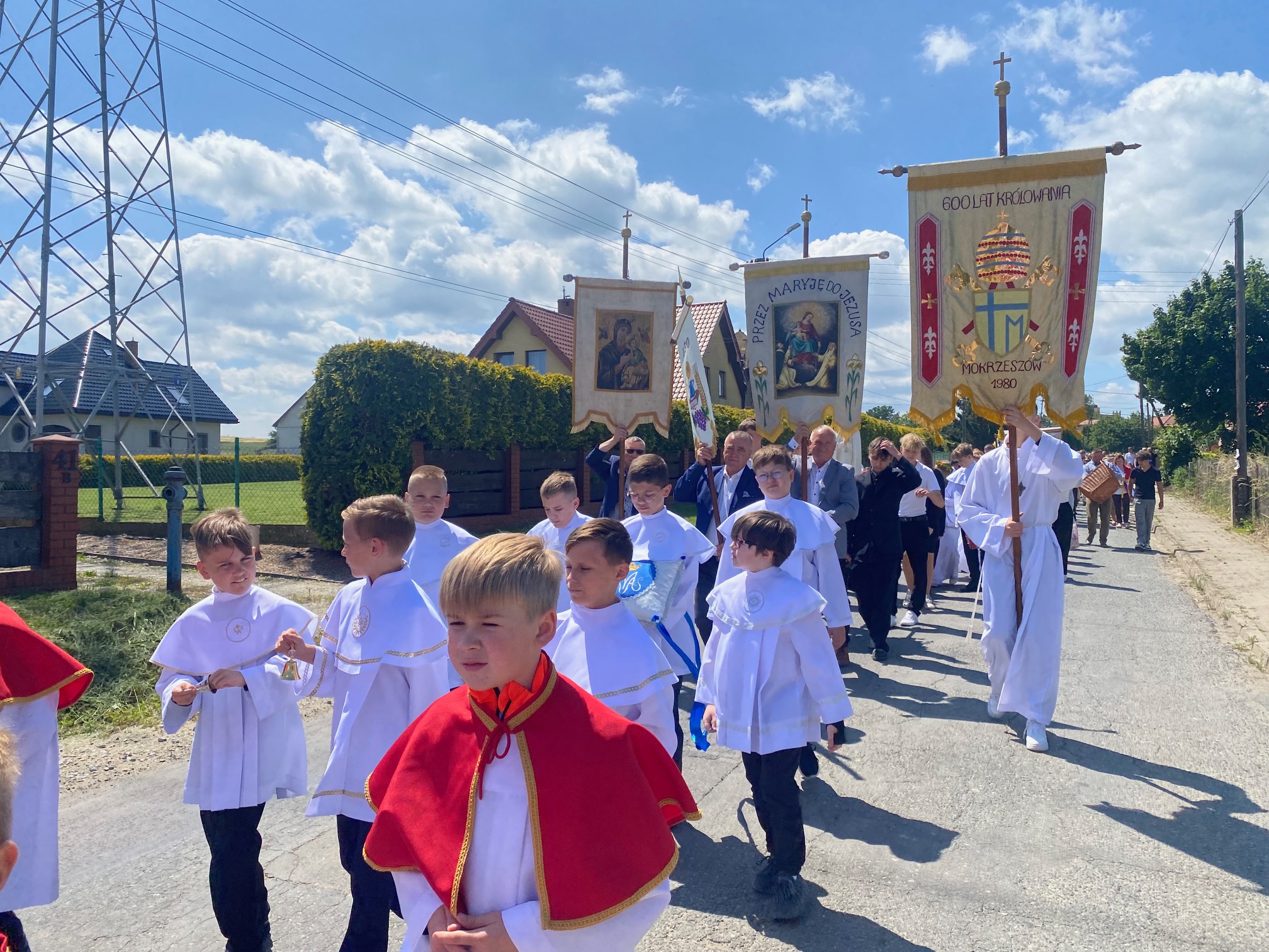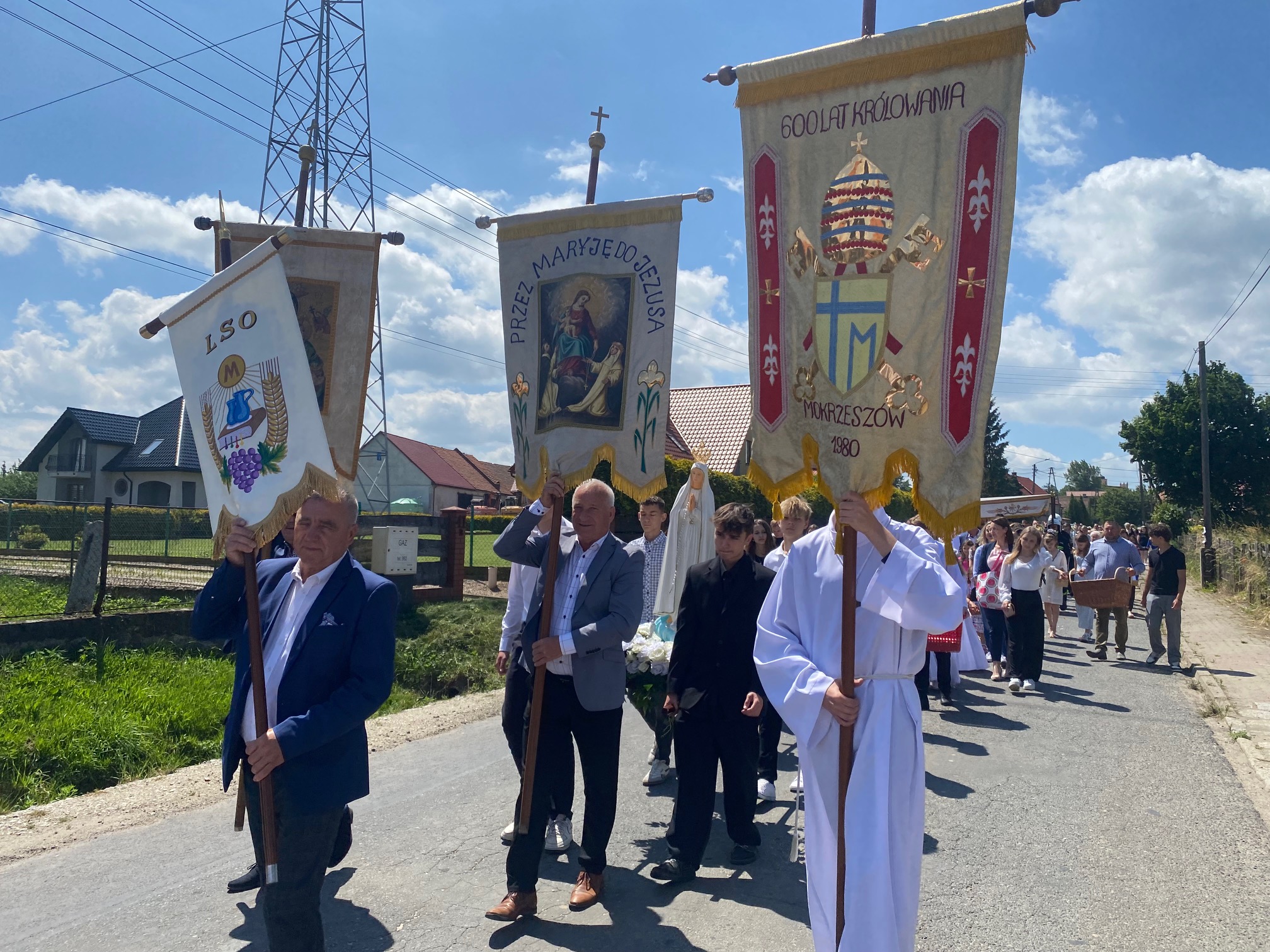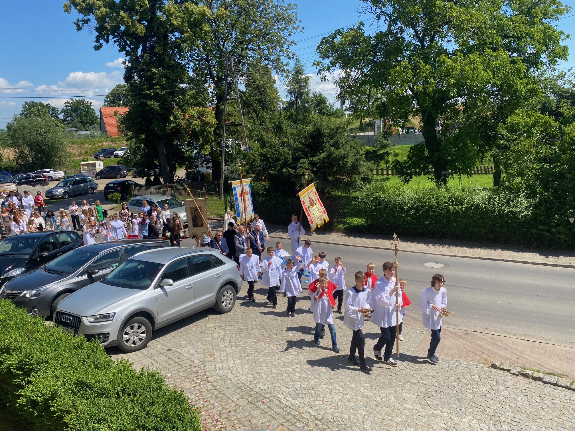 Aby świętować Uroczystość Najświętszego Ciała i Krwi Chrystusa, czyli wyruszyć w procesji eucharystycznej, prosząc Jezusa, by pobłogosławił parafię, potrzeba pracy. Pracę, którą rozpoczęli przedstawiciele grup parafialnych w środę po południu należy widzieć nie tylko jako zadanie „by było ładnie, bezpiecznie”, ale jako świadectwo. Pani Agnieszka, pytana w środę na przygotowaniu ołtarzy dlaczego przyszła, odpowiedziała bez namysłu: „Tak mi serce podpowiada, by tu być i swoją pracą wyrazić moją miłość do Jezusa”. W czwartek o godzinie 10.30 rozpoczęła się Msza Święta. W kazaniu ks. Marcin zachęcił do miłości do Eucharystii, przejawiającej się w chodzeniu na Mszę św. i na adorację w ciągu dnia. Kapłan prosił: chodźmy do kościoła jak najczęściej, mimo pracy, aby przyjąć Jezusa w Komunii św. Bo On czeka na nas każdego dnia. Niech nie czeka nadaremnie! Po Mszy św. z kościoła wyruszyła procesja, wraz z dziećmi obchodzącymi w tym uroczystym dniu swoją Pierwszą Rocznicę Komunii Świętej oraz ich rodzicami. W tym roku procesja do czterech ołtarzy wyszła poza mury kościoła, w stronę Dolnego Mokrzeszowa. Dziewczynki sypiące kwiaty, ministranci, lektorzy – piękne świadectwo miłości do Jezusa. Furorę na procesji zrobiła mała Julka, która z wielką uwagą sypała kwiaty. Ona tak wyznała wiarę. Uczestnicy procesji w skupieniu zatrzymywali się przy kolejnych ołtarzach, przy których następowało odczytanie fragmentów Ewangelii. Przy pierwszym z nich odczytywany jest fragment Ewangelii wg św. Mateusza o ostatniej wieczerzy, a więc nawiązujący do ustanowienia przez Jezusa Eucharystii. Drugi ołtarz jest związany z fragmentem Ewangelii wg św. Marka, dotyczącym rozmnożenia chleba. Przy trzecim ołtarzu odczytywany jest fragment Ewangelii wg św. Łukasza, który opowiada o zaproszonych na ucztę. Zaś ostatni, czwarty ołtarz związany jest z Ewangelią wg św. Jana i sakramentem zjednoczenia. Przy nim kapłan zachęcał do „zakochania się w Eucharystii” i na koniec podziękował za pomoc w przygotowaniu procesji.