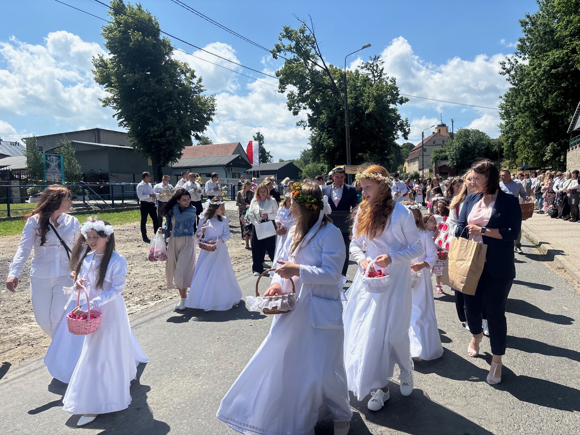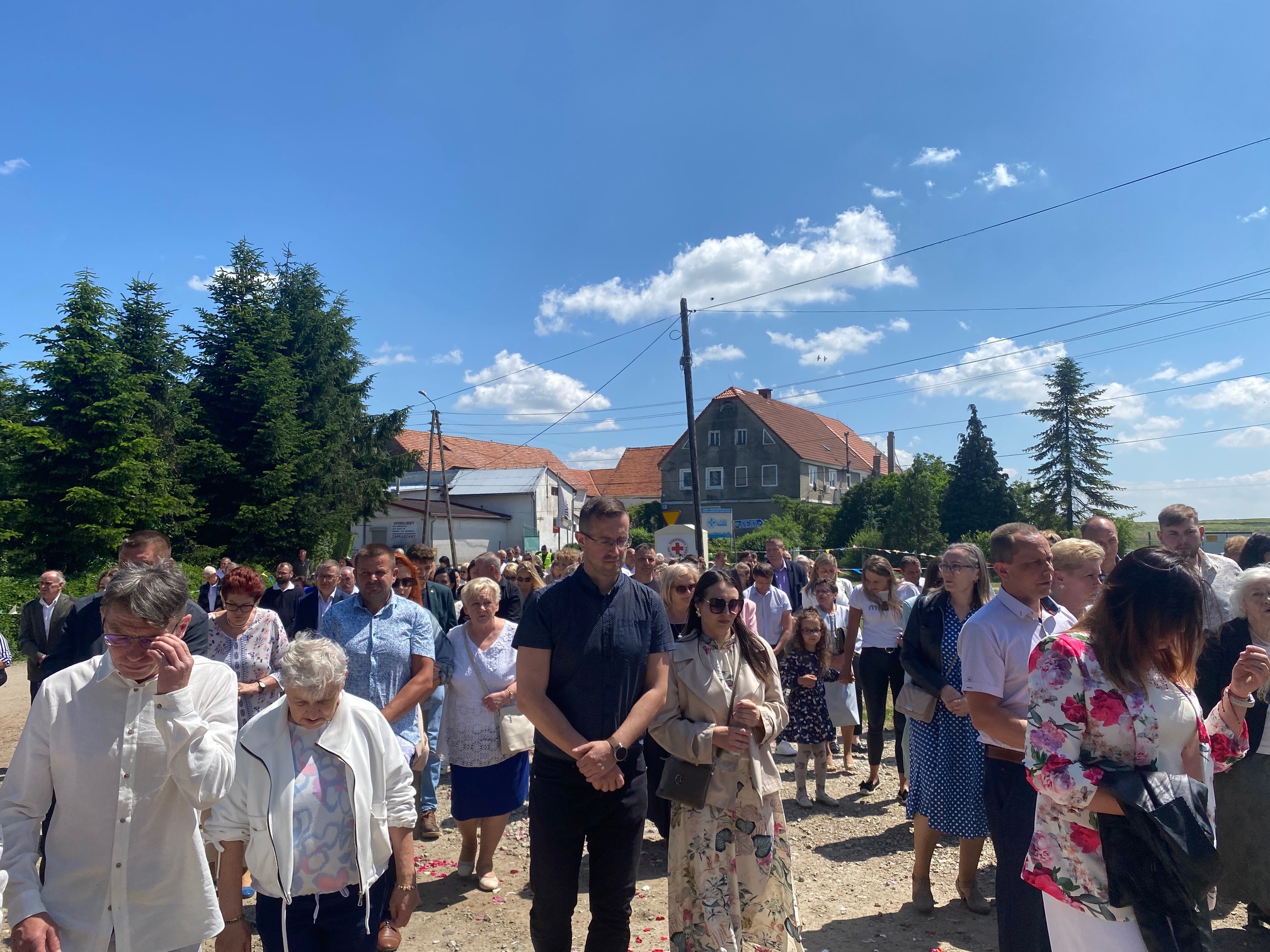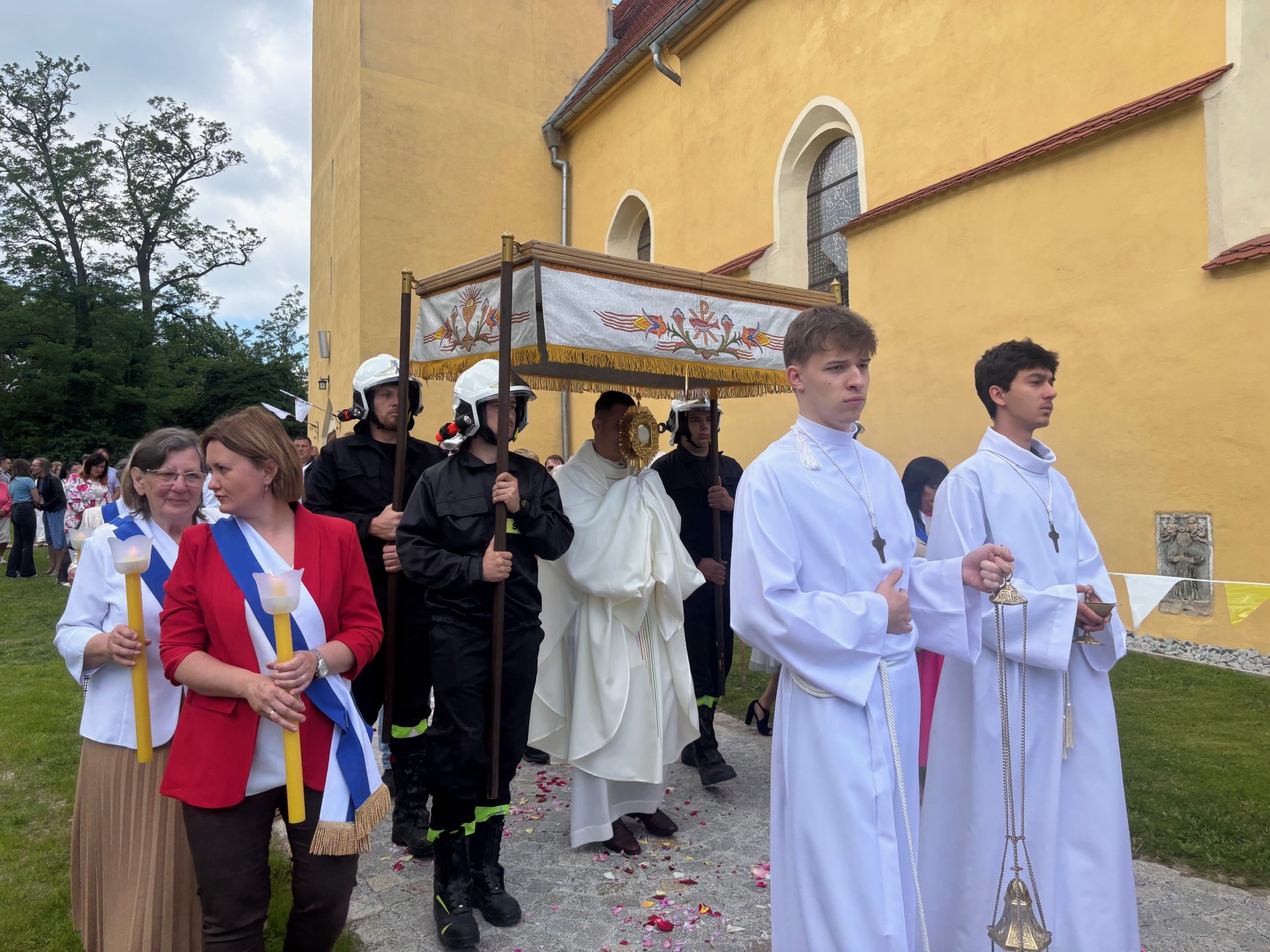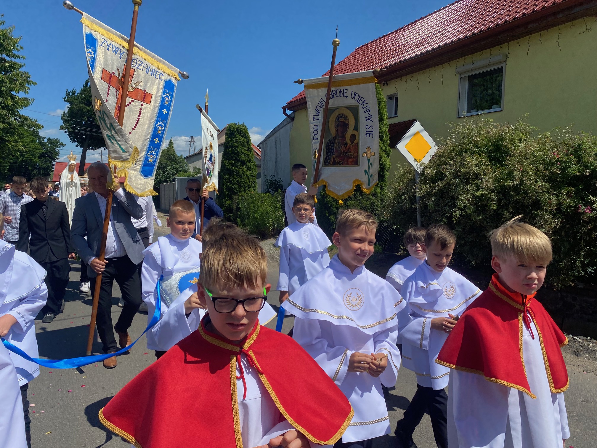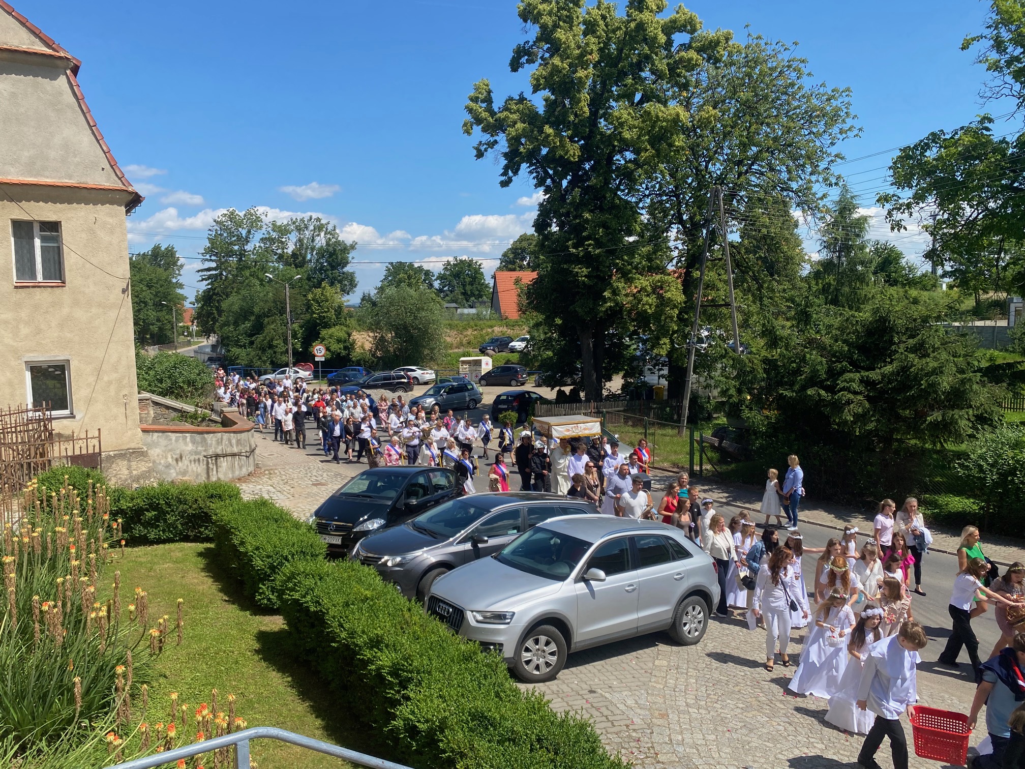 Aby świętować Uroczystość Najświętszego Ciała i Krwi Chrystusa, czyli wyruszyć w procesji eucharystycznej, prosząc Jezusa, by pobłogosławił parafię, potrzeba pracy. Pracę, którą rozpoczęli przedstawiciele grup parafialnych w środę po południu należy widzieć nie tylko jako zadanie „by było ładnie, bezpiecznie”, ale jako świadectwo. Pani Agnieszka, pytana w środę na przygotowaniu ołtarzy dlaczego przyszła, odpowiedziała bez namysłu: „Tak mi serce podpowiada, by tu być i swoją pracą wyrazić moją miłość do Jezusa”. W czwartek o godzinie 10.30 rozpoczęła się Msza Święta. W kazaniu ks. Marcin zachęcił do miłości do Eucharystii, przejawiającej się w chodzeniu na Mszę św. i na adorację w ciągu dnia. Kapłan prosił: chodźmy do kościoła jak najczęściej, mimo pracy, aby przyjąć Jezusa w Komunii św. Bo On czeka na nas każdego dnia. Niech nie czeka nadaremnie! Po Mszy św. z kościoła wyruszyła procesja, wraz z dziećmi obchodzącymi w tym uroczystym dniu swoją Pierwszą Rocznicę Komunii Świętej oraz ich rodzicami. W tym roku procesja do czterech ołtarzy wyszła poza mury kościoła, w stronę Dolnego Mokrzeszowa. Dziewczynki sypiące kwiaty, ministranci, lektorzy – piękne świadectwo miłości do Jezusa. Furorę na procesji zrobiła mała Julka, która z wielką uwagą sypała kwiaty. Ona tak wyznała wiarę. Uczestnicy procesji w skupieniu zatrzymywali się przy kolejnych ołtarzach, przy których następowało odczytanie fragmentów Ewangelii. Przy pierwszym z nich odczytywany jest fragment Ewangelii wg św. Mateusza o ostatniej wieczerzy, a więc nawiązujący do ustanowienia przez Jezusa Eucharystii. Drugi ołtarz jest związany z fragmentem Ewangelii wg św. Marka, dotyczącym rozmnożenia chleba. Przy trzecim ołtarzu odczytywany jest fragment Ewangelii wg św. Łukasza, który opowiada o zaproszonych na ucztę. Zaś ostatni, czwarty ołtarz związany jest z Ewangelią wg św. Jana i sakramentem zjednoczenia. Przy nim kapłan zachęcał do „zakochania się w Eucharystii” i na koniec podziękował za pomoc w przygotowaniu procesji.