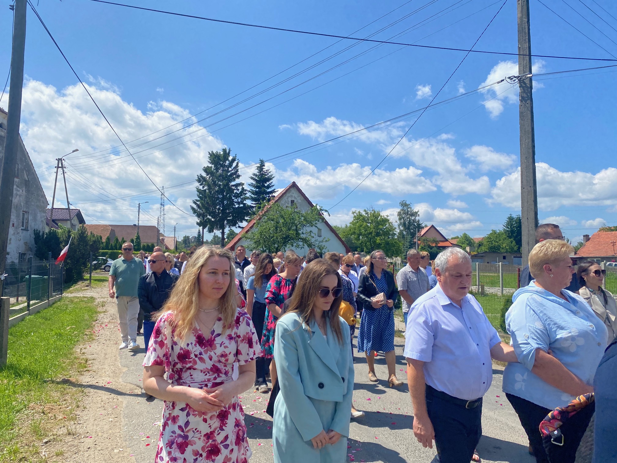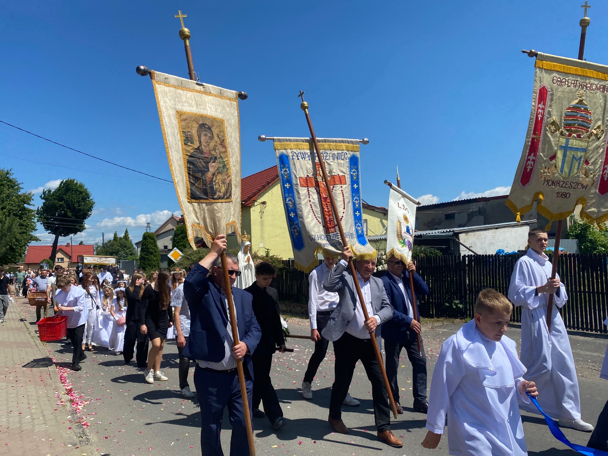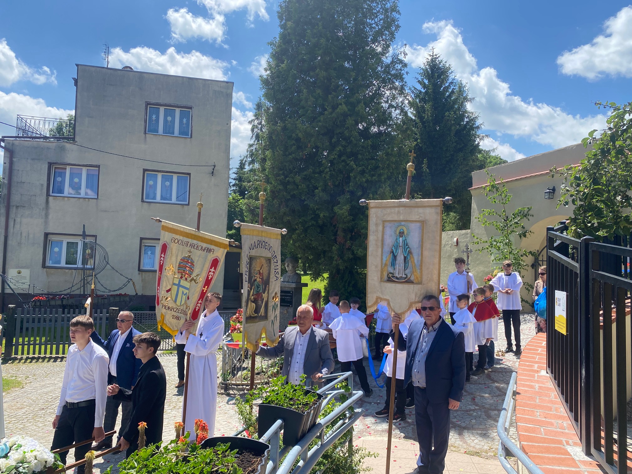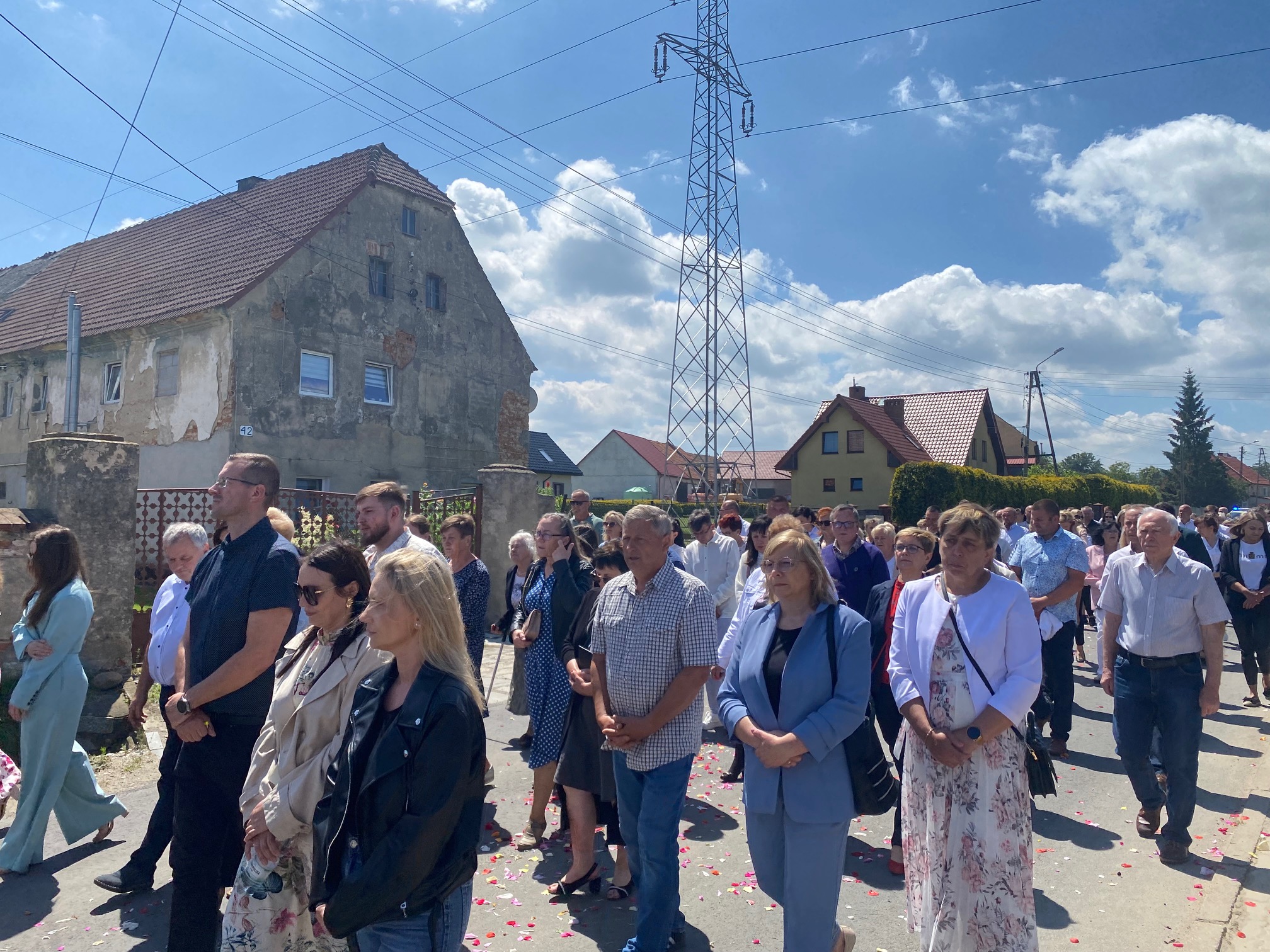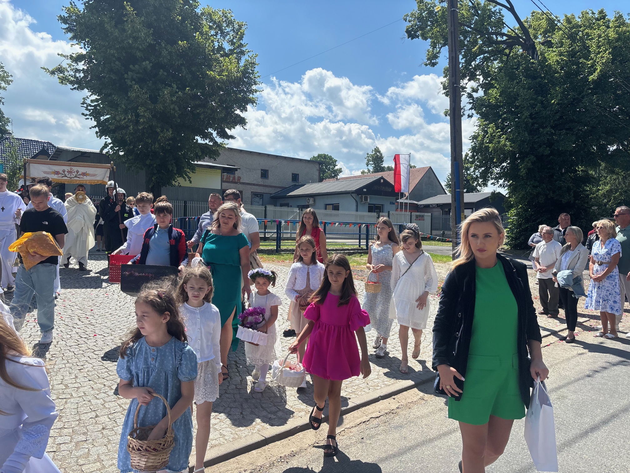 Aby świętować Uroczystość Najświętszego Ciała i Krwi Chrystusa, czyli wyruszyć w procesji eucharystycznej, prosząc Jezusa, by pobłogosławił parafię, potrzeba pracy. Pracę, którą rozpoczęli przedstawiciele grup parafialnych w środę po południu należy widzieć nie tylko jako zadanie „by było ładnie, bezpiecznie”, ale jako świadectwo. Pani Agnieszka, pytana w środę na przygotowaniu ołtarzy dlaczego przyszła, odpowiedziała bez namysłu: „Tak mi serce podpowiada, by tu być i swoją pracą wyrazić moją miłość do Jezusa”. W czwartek o godzinie 10.30 rozpoczęła się Msza Święta. W kazaniu ks. Marcin zachęcił do miłości do Eucharystii, przejawiającej się w chodzeniu na Mszę św. i na adorację w ciągu dnia. Kapłan prosił: chodźmy do kościoła jak najczęściej, mimo pracy, aby przyjąć Jezusa w Komunii św. Bo On czeka na nas każdego dnia. Niech nie czeka nadaremnie! Po Mszy św. z kościoła wyruszyła procesja, wraz z dziećmi obchodzącymi w tym uroczystym dniu swoją Pierwszą Rocznicę Komunii Świętej oraz ich rodzicami. W tym roku procesja do czterech ołtarzy wyszła poza mury kościoła, w stronę Dolnego Mokrzeszowa. Dziewczynki sypiące kwiaty, ministranci, lektorzy – piękne świadectwo miłości do Jezusa. Furorę na procesji zrobiła mała Julka, która z wielką uwagą sypała kwiaty. Ona tak wyznała wiarę. Uczestnicy procesji w skupieniu zatrzymywali się przy kolejnych ołtarzach, przy których następowało odczytanie fragmentów Ewangelii. Przy pierwszym z nich odczytywany jest fragment Ewangelii wg św. Mateusza o ostatniej wieczerzy, a więc nawiązujący do ustanowienia przez Jezusa Eucharystii. Drugi ołtarz jest związany z fragmentem Ewangelii wg św. Marka, dotyczącym rozmnożenia chleba. Przy trzecim ołtarzu odczytywany jest fragment Ewangelii wg św. Łukasza, który opowiada o zaproszonych na ucztę. Zaś ostatni, czwarty ołtarz związany jest z Ewangelią wg św. Jana i sakramentem zjednoczenia. Przy nim kapłan zachęcał do „zakochania się w Eucharystii” i na koniec podziękował za pomoc w przygotowaniu procesji.