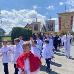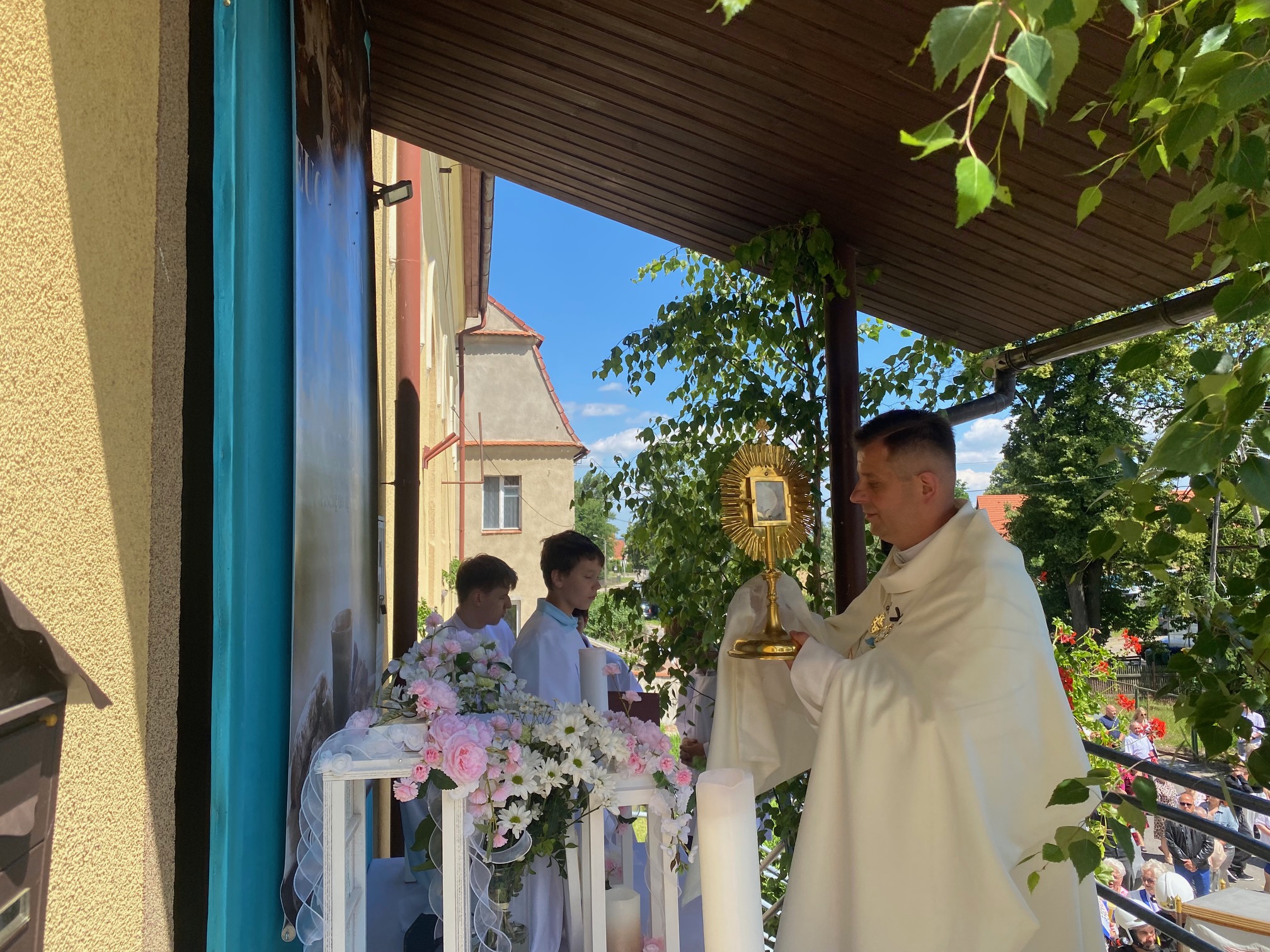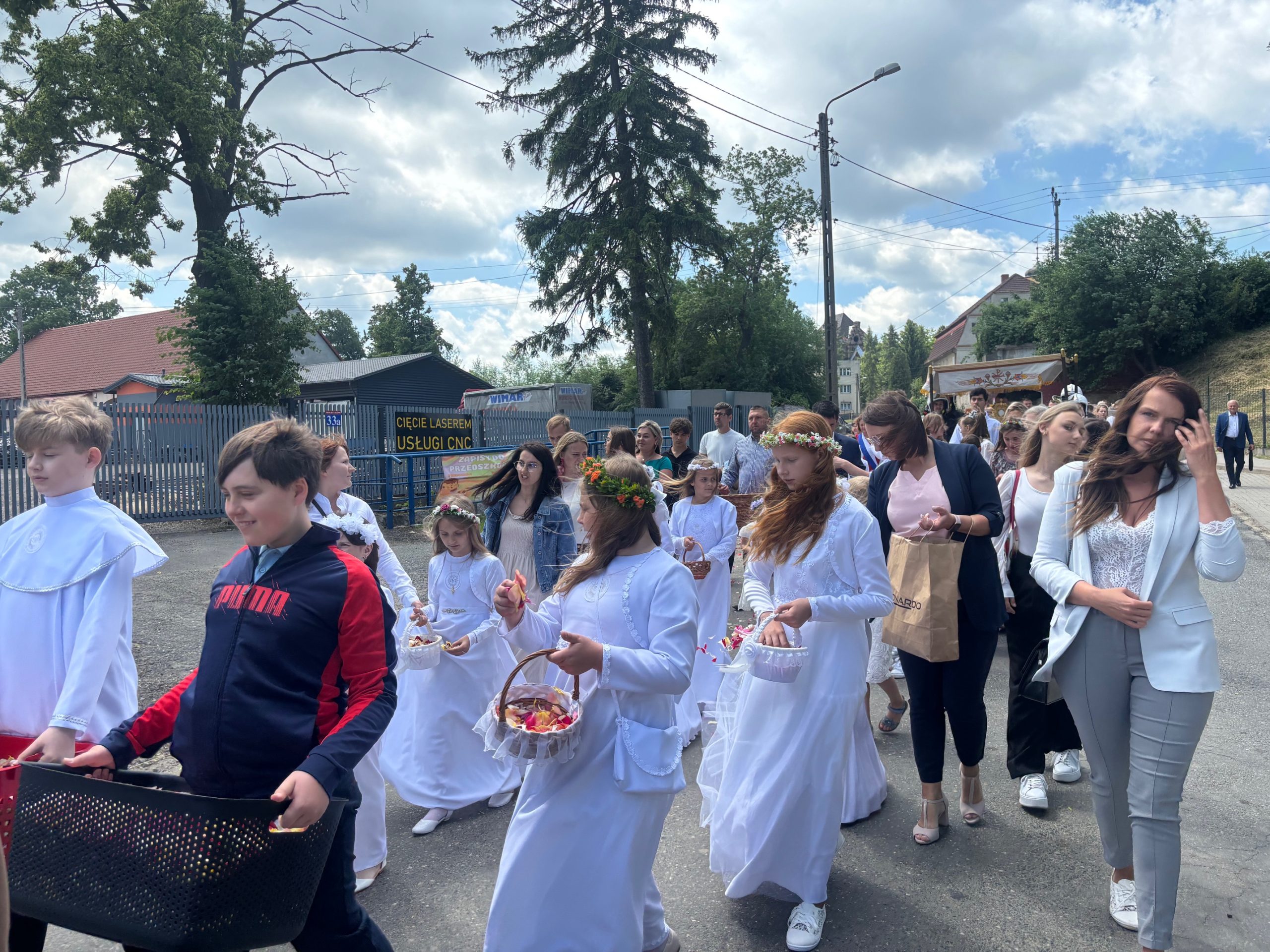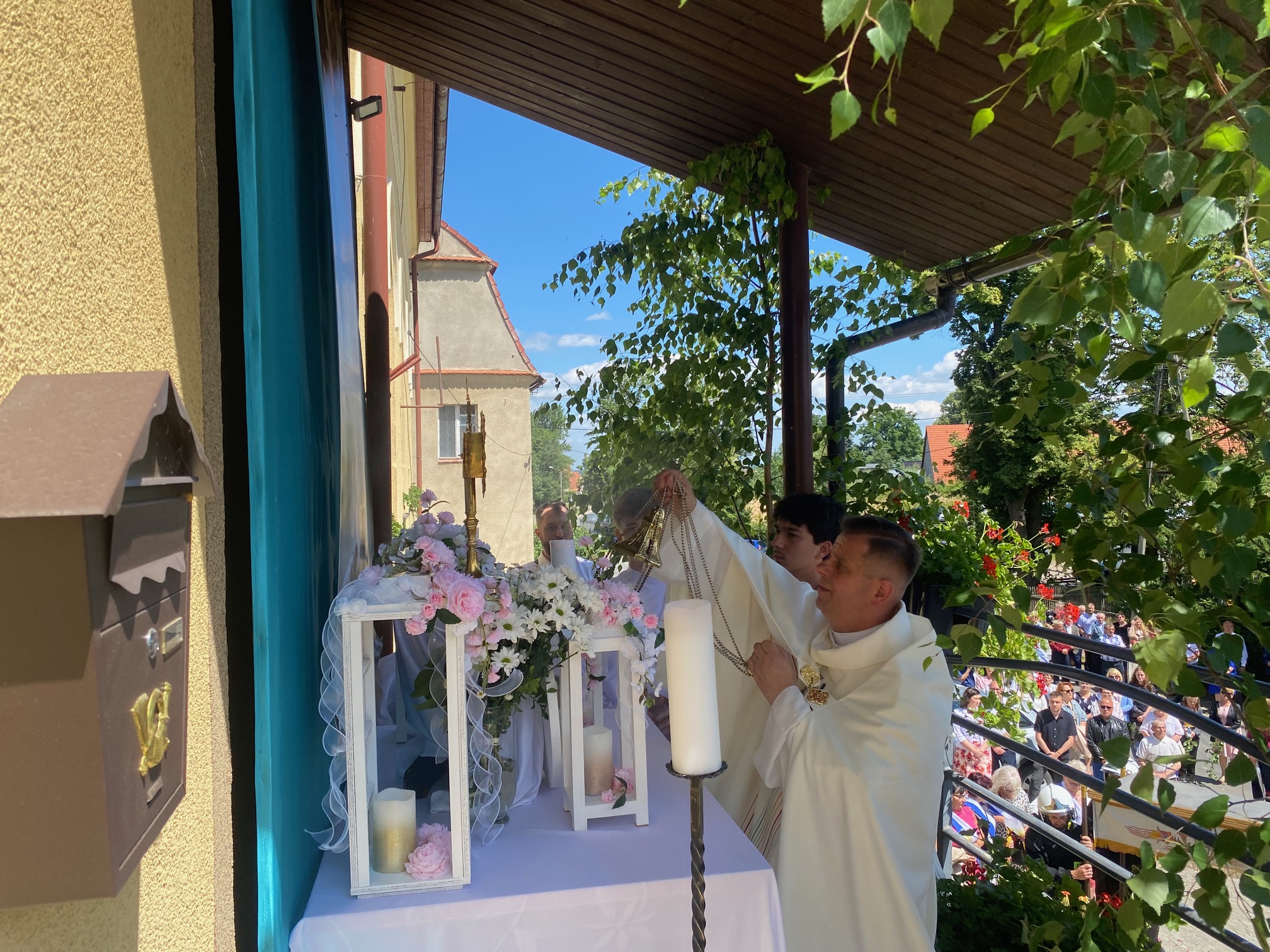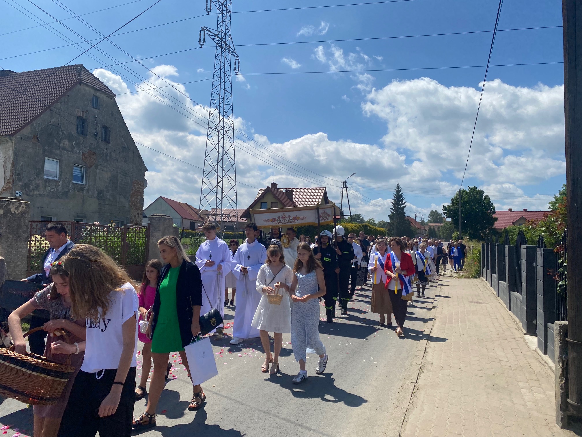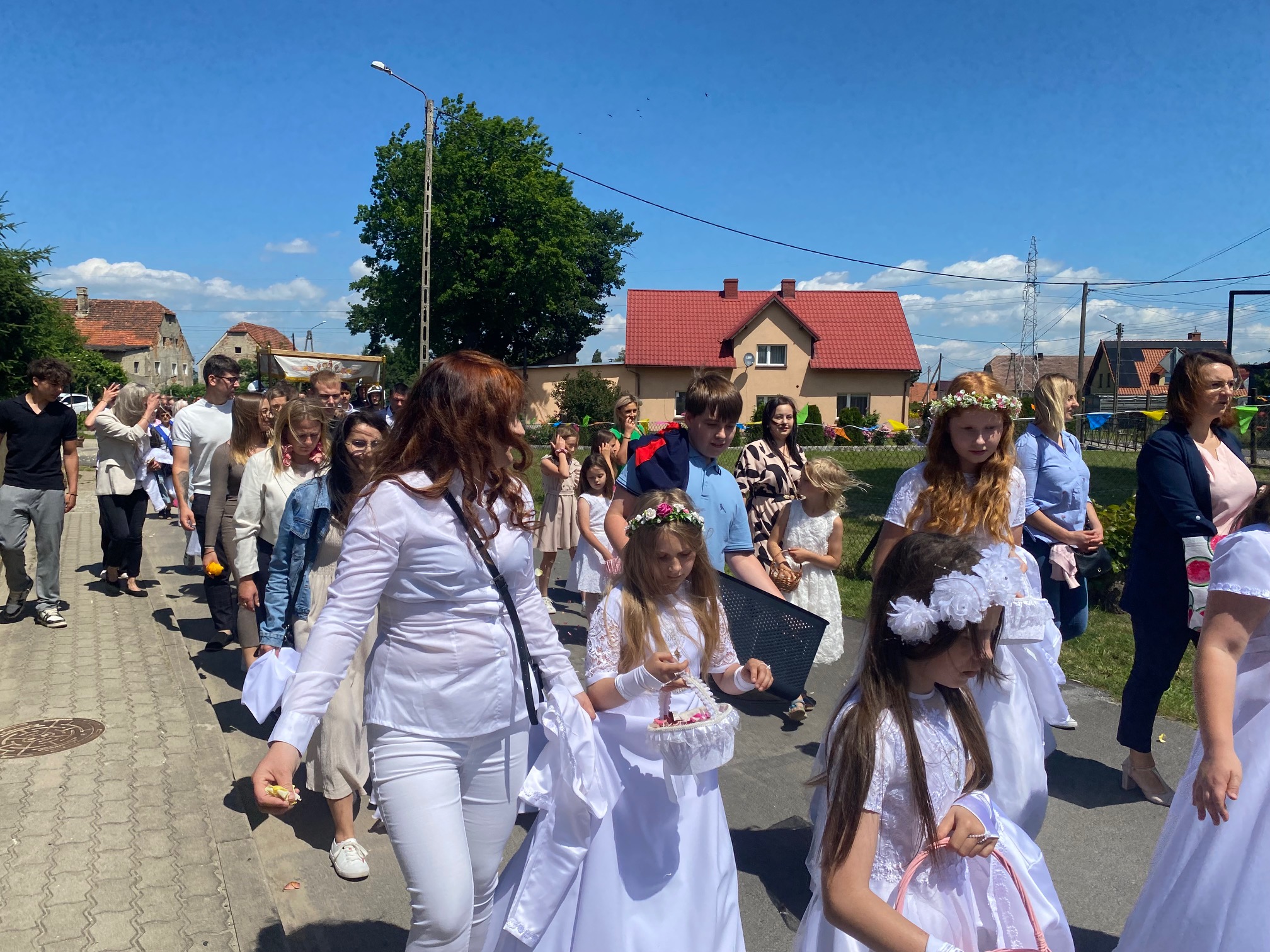 Aby świętować Uroczystość Najświętszego Ciała i Krwi Chrystusa, czyli wyruszyć w procesji eucharystycznej, prosząc Jezusa, by pobłogosławił parafię, potrzeba pracy. Pracę, którą rozpoczęli przedstawiciele grup parafialnych w środę po południu należy widzieć nie tylko jako zadanie „by było ładnie, bezpiecznie”, ale jako świadectwo. Pani Agnieszka, pytana w środę na przygotowaniu ołtarzy dlaczego przyszła, odpowiedziała bez namysłu: „Tak mi serce podpowiada, by tu być i swoją pracą wyrazić moją miłość do Jezusa”. W czwartek o godzinie 10.30 rozpoczęła się Msza Święta. W kazaniu ks. Marcin zachęcił do miłości do Eucharystii, przejawiającej się w chodzeniu na Mszę św. i na adorację w ciągu dnia. Kapłan prosił: chodźmy do kościoła jak najczęściej, mimo pracy, aby przyjąć Jezusa w Komunii św. Bo On czeka na nas każdego dnia. Niech nie czeka nadaremnie! Po Mszy św. z kościoła wyruszyła procesja, wraz z dziećmi obchodzącymi w tym uroczystym dniu swoją Pierwszą Rocznicę Komunii Świętej oraz ich rodzicami. W tym roku procesja do czterech ołtarzy wyszła poza mury kościoła, w stronę Dolnego Mokrzeszowa. Dziewczynki sypiące kwiaty, ministranci, lektorzy – piękne świadectwo miłości do Jezusa. Furorę na procesji zrobiła mała Julka, która z wielką uwagą sypała kwiaty. Ona tak wyznała wiarę. Uczestnicy procesji w skupieniu zatrzymywali się przy kolejnych ołtarzach, przy których następowało odczytanie fragmentów Ewangelii. Przy pierwszym z nich odczytywany jest fragment Ewangelii wg św. Mateusza o ostatniej wieczerzy, a więc nawiązujący do ustanowienia przez Jezusa Eucharystii. Drugi ołtarz jest związany z fragmentem Ewangelii wg św. Marka, dotyczącym rozmnożenia chleba. Przy trzecim ołtarzu odczytywany jest fragment Ewangelii wg św. Łukasza, który opowiada o zaproszonych na ucztę. Zaś ostatni, czwarty ołtarz związany jest z Ewangelią wg św. Jana i sakramentem zjednoczenia. Przy nim kapłan zachęcał do „zakochania się w Eucharystii” i na koniec podziękował za pomoc w przygotowaniu procesji.