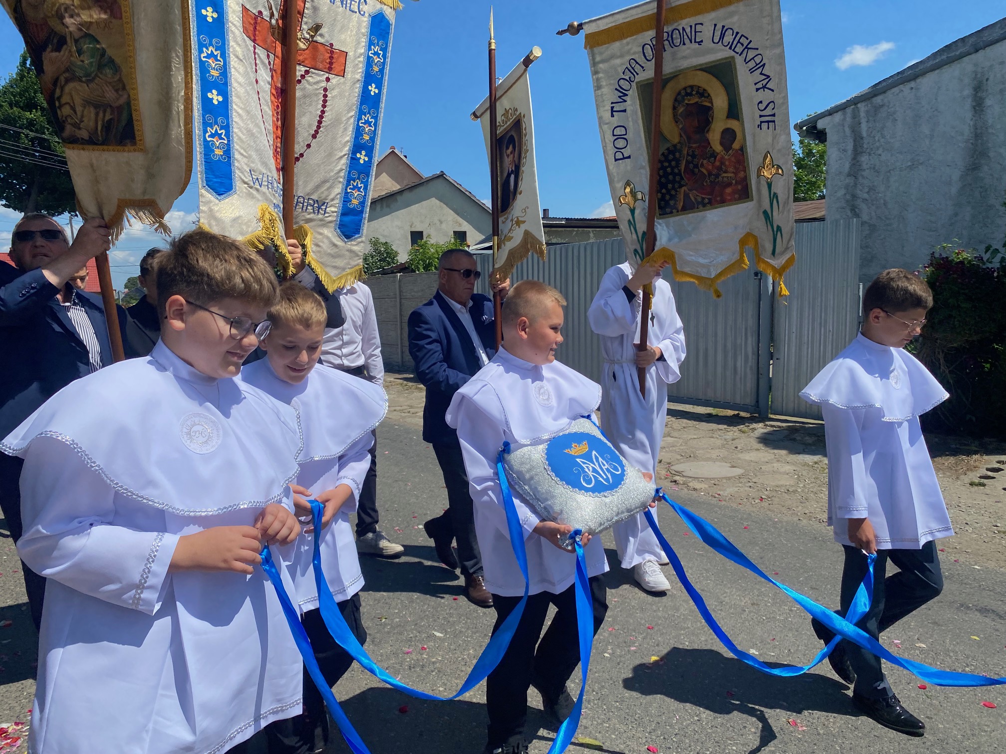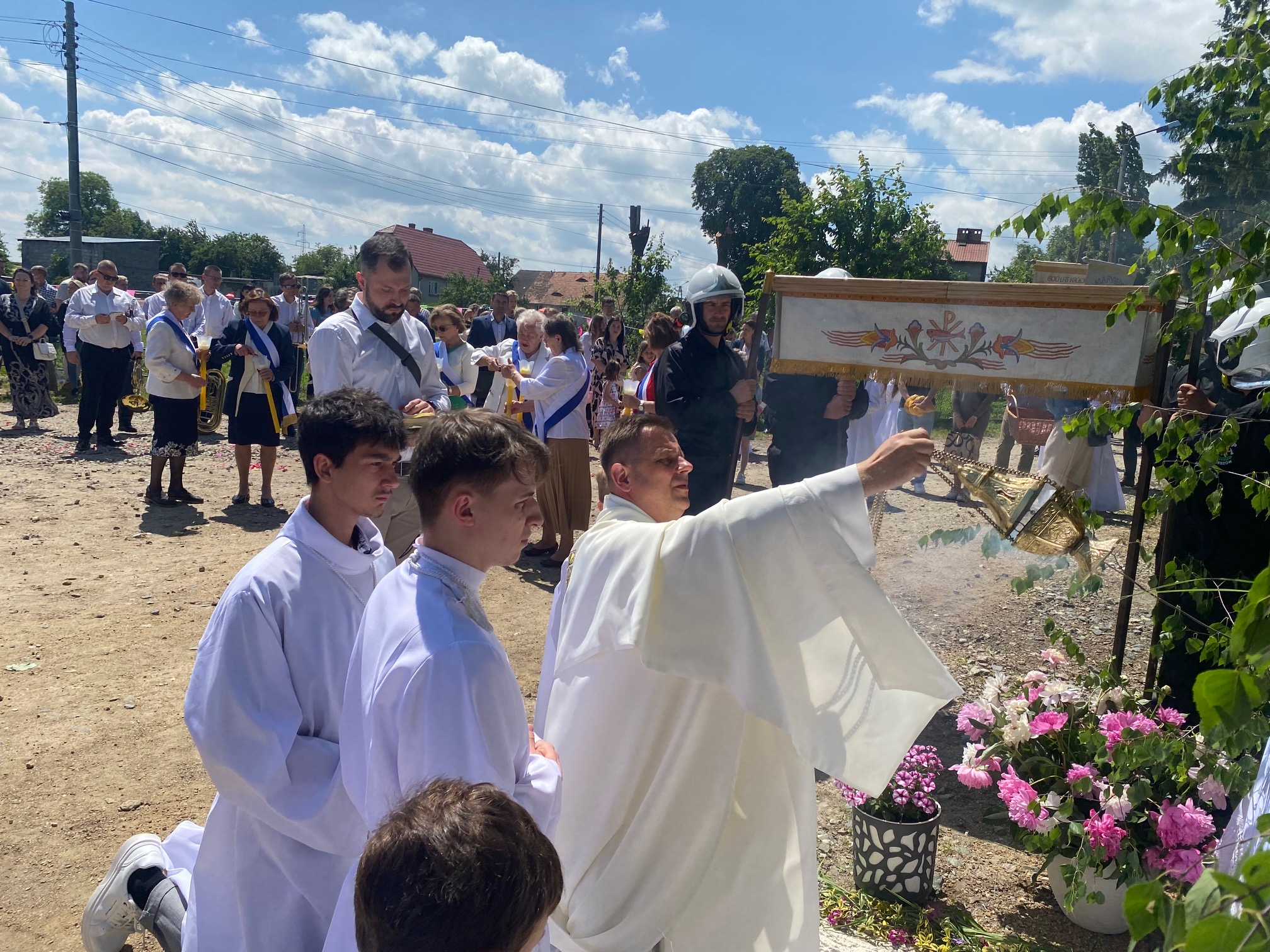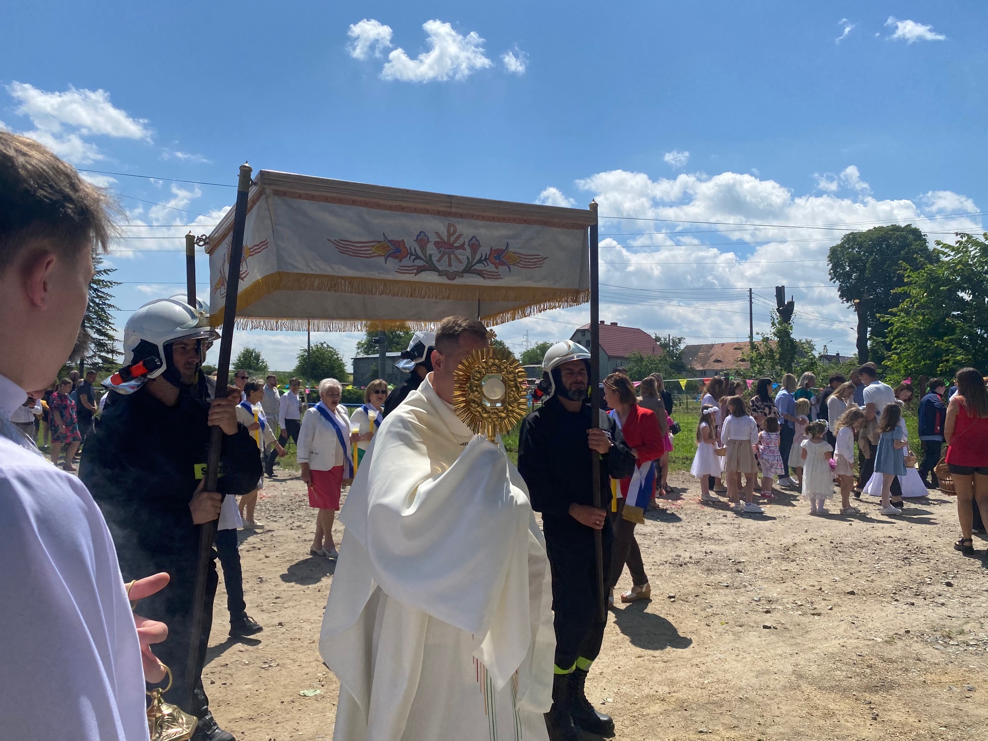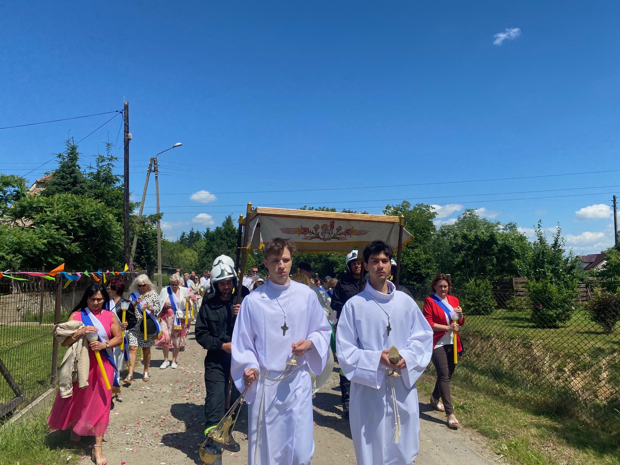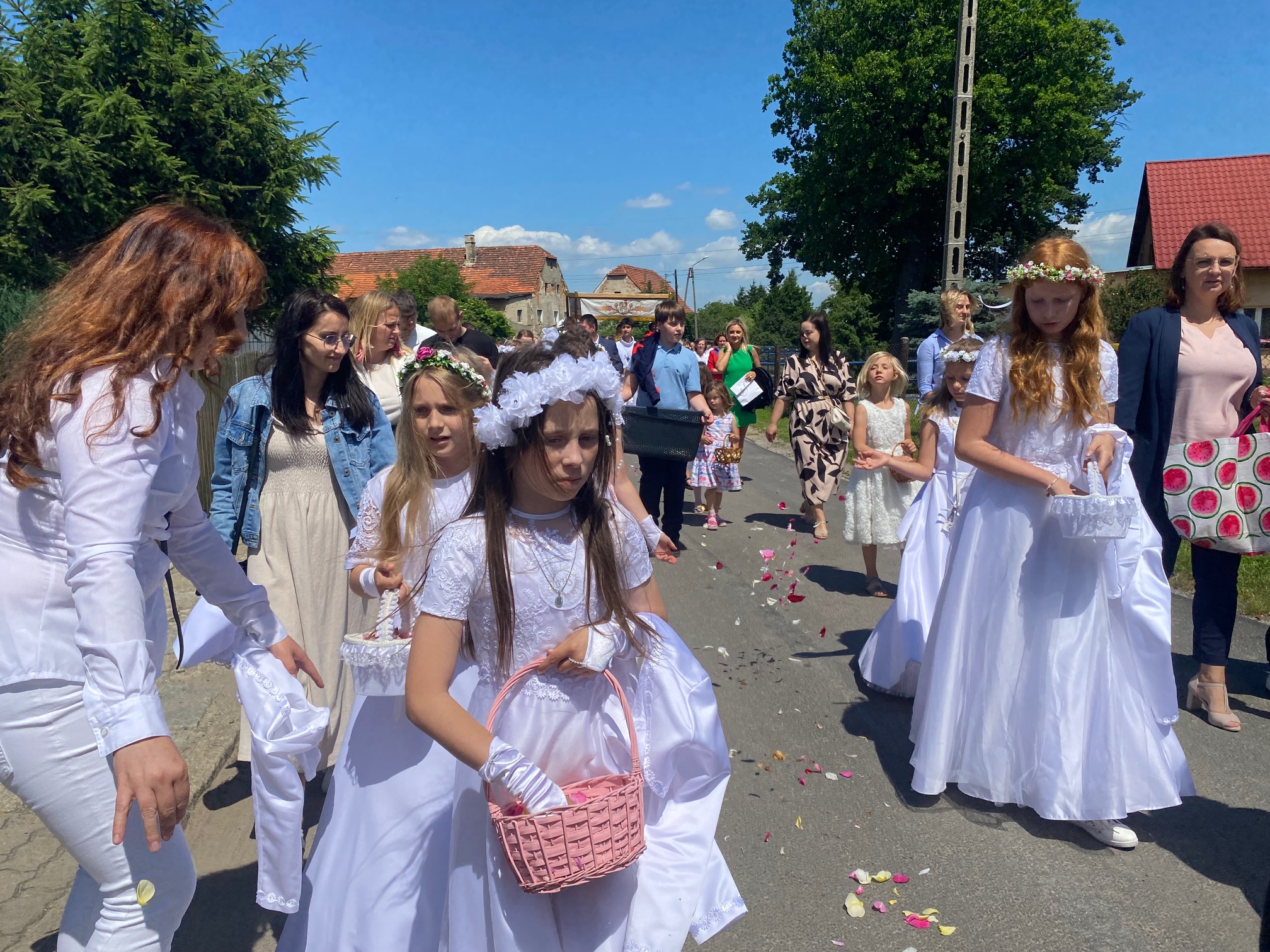Aby świętować Uroczystość Najświętszego Ciała i Krwi Chrystusa, czyli wyruszyć w procesji eucharystycznej, prosząc Jezusa, by pobłogosławił parafię, potrzeba pracy. Pracę, którą rozpoczęli przedstawiciele grup parafialnych w środę po południu należy widzieć nie tylko jako zadanie „by było ładnie, bezpiecznie”, ale jako świadectwo. Pani Agnieszka, pytana w środę na przygotowaniu ołtarzy dlaczego przyszła, odpowiedziała bez namysłu: „Tak mi serce podpowiada, by tu być i swoją pracą wyrazić moją miłość do Jezusa”. W czwartek o godzinie 10.30 rozpoczęła się Msza Święta. W kazaniu ks. Marcin zachęcił do miłości do Eucharystii, przejawiającej się w chodzeniu na Mszę św. i na adorację w ciągu dnia. Kapłan prosił: chodźmy do kościoła jak najczęściej, mimo pracy, aby przyjąć Jezusa w Komunii św. Bo On czeka na nas każdego dnia. Niech nie czeka nadaremnie! Po Mszy św. z kościoła wyruszyła procesja, wraz z dziećmi obchodzącymi w tym uroczystym dniu swoją Pierwszą Rocznicę Komunii Świętej oraz ich rodzicami. W tym roku procesja do czterech ołtarzy wyszła poza mury kościoła, w stronę Dolnego Mokrzeszowa. Dziewczynki sypiące kwiaty, ministranci, lektorzy – piękne świadectwo miłości do Jezusa. Furorę na procesji zrobiła mała Julka, która z wielką uwagą sypała kwiaty. Ona tak wyznała wiarę. Uczestnicy procesji w skupieniu zatrzymywali się przy kolejnych ołtarzach, przy których następowało odczytanie fragmentów Ewangelii. Przy pierwszym z nich odczytywany jest fragment Ewangelii wg św. Mateusza o ostatniej wieczerzy, a więc nawiązujący do ustanowienia przez Jezusa Eucharystii. Drugi ołtarz jest związany z fragmentem Ewangelii wg św. Marka, dotyczącym rozmnożenia chleba. Przy trzecim ołtarzu odczytywany jest fragment Ewangelii wg św. Łukasza, który opowiada o zaproszonych na ucztę. Zaś ostatni, czwarty ołtarz związany jest z Ewangelią wg św. Jana i sakramentem zjednoczenia. Przy nim kapłan zachęcał do „zakochania się w Eucharystii” i na koniec podziękował za pomoc w przygotowaniu procesji.