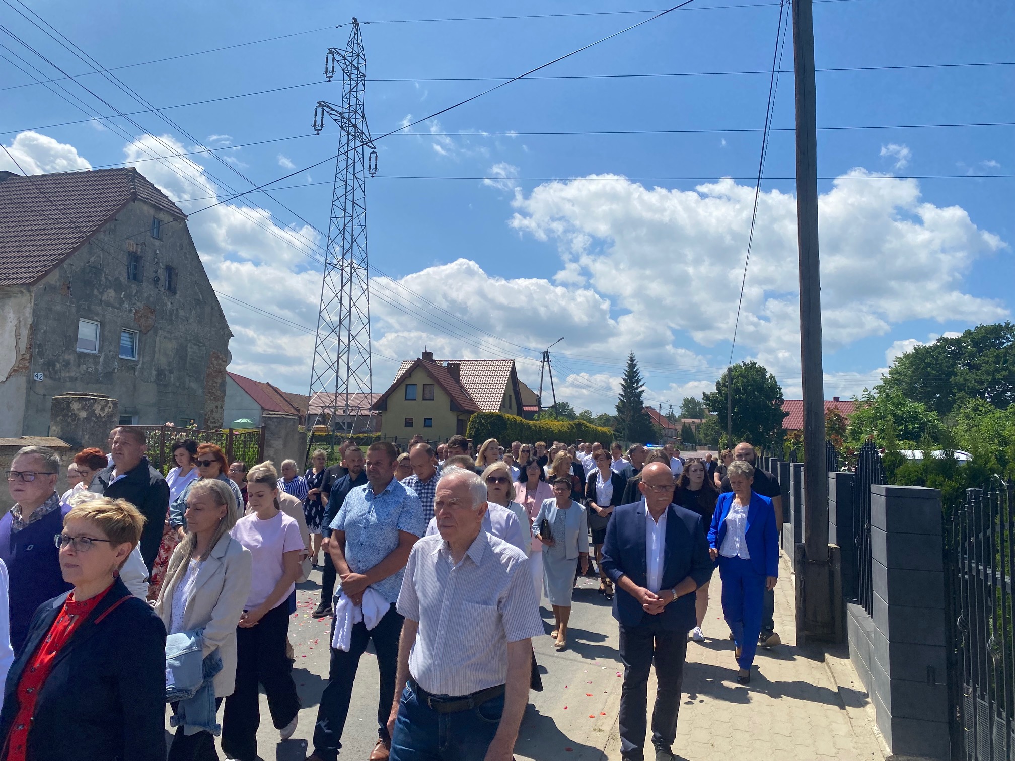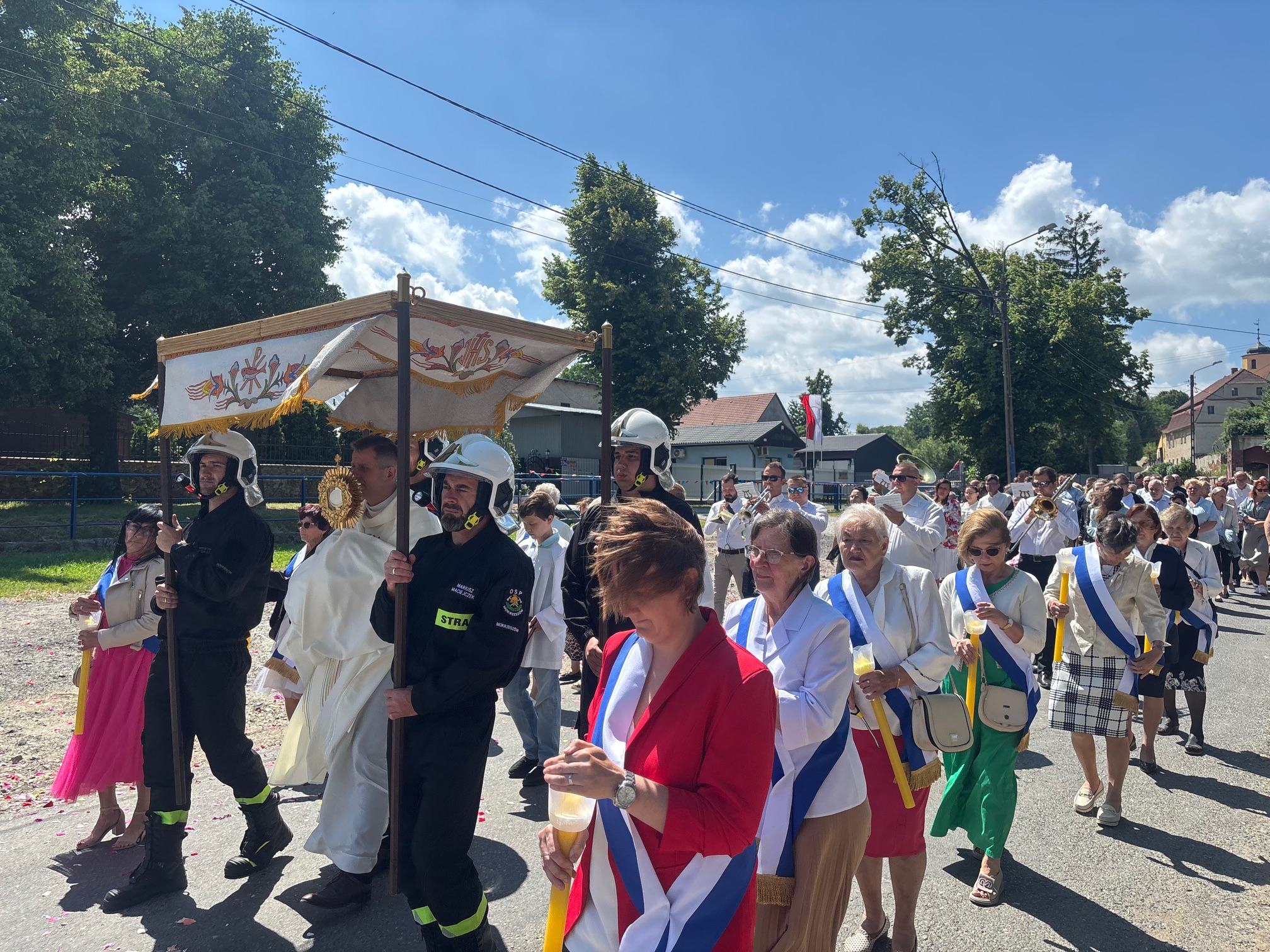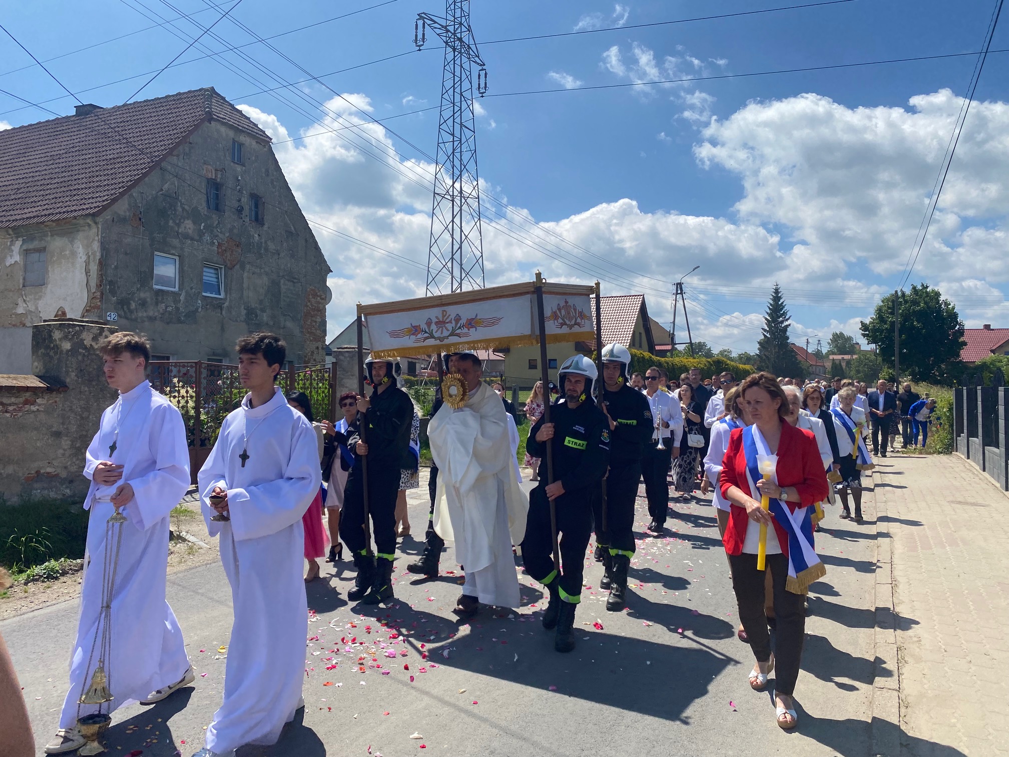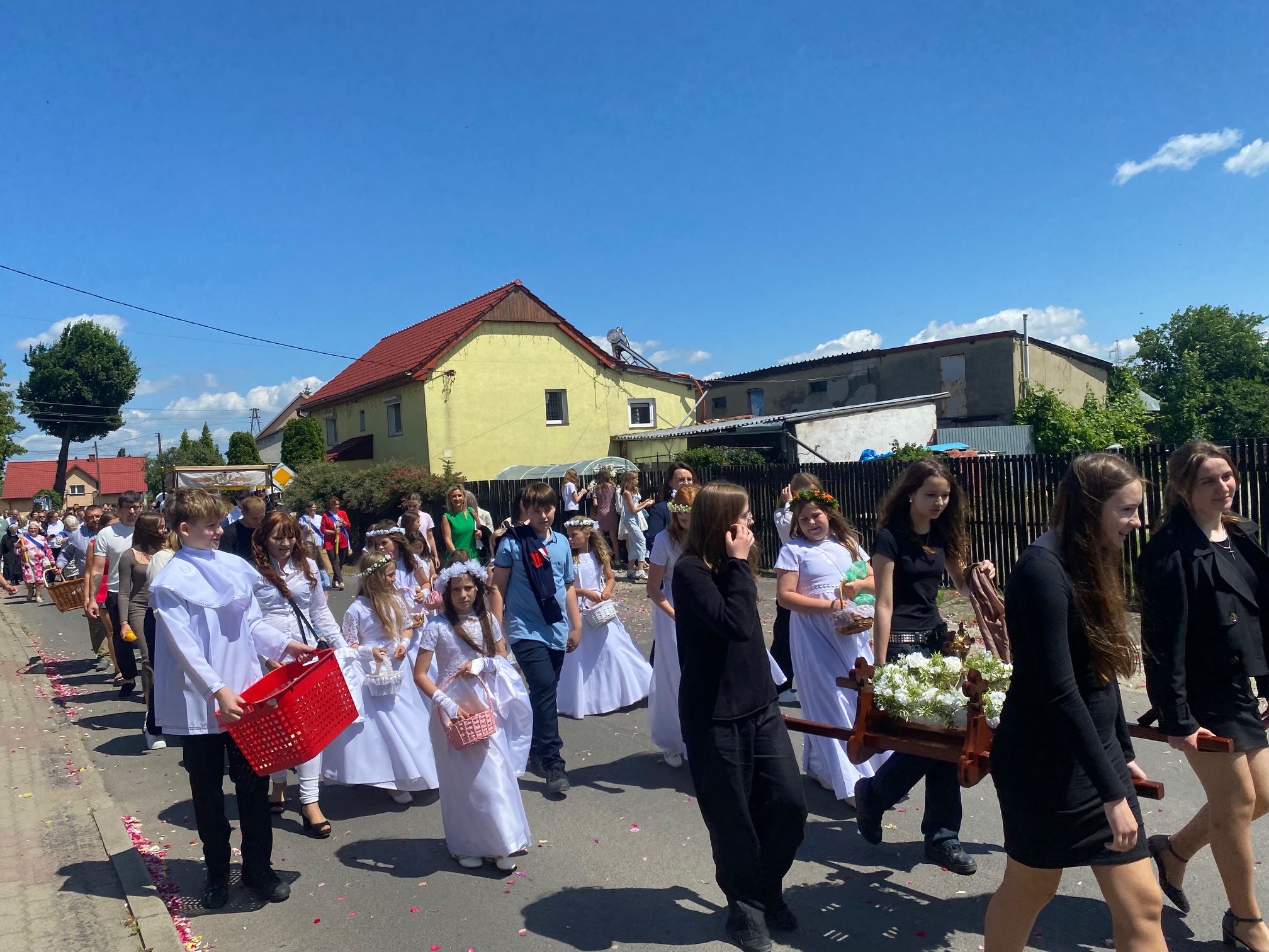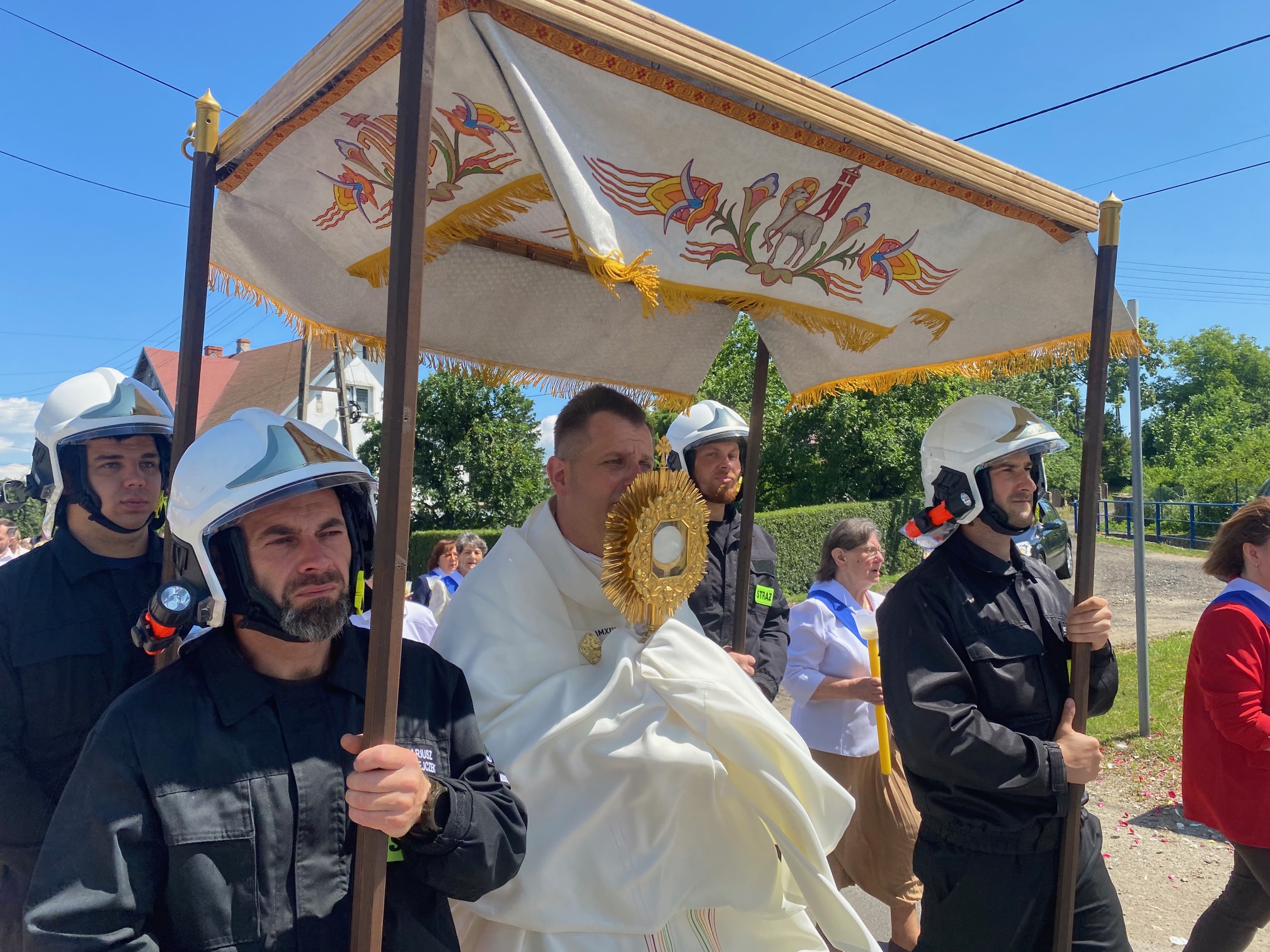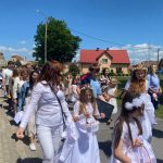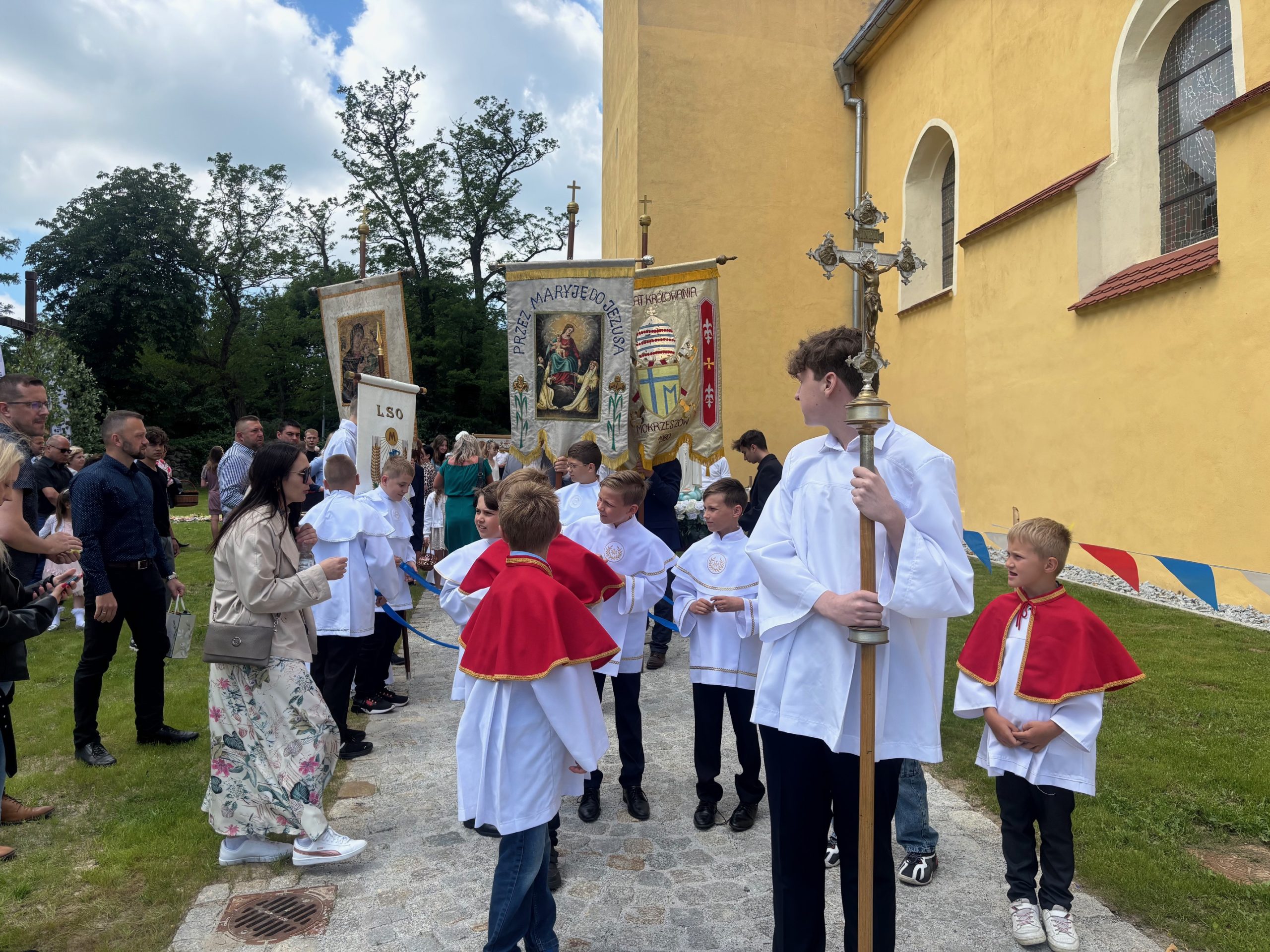 Aby świętować Uroczystość Najświętszego Ciała i Krwi Chrystusa, czyli wyruszyć w procesji eucharystycznej, prosząc Jezusa, by pobłogosławił parafię, potrzeba pracy. Pracę, którą rozpoczęli przedstawiciele grup parafialnych w środę po południu należy widzieć nie tylko jako zadanie „by było ładnie, bezpiecznie”, ale jako świadectwo. Pani Agnieszka, pytana w środę na przygotowaniu ołtarzy dlaczego przyszła, odpowiedziała bez namysłu: „Tak mi serce podpowiada, by tu być i swoją pracą wyrazić moją miłość do Jezusa”. W czwartek o godzinie 10.30 rozpoczęła się Msza Święta. W kazaniu ks. Marcin zachęcił do miłości do Eucharystii, przejawiającej się w chodzeniu na Mszę św. i na adorację w ciągu dnia. Kapłan prosił: chodźmy do kościoła jak najczęściej, mimo pracy, aby przyjąć Jezusa w Komunii św. Bo On czeka na nas każdego dnia. Niech nie czeka nadaremnie! Po Mszy św. z kościoła wyruszyła procesja, wraz z dziećmi obchodzącymi w tym uroczystym dniu swoją Pierwszą Rocznicę Komunii Świętej oraz ich rodzicami. W tym roku procesja do czterech ołtarzy wyszła poza mury kościoła, w stronę Dolnego Mokrzeszowa. Dziewczynki sypiące kwiaty, ministranci, lektorzy – piękne świadectwo miłości do Jezusa. Furorę na procesji zrobiła mała Julka, która z wielką uwagą sypała kwiaty. Ona tak wyznała wiarę. Uczestnicy procesji w skupieniu zatrzymywali się przy kolejnych ołtarzach, przy których następowało odczytanie fragmentów Ewangelii. Przy pierwszym z nich odczytywany jest fragment Ewangelii wg św. Mateusza o ostatniej wieczerzy, a więc nawiązujący do ustanowienia przez Jezusa Eucharystii. Drugi ołtarz jest związany z fragmentem Ewangelii wg św. Marka, dotyczącym rozmnożenia chleba. Przy trzecim ołtarzu odczytywany jest fragment Ewangelii wg św. Łukasza, który opowiada o zaproszonych na ucztę. Zaś ostatni, czwarty ołtarz związany jest z Ewangelią wg św. Jana i sakramentem zjednoczenia. Przy nim kapłan zachęcał do „zakochania się w Eucharystii” i na koniec podziękował za pomoc w przygotowaniu procesji.