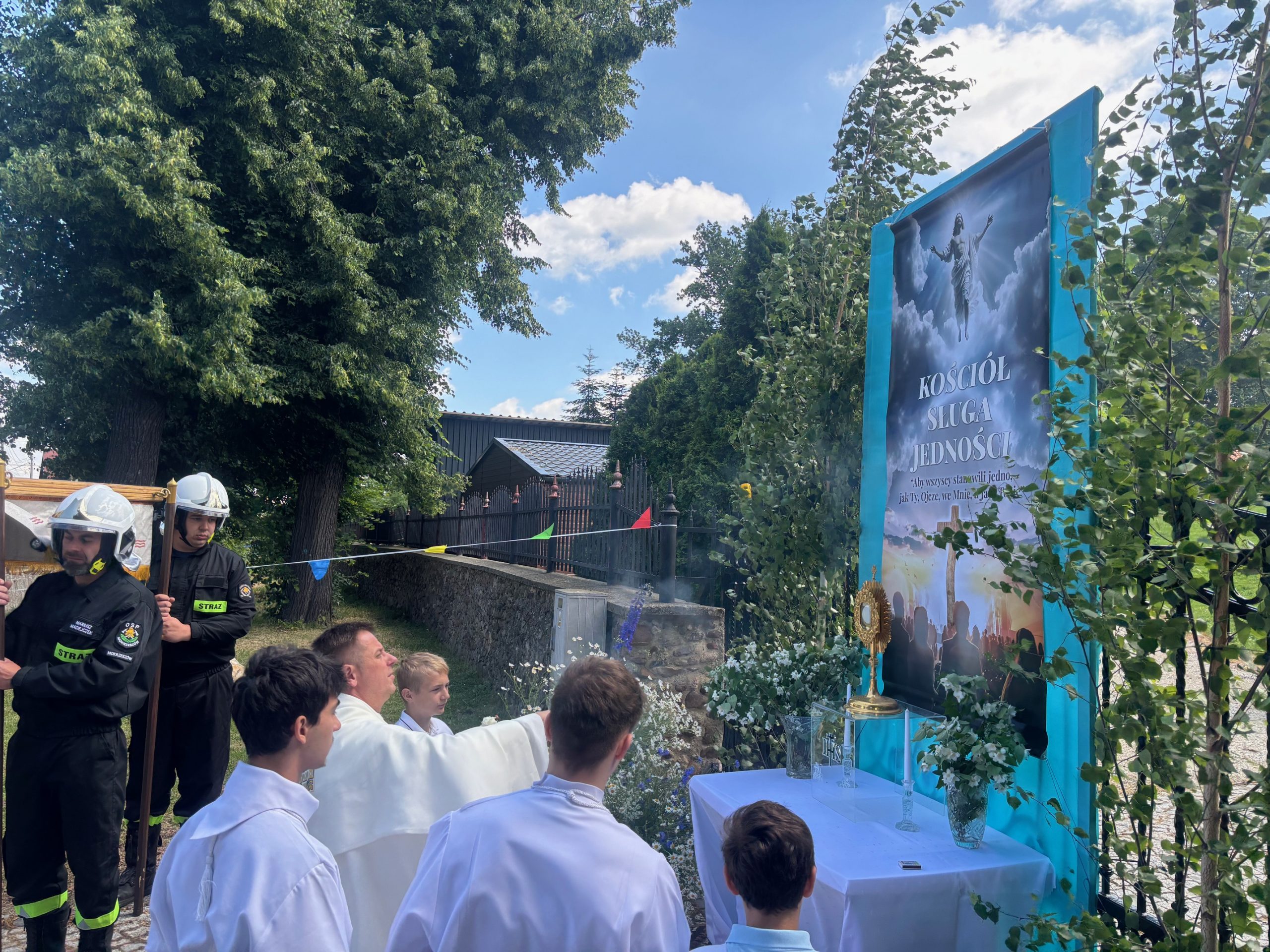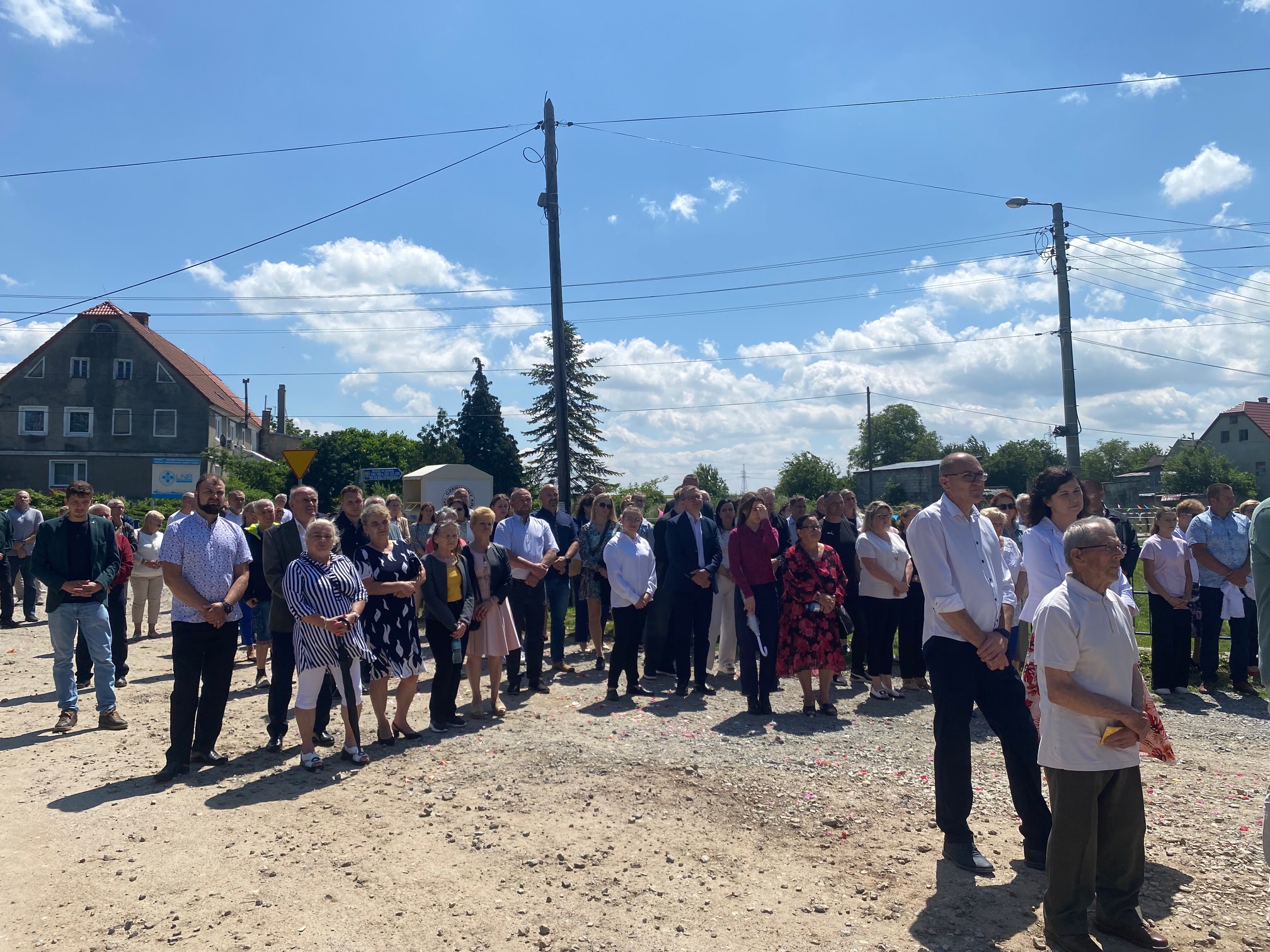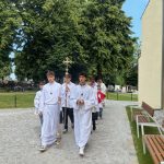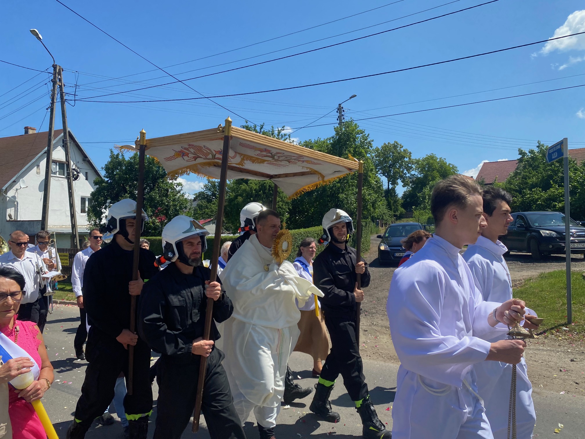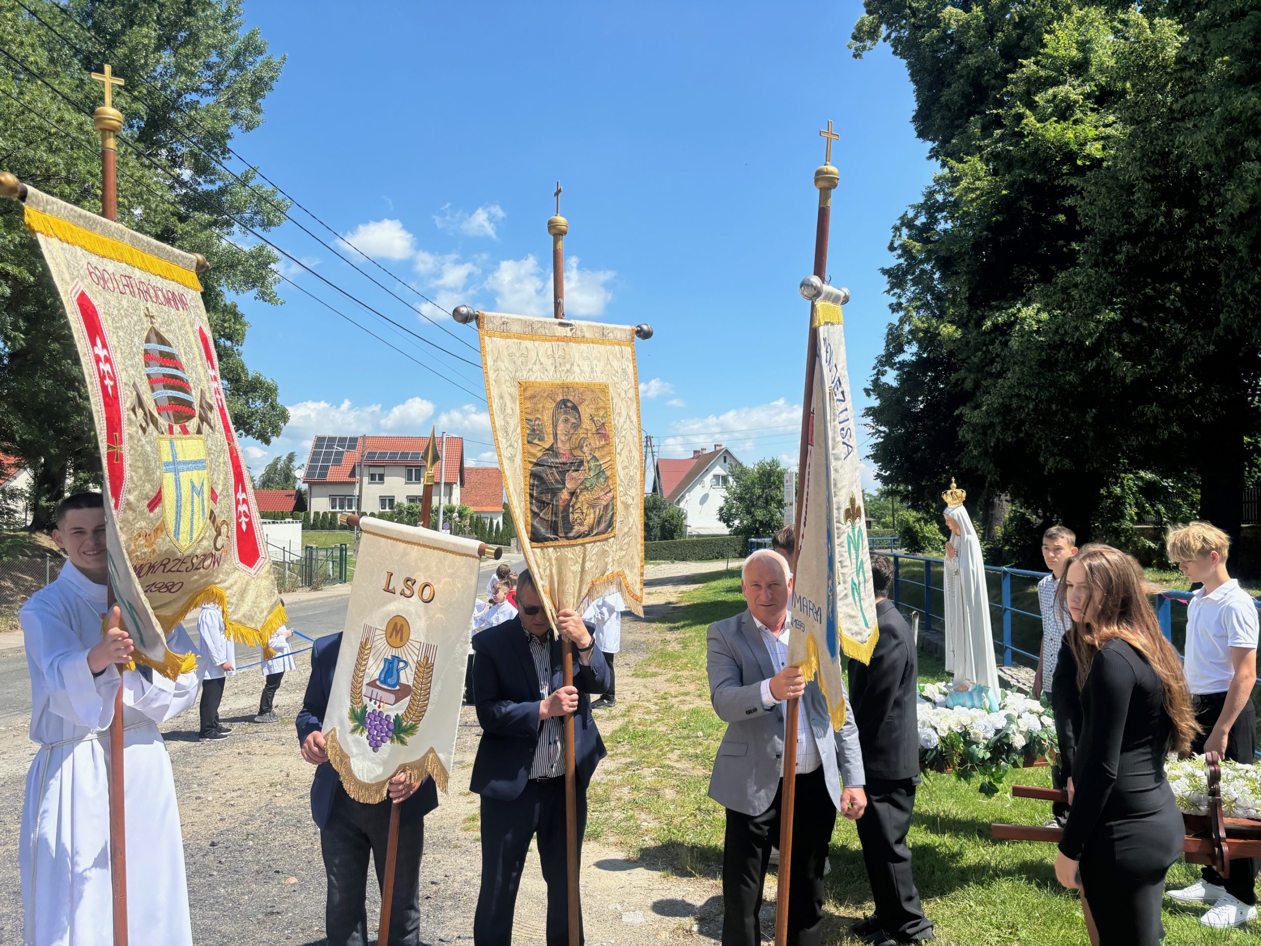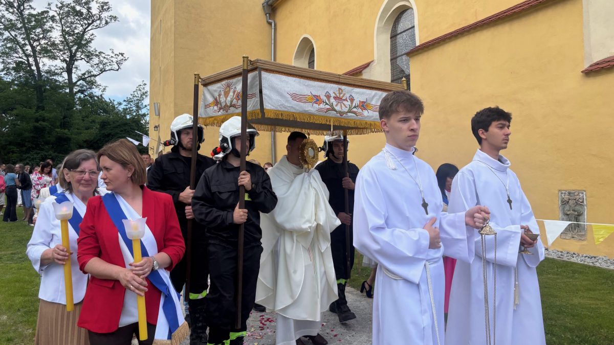 Aby świętować Uroczystość Najświętszego Ciała i Krwi Chrystusa, czyli wyruszyć w procesji eucharystycznej, prosząc Jezusa, by pobłogosławił parafię, potrzeba pracy. Pracę, którą rozpoczęli przedstawiciele grup parafialnych w środę po południu należy widzieć nie tylko jako zadanie „by było ładnie, bezpiecznie”, ale jako świadectwo. Pani Agnieszka, pytana w środę na przygotowaniu ołtarzy dlaczego przyszła, odpowiedziała bez namysłu: „Tak mi serce podpowiada, by tu być i swoją pracą wyrazić moją miłość do Jezusa”. W czwartek o godzinie 10.30 rozpoczęła się Msza Święta. W kazaniu ks. Marcin zachęcił do miłości do Eucharystii, przejawiającej się w chodzeniu na Mszę św. i na adorację w ciągu dnia. Kapłan prosił: chodźmy do kościoła jak najczęściej, mimo pracy, aby przyjąć Jezusa w Komunii św. Bo On czeka na nas każdego dnia. Niech nie czeka nadaremnie! Po Mszy św. z kościoła wyruszyła procesja, wraz z dziećmi obchodzącymi w tym uroczystym dniu swoją Pierwszą Rocznicę Komunii Świętej oraz ich rodzicami. W tym roku procesja do czterech ołtarzy wyszła poza mury kościoła, w stronę Dolnego Mokrzeszowa. Dziewczynki sypiące kwiaty, ministranci, lektorzy – piękne świadectwo miłości do Jezusa. Furorę na procesji zrobiła mała Julka, która z wielką uwagą sypała kwiaty. Ona tak wyznała wiarę. Uczestnicy procesji w skupieniu zatrzymywali się przy kolejnych ołtarzach, przy których następowało odczytanie fragmentów Ewangelii. Przy pierwszym z nich odczytywany jest fragment Ewangelii wg św. Mateusza o ostatniej wieczerzy, a więc nawiązujący do ustanowienia przez Jezusa Eucharystii. Drugi ołtarz jest związany z fragmentem Ewangelii wg św. Marka, dotyczącym rozmnożenia chleba. Przy trzecim ołtarzu odczytywany jest fragment Ewangelii wg św. Łukasza, który opowiada o zaproszonych na ucztę. Zaś ostatni, czwarty ołtarz związany jest z Ewangelią wg św. Jana i sakramentem zjednoczenia. Przy nim kapłan zachęcał do „zakochania się w Eucharystii” i na koniec podziękował za pomoc w przygotowaniu procesji.