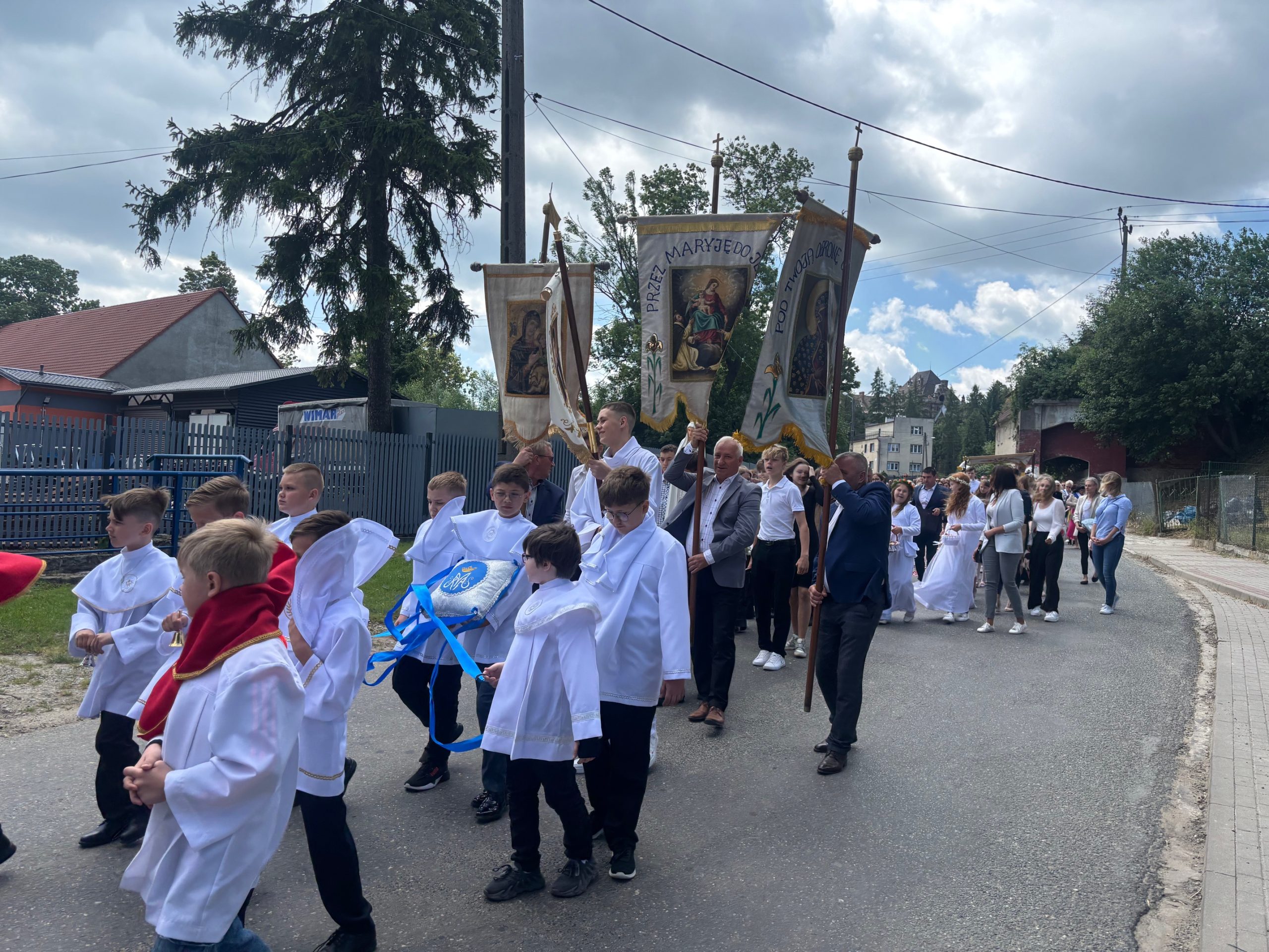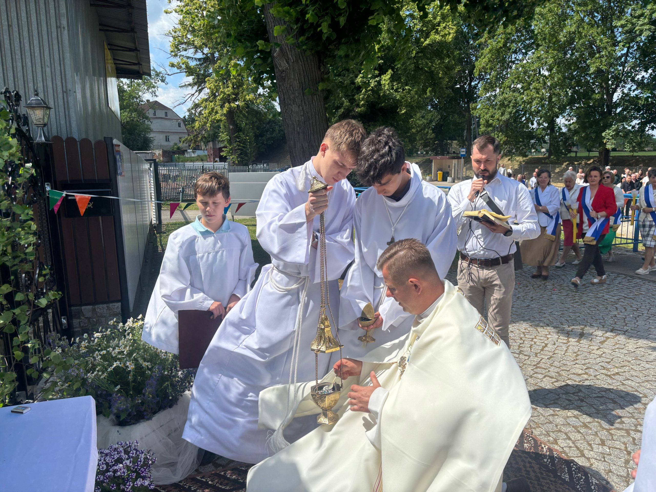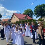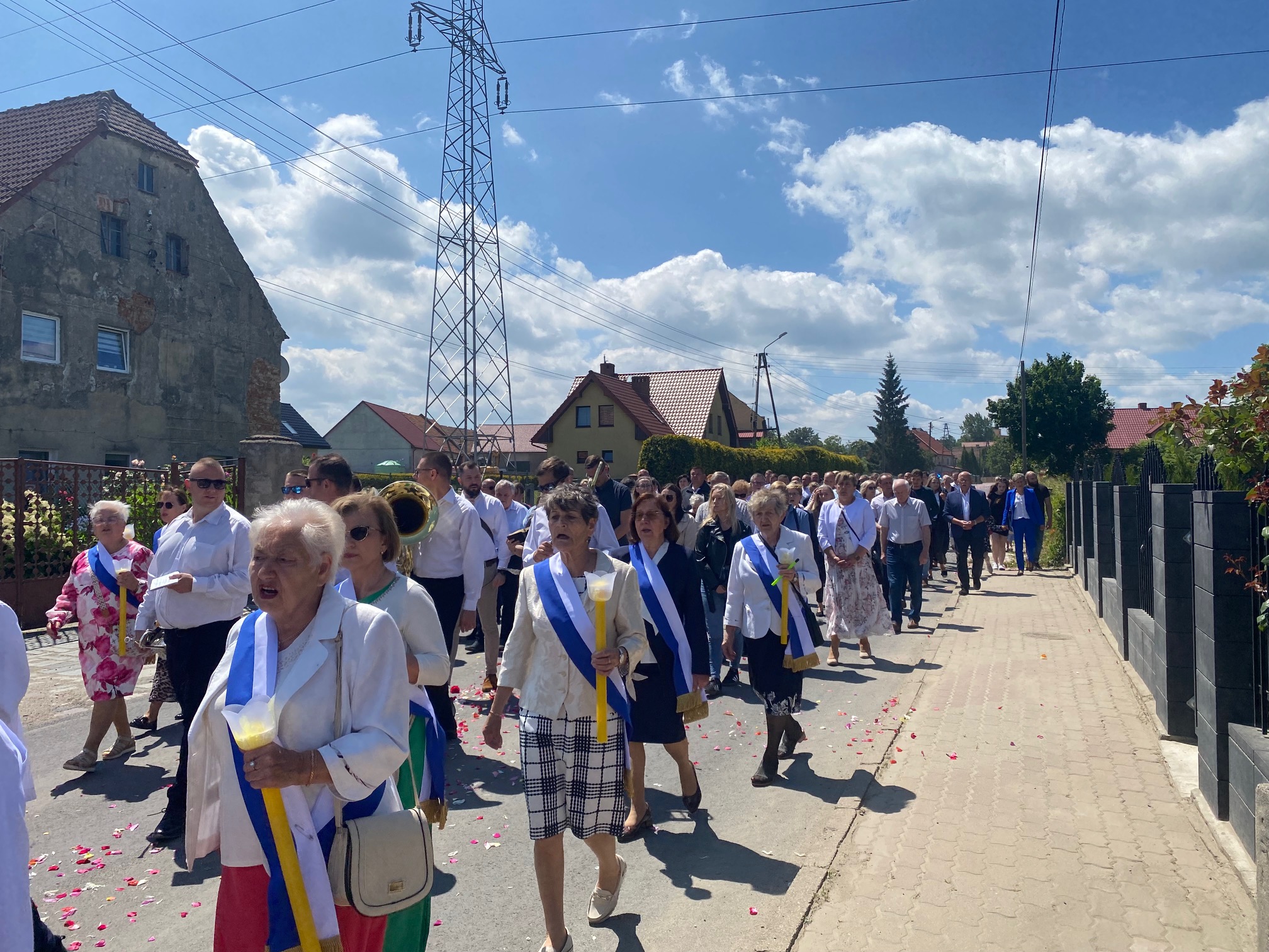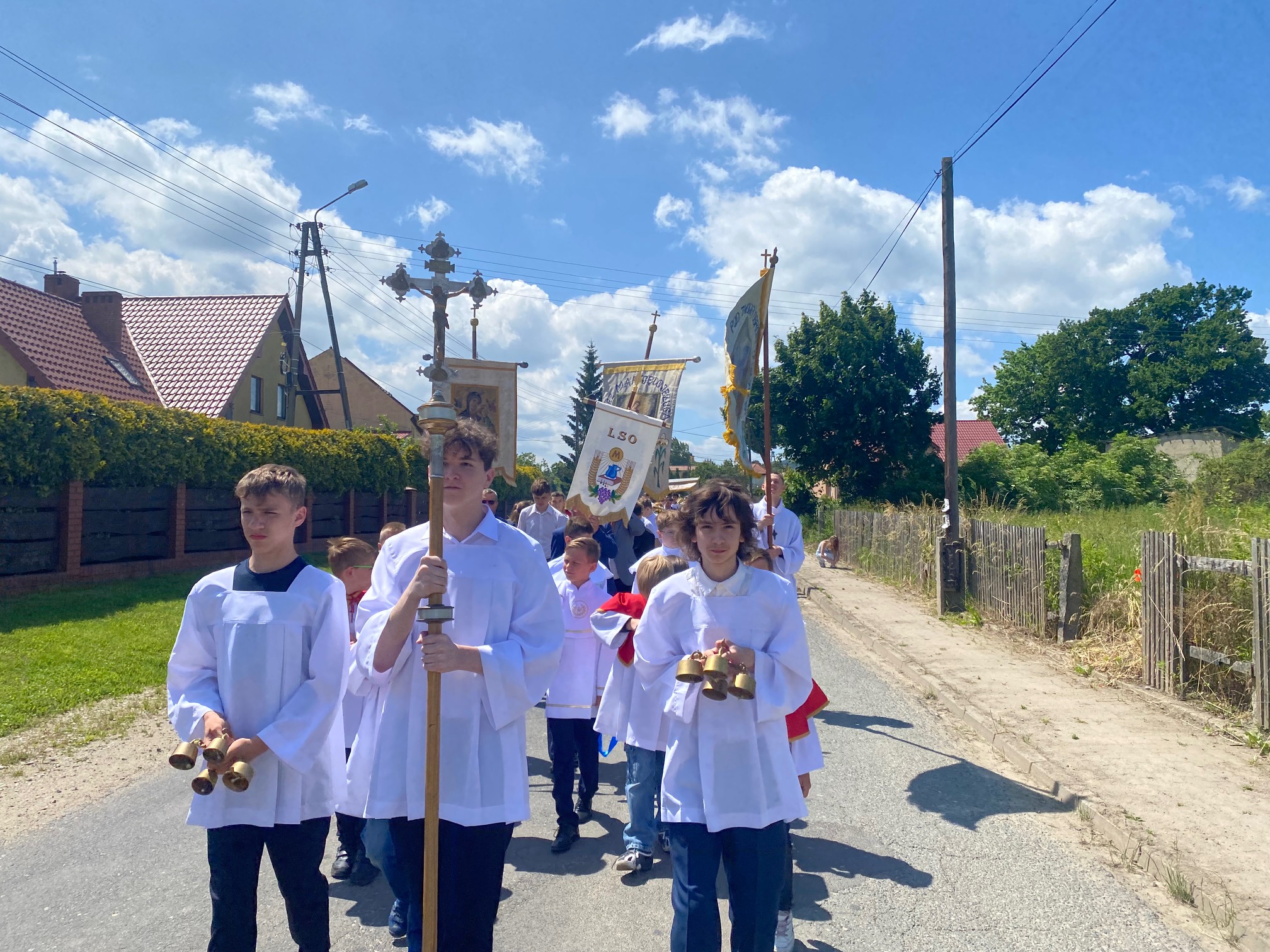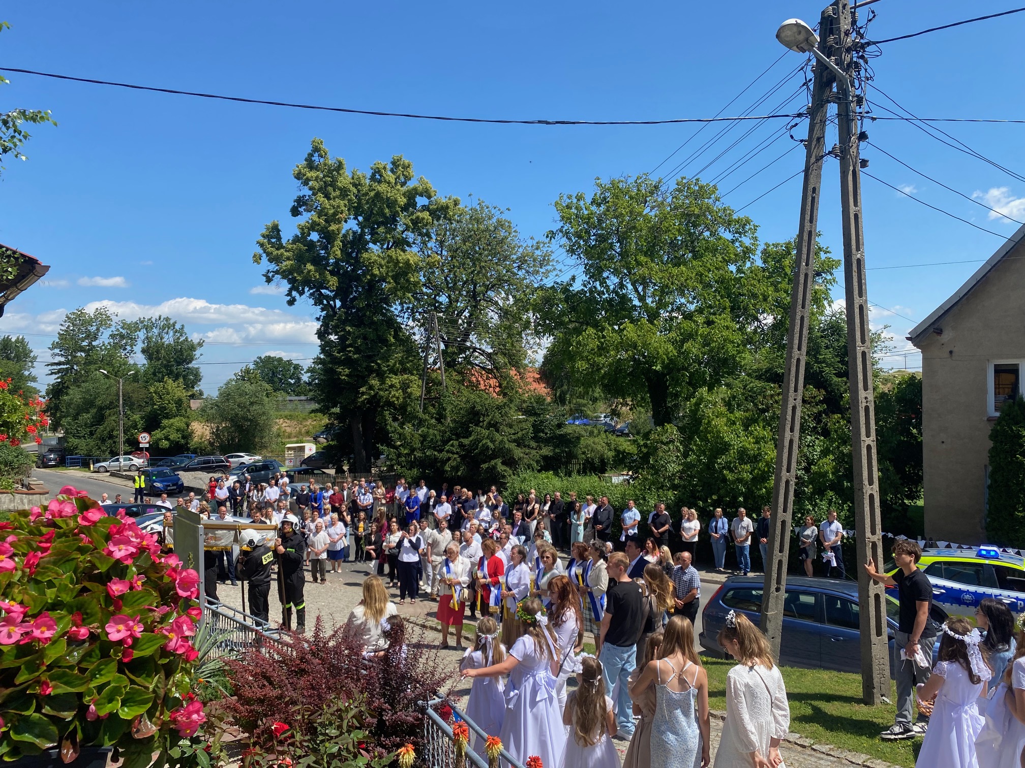 Aby świętować Uroczystość Najświętszego Ciała i Krwi Chrystusa, czyli wyruszyć w procesji eucharystycznej, prosząc Jezusa, by pobłogosławił parafię, potrzeba pracy. Pracę, którą rozpoczęli przedstawiciele grup parafialnych w środę po południu należy widzieć nie tylko jako zadanie „by było ładnie, bezpiecznie”, ale jako świadectwo. Pani Agnieszka, pytana w środę na przygotowaniu ołtarzy dlaczego przyszła, odpowiedziała bez namysłu: „Tak mi serce podpowiada, by tu być i swoją pracą wyrazić moją miłość do Jezusa”. W czwartek o godzinie 10.30 rozpoczęła się Msza Święta. W kazaniu ks. Marcin zachęcił do miłości do Eucharystii, przejawiającej się w chodzeniu na Mszę św. i na adorację w ciągu dnia. Kapłan prosił: chodźmy do kościoła jak najczęściej, mimo pracy, aby przyjąć Jezusa w Komunii św. Bo On czeka na nas każdego dnia. Niech nie czeka nadaremnie! Po Mszy św. z kościoła wyruszyła procesja, wraz z dziećmi obchodzącymi w tym uroczystym dniu swoją Pierwszą Rocznicę Komunii Świętej oraz ich rodzicami. W tym roku procesja do czterech ołtarzy wyszła poza mury kościoła, w stronę Dolnego Mokrzeszowa. Dziewczynki sypiące kwiaty, ministranci, lektorzy – piękne świadectwo miłości do Jezusa. Furorę na procesji zrobiła mała Julka, która z wielką uwagą sypała kwiaty. Ona tak wyznała wiarę. Uczestnicy procesji w skupieniu zatrzymywali się przy kolejnych ołtarzach, przy których następowało odczytanie fragmentów Ewangelii. Przy pierwszym z nich odczytywany jest fragment Ewangelii wg św. Mateusza o ostatniej wieczerzy, a więc nawiązujący do ustanowienia przez Jezusa Eucharystii. Drugi ołtarz jest związany z fragmentem Ewangelii wg św. Marka, dotyczącym rozmnożenia chleba. Przy trzecim ołtarzu odczytywany jest fragment Ewangelii wg św. Łukasza, który opowiada o zaproszonych na ucztę. Zaś ostatni, czwarty ołtarz związany jest z Ewangelią wg św. Jana i sakramentem zjednoczenia. Przy nim kapłan zachęcał do „zakochania się w Eucharystii” i na koniec podziękował za pomoc w przygotowaniu procesji.