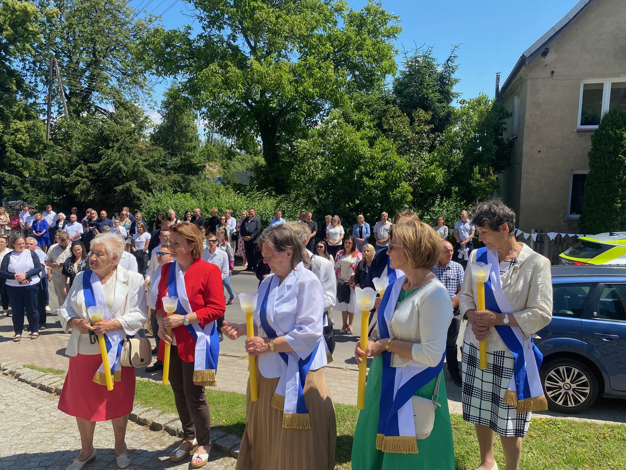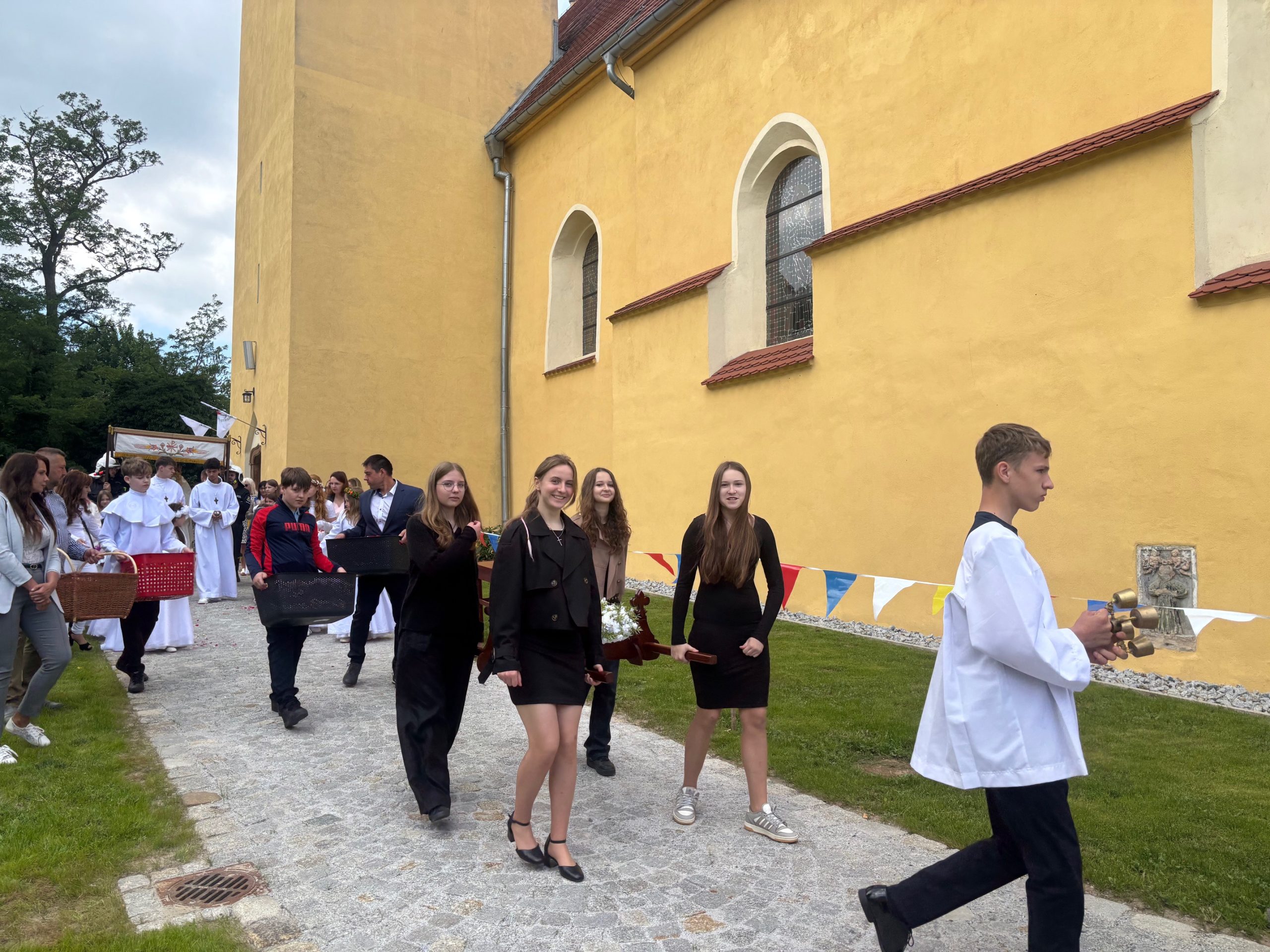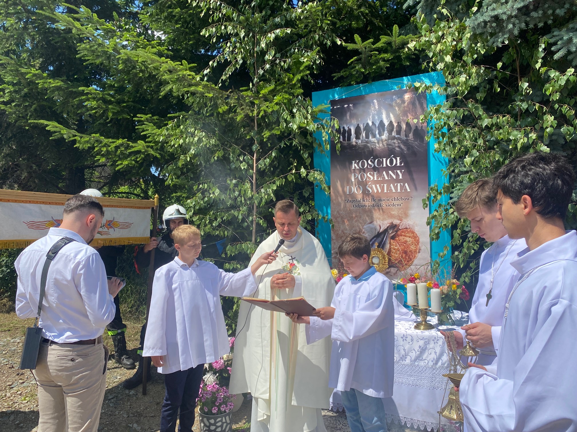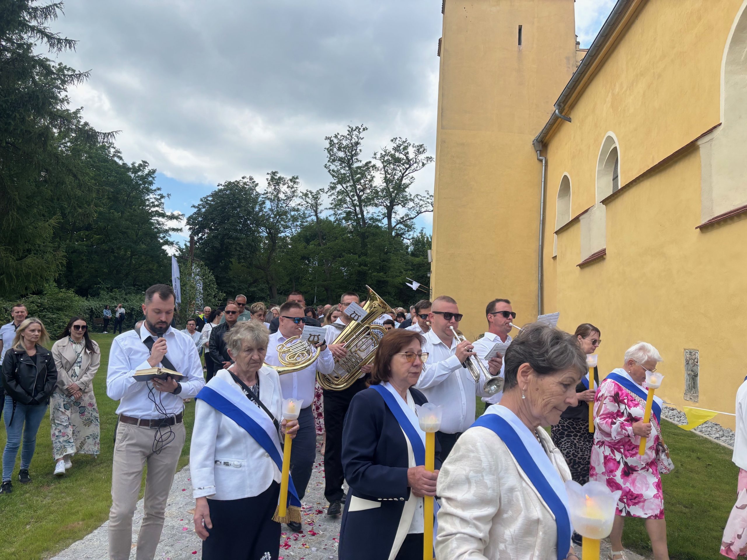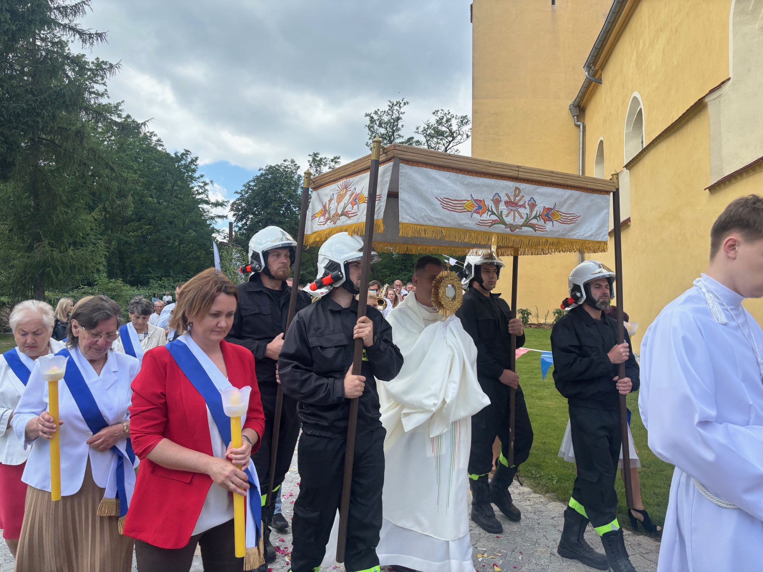 Aby świętować Uroczystość Najświętszego Ciała i Krwi Chrystusa, czyli wyruszyć w procesji eucharystycznej, prosząc Jezusa, by pobłogosławił parafię, potrzeba pracy. Pracę, którą rozpoczęli przedstawiciele grup parafialnych w środę po południu należy widzieć nie tylko jako zadanie „by było ładnie, bezpiecznie”, ale jako świadectwo. Pani Agnieszka, pytana w środę na przygotowaniu ołtarzy dlaczego przyszła, odpowiedziała bez namysłu: „Tak mi serce podpowiada, by tu być i swoją pracą wyrazić moją miłość do Jezusa”. W czwartek o godzinie 10.30 rozpoczęła się Msza Święta. W kazaniu ks. Marcin zachęcił do miłości do Eucharystii, przejawiającej się w chodzeniu na Mszę św. i na adorację w ciągu dnia. Kapłan prosił: chodźmy do kościoła jak najczęściej, mimo pracy, aby przyjąć Jezusa w Komunii św. Bo On czeka na nas każdego dnia. Niech nie czeka nadaremnie! Po Mszy św. z kościoła wyruszyła procesja, wraz z dziećmi obchodzącymi w tym uroczystym dniu swoją Pierwszą Rocznicę Komunii Świętej oraz ich rodzicami. W tym roku procesja do czterech ołtarzy wyszła poza mury kościoła, w stronę Dolnego Mokrzeszowa. Dziewczynki sypiące kwiaty, ministranci, lektorzy – piękne świadectwo miłości do Jezusa. Furorę na procesji zrobiła mała Julka, która z wielką uwagą sypała kwiaty. Ona tak wyznała wiarę. Uczestnicy procesji w skupieniu zatrzymywali się przy kolejnych ołtarzach, przy których następowało odczytanie fragmentów Ewangelii. Przy pierwszym z nich odczytywany jest fragment Ewangelii wg św. Mateusza o ostatniej wieczerzy, a więc nawiązujący do ustanowienia przez Jezusa Eucharystii. Drugi ołtarz jest związany z fragmentem Ewangelii wg św. Marka, dotyczącym rozmnożenia chleba. Przy trzecim ołtarzu odczytywany jest fragment Ewangelii wg św. Łukasza, który opowiada o zaproszonych na ucztę. Zaś ostatni, czwarty ołtarz związany jest z Ewangelią wg św. Jana i sakramentem zjednoczenia. Przy nim kapłan zachęcał do „zakochania się w Eucharystii” i na koniec podziękował za pomoc w przygotowaniu procesji.