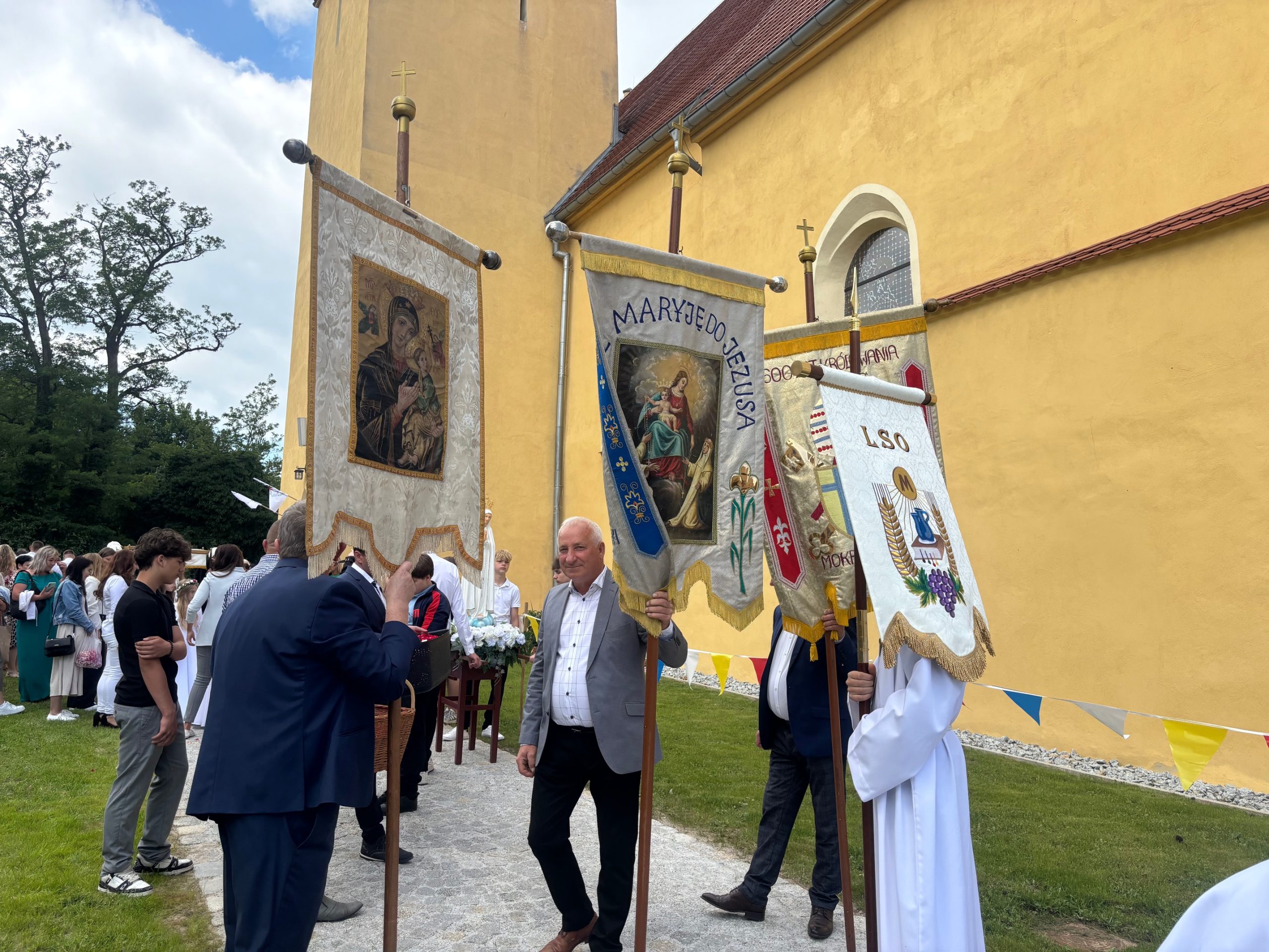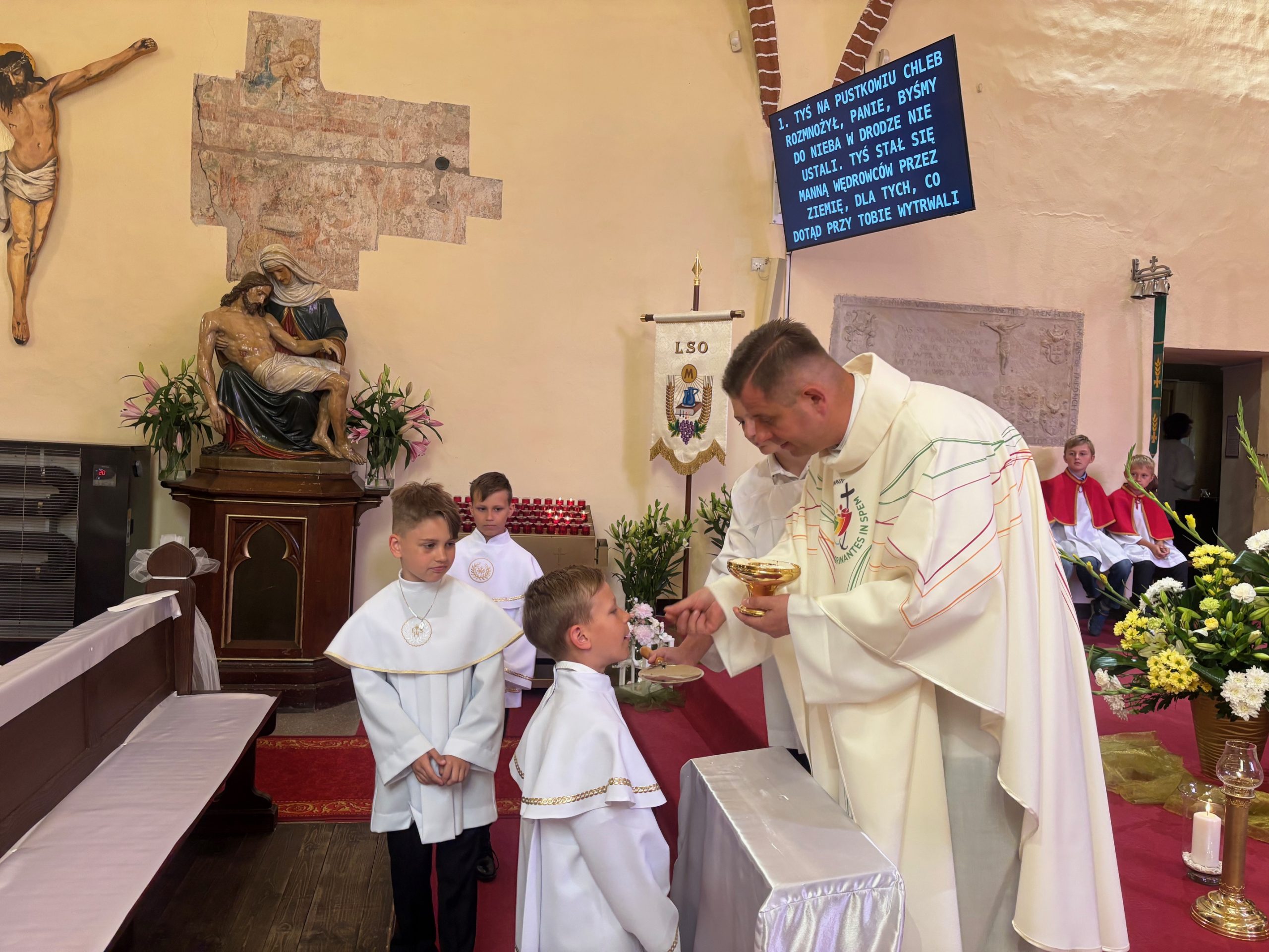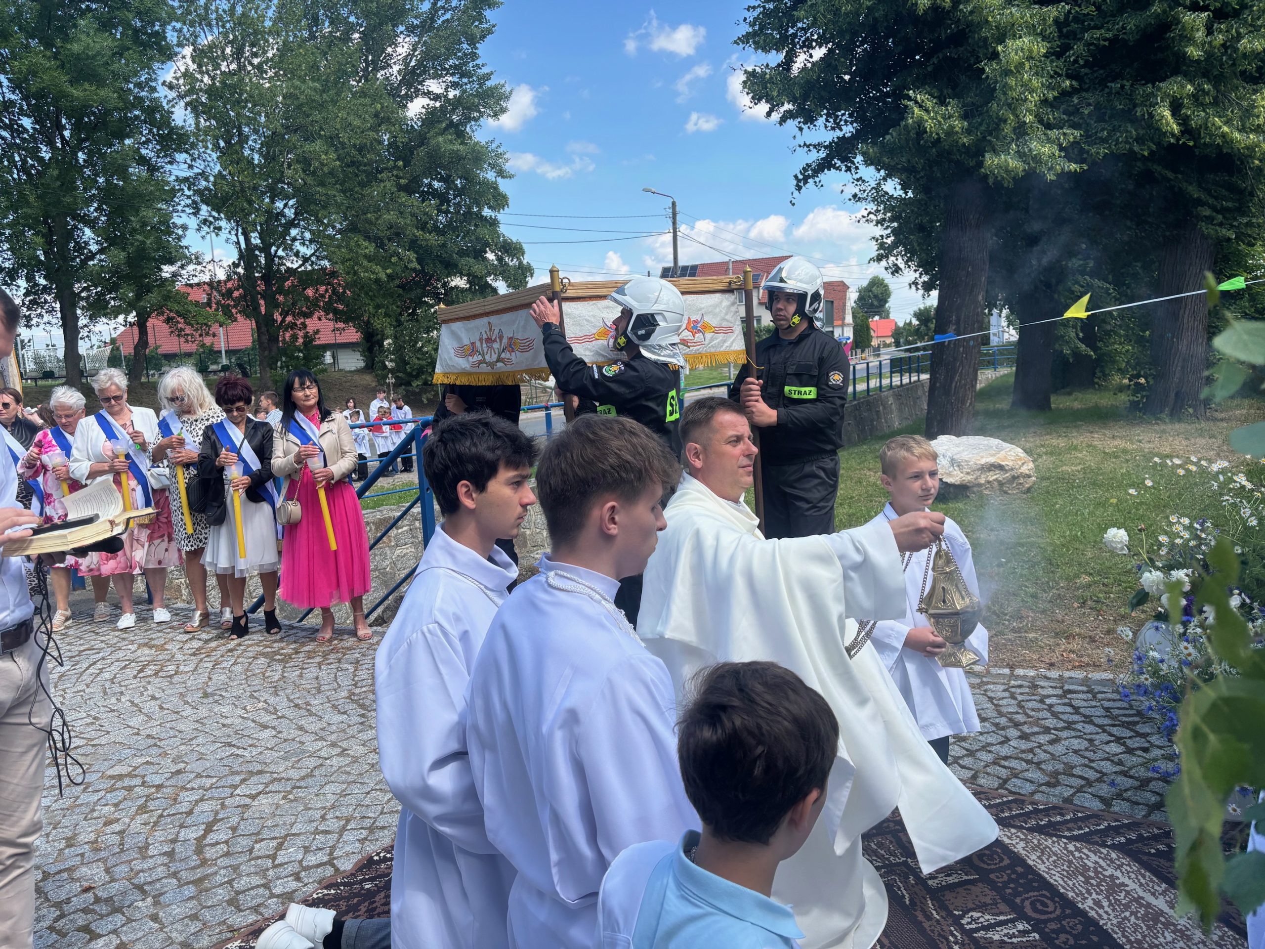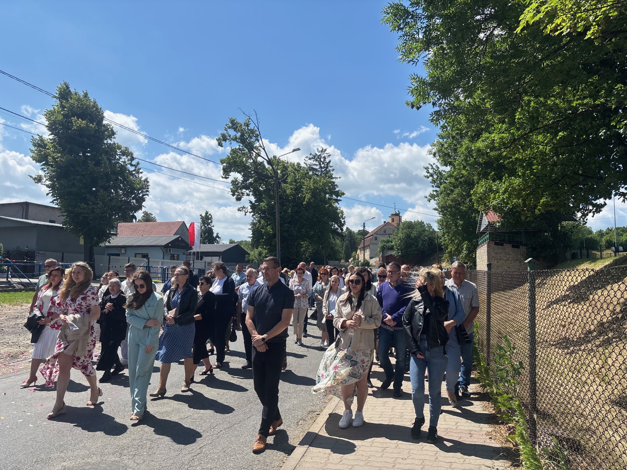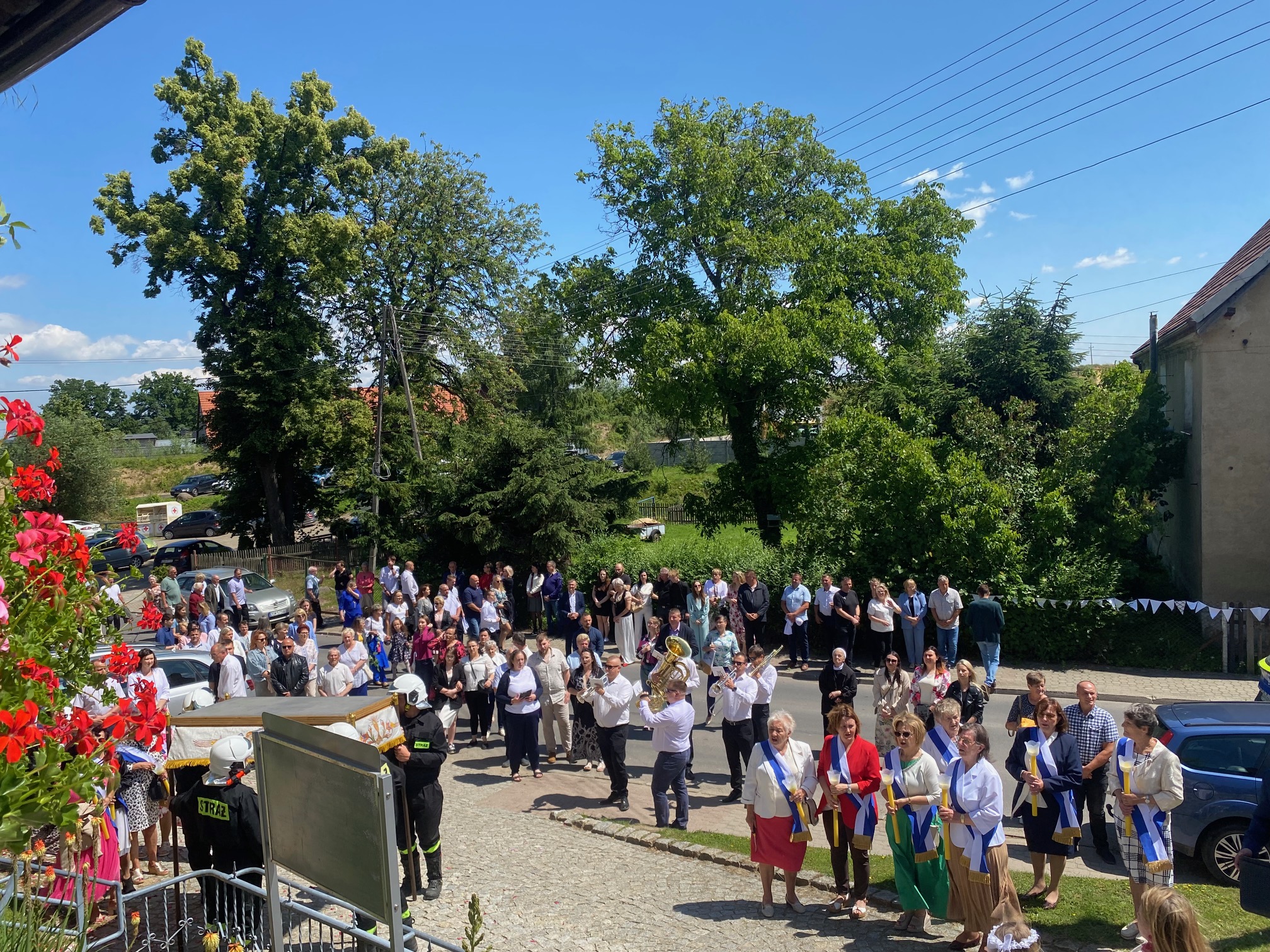 Aby świętować Uroczystość Najświętszego Ciała i Krwi Chrystusa, czyli wyruszyć w procesji eucharystycznej, prosząc Jezusa, by pobłogosławił parafię, potrzeba pracy. Pracę, którą rozpoczęli przedstawiciele grup parafialnych w środę po południu należy widzieć nie tylko jako zadanie „by było ładnie, bezpiecznie”, ale jako świadectwo. Pani Agnieszka, pytana w środę na przygotowaniu ołtarzy dlaczego przyszła, odpowiedziała bez namysłu: „Tak mi serce podpowiada, by tu być i swoją pracą wyrazić moją miłość do Jezusa”. W czwartek o godzinie 10.30 rozpoczęła się Msza Święta. W kazaniu ks. Marcin zachęcił do miłości do Eucharystii, przejawiającej się w chodzeniu na Mszę św. i na adorację w ciągu dnia. Kapłan prosił: chodźmy do kościoła jak najczęściej, mimo pracy, aby przyjąć Jezusa w Komunii św. Bo On czeka na nas każdego dnia. Niech nie czeka nadaremnie! Po Mszy św. z kościoła wyruszyła procesja, wraz z dziećmi obchodzącymi w tym uroczystym dniu swoją Pierwszą Rocznicę Komunii Świętej oraz ich rodzicami. W tym roku procesja do czterech ołtarzy wyszła poza mury kościoła, w stronę Dolnego Mokrzeszowa. Dziewczynki sypiące kwiaty, ministranci, lektorzy – piękne świadectwo miłości do Jezusa. Furorę na procesji zrobiła mała Julka, która z wielką uwagą sypała kwiaty. Ona tak wyznała wiarę. Uczestnicy procesji w skupieniu zatrzymywali się przy kolejnych ołtarzach, przy których następowało odczytanie fragmentów Ewangelii. Przy pierwszym z nich odczytywany jest fragment Ewangelii wg św. Mateusza o ostatniej wieczerzy, a więc nawiązujący do ustanowienia przez Jezusa Eucharystii. Drugi ołtarz jest związany z fragmentem Ewangelii wg św. Marka, dotyczącym rozmnożenia chleba. Przy trzecim ołtarzu odczytywany jest fragment Ewangelii wg św. Łukasza, który opowiada o zaproszonych na ucztę. Zaś ostatni, czwarty ołtarz związany jest z Ewangelią wg św. Jana i sakramentem zjednoczenia. Przy nim kapłan zachęcał do „zakochania się w Eucharystii” i na koniec podziękował za pomoc w przygotowaniu procesji.