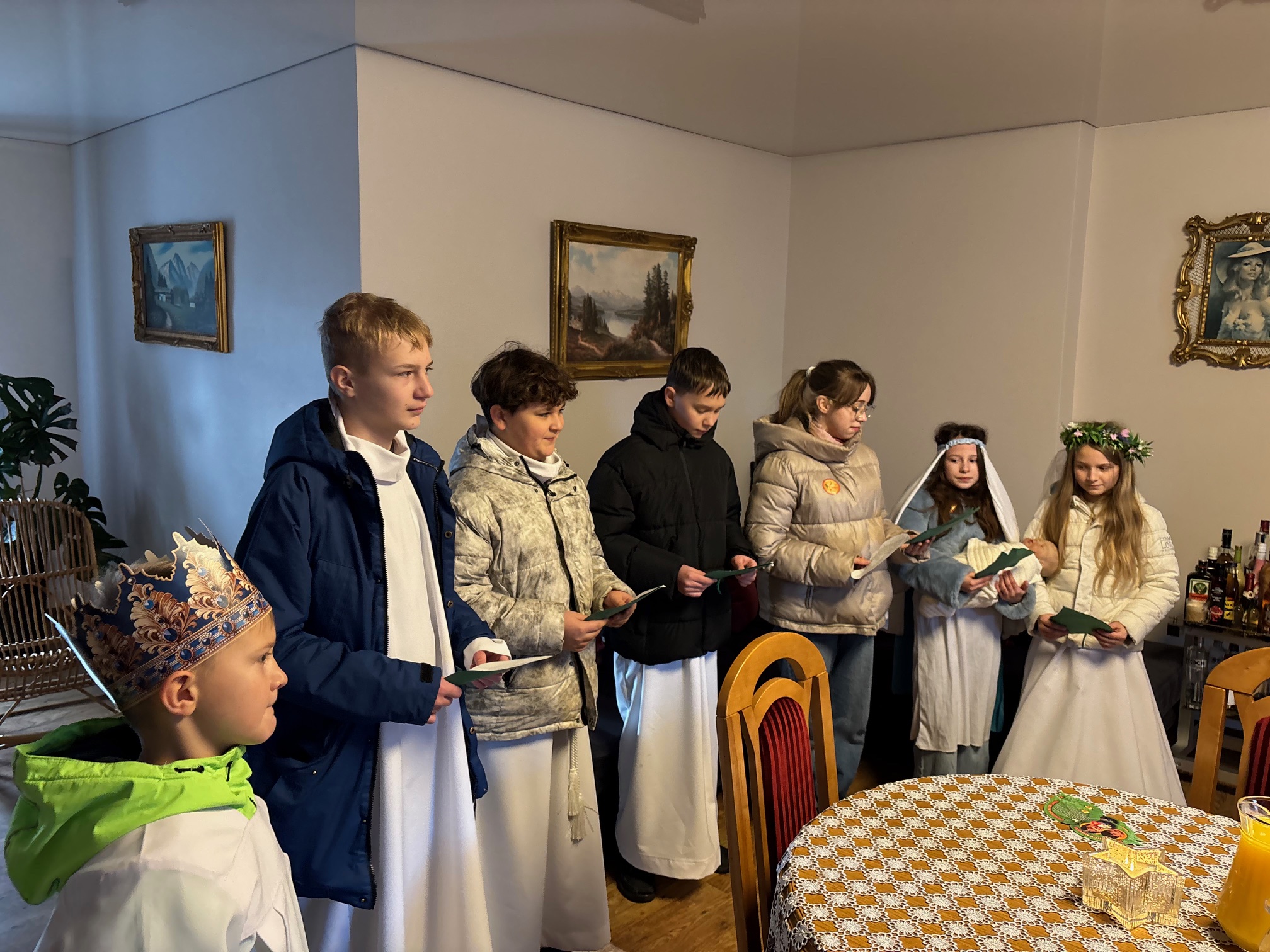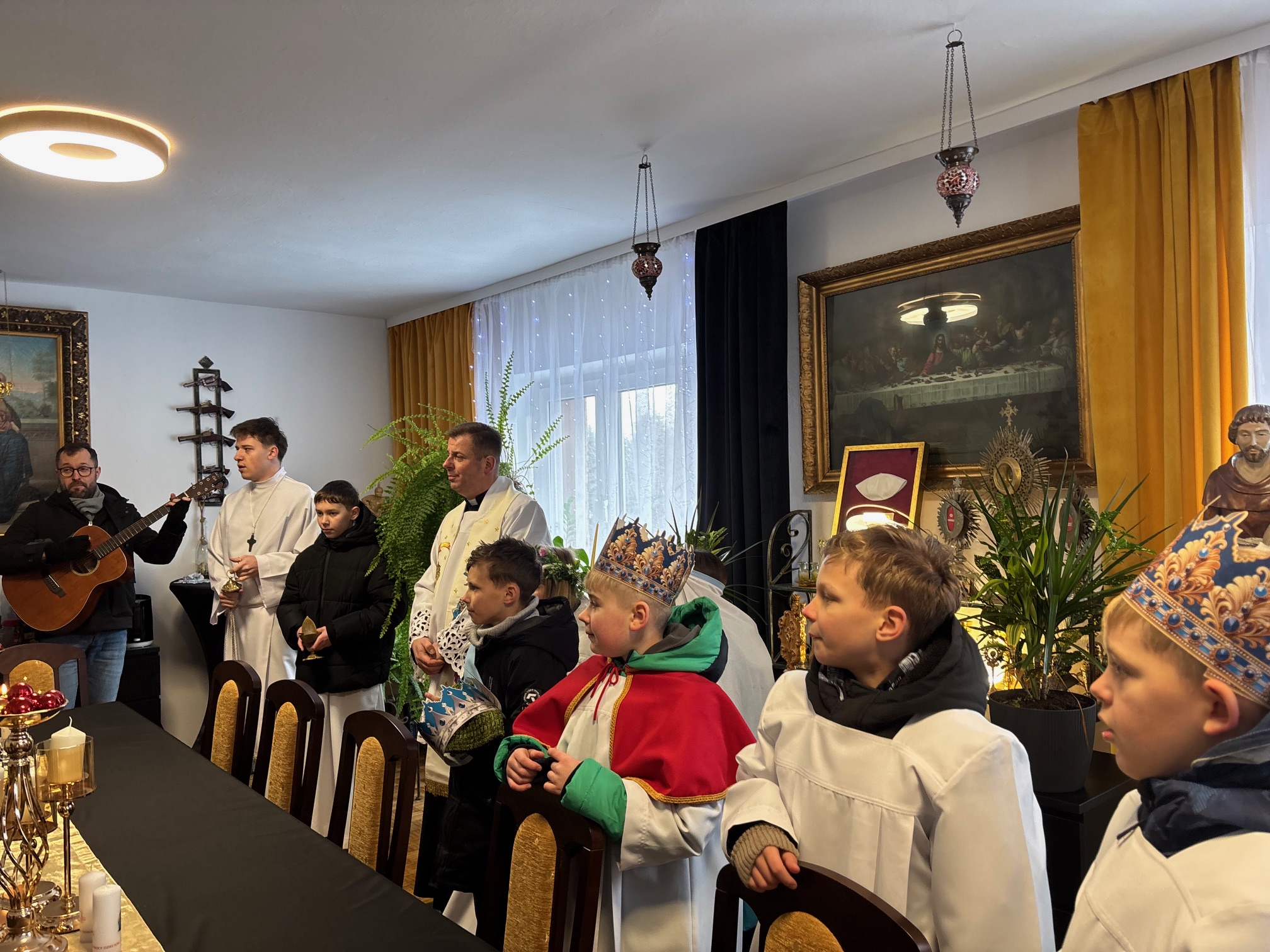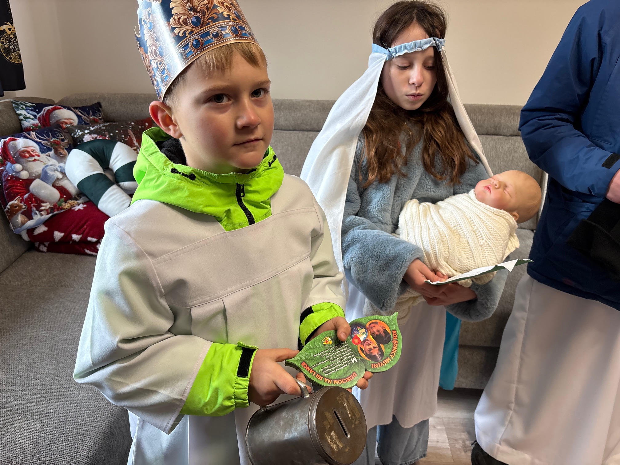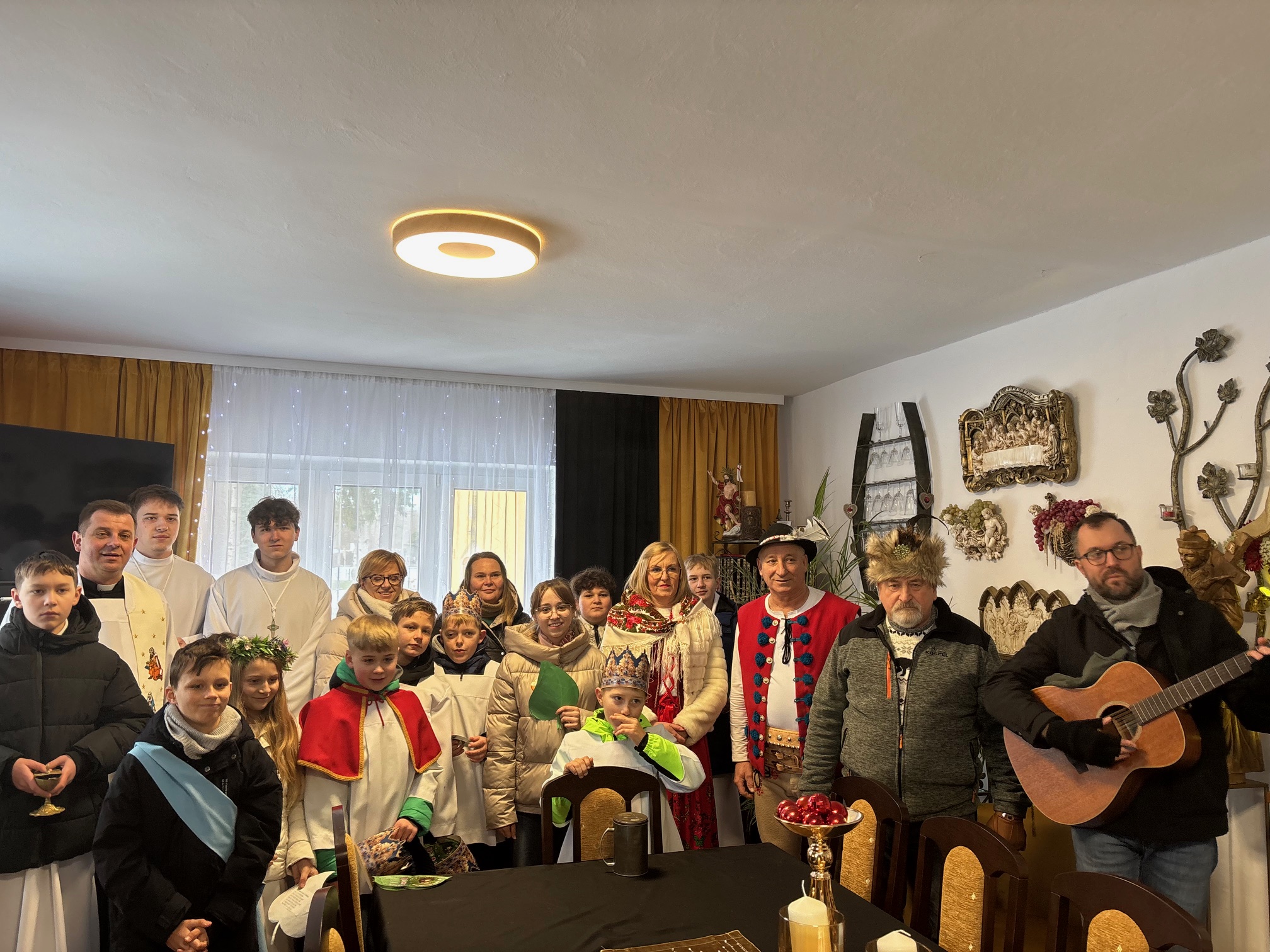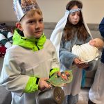 We wtorek, 6 stycznia 2026 roku, bardzo dużo się działo w naszej parafii. Po Mszy św. o godz. 11.00 Kolędnicy Misyjni z Bożym błogosławieństwem poszli do domów w Mokrzeszowie. Najpierw zaszli na plebanię, by w tym domu również mogła się odbyć kolęda. Tu także przedstawili jasełka, w których opowiedzieli o celu ich kolędowania i zachęcili do wsparcia dzieci ze Sri Lanki. Po modlitwie na plebanii młodzi ludzie wyruszyli na kolędowanie do zgłoszonych domów. W odwiedzanych domach oczywiście nie zabrakło słodkich poczęstunków, kolęd i serdecznych rozmów. Ks. Twardowski tak pisał o poszukiwaniu Boga: „Żeby Go odnaleźć, nie wystarczy tylko rozmyślać – trzeba zacząć Go szukać. Trzeba się ruszyć z miejsca, choćby najbardziej wygodnego, nie bać się drogi przez pustynię, nie załamywać rąk, jeśli gwiazda zgaśnie. Odnaleźć Boga – to zrozumieć: Bóg jest tak nieskończenie wielki, że nie zdoła Go ogarnąć cały wszechświat, i jednocześnie może przyjść jako bezbronne dziecko”. Z kolei papież Franciszek zachęca nas, abyśmy w tym poszukiwaniu Boga i jednoczesnym poznawaniu ludzi oraz świata „wpatrując się w Trzech Mędrców, nie zadowalali się przeciętnością, nie wegetowali, ale poszukiwali sensu rzeczy, z pasją badali wielką tajemnicę życia”. Dlatego w tym roku nasi dzielni Kolędnicy Misyjni stali się wspaniałymi ewangelizatorami, którzy w przygotowanych scenkach opowiedzieli nam o potrzebujących dzieciach. Wspólne kolędowanie zarówno w kościele, na plebanii, jak i w domach w Mokrzeszowie dało każdemu wiele radości. Bardzo serdecznie dziękujemy wspaniałym Kolędnikom Misyjnym za ich pięknie przygotowane role i zaraźliwą radość chrześcijańską.