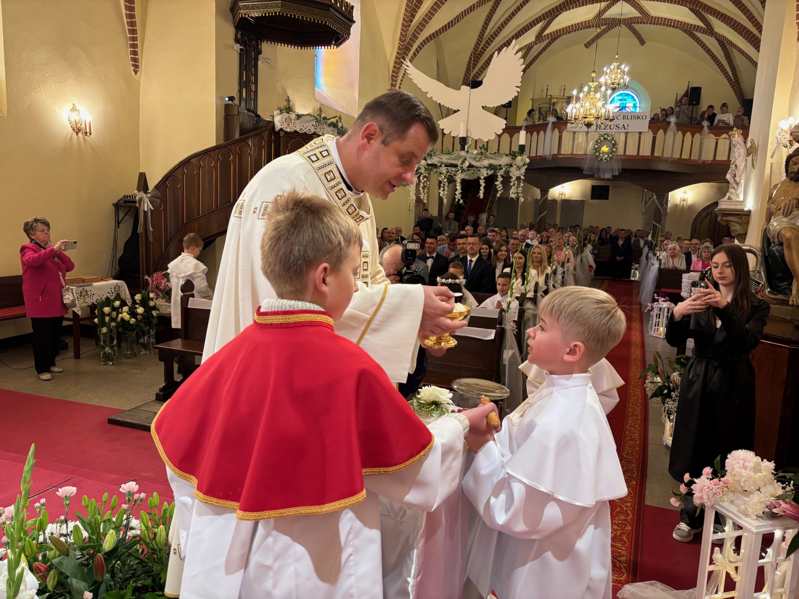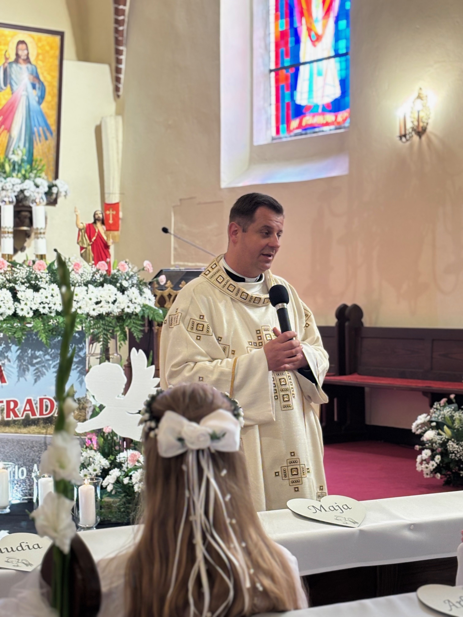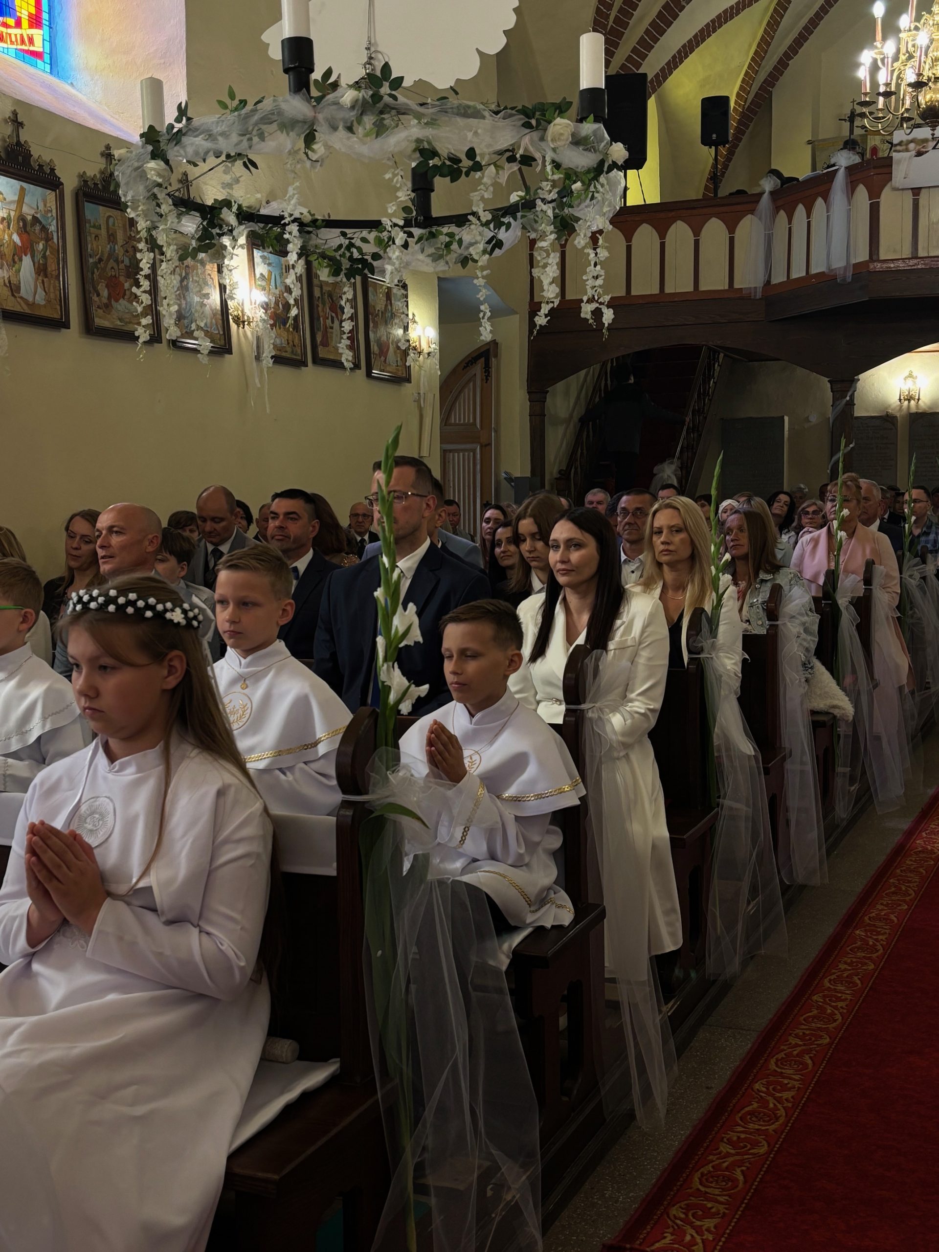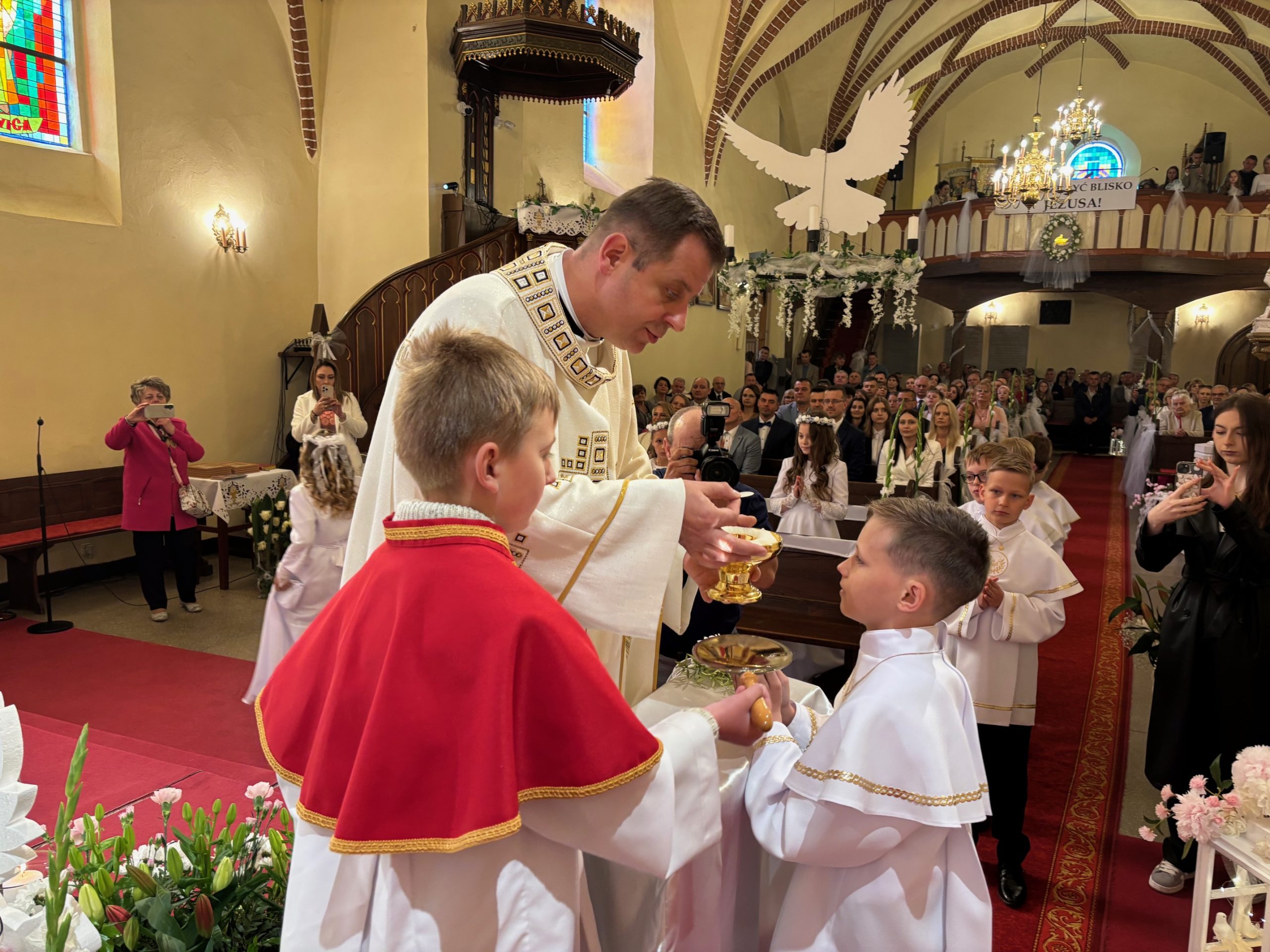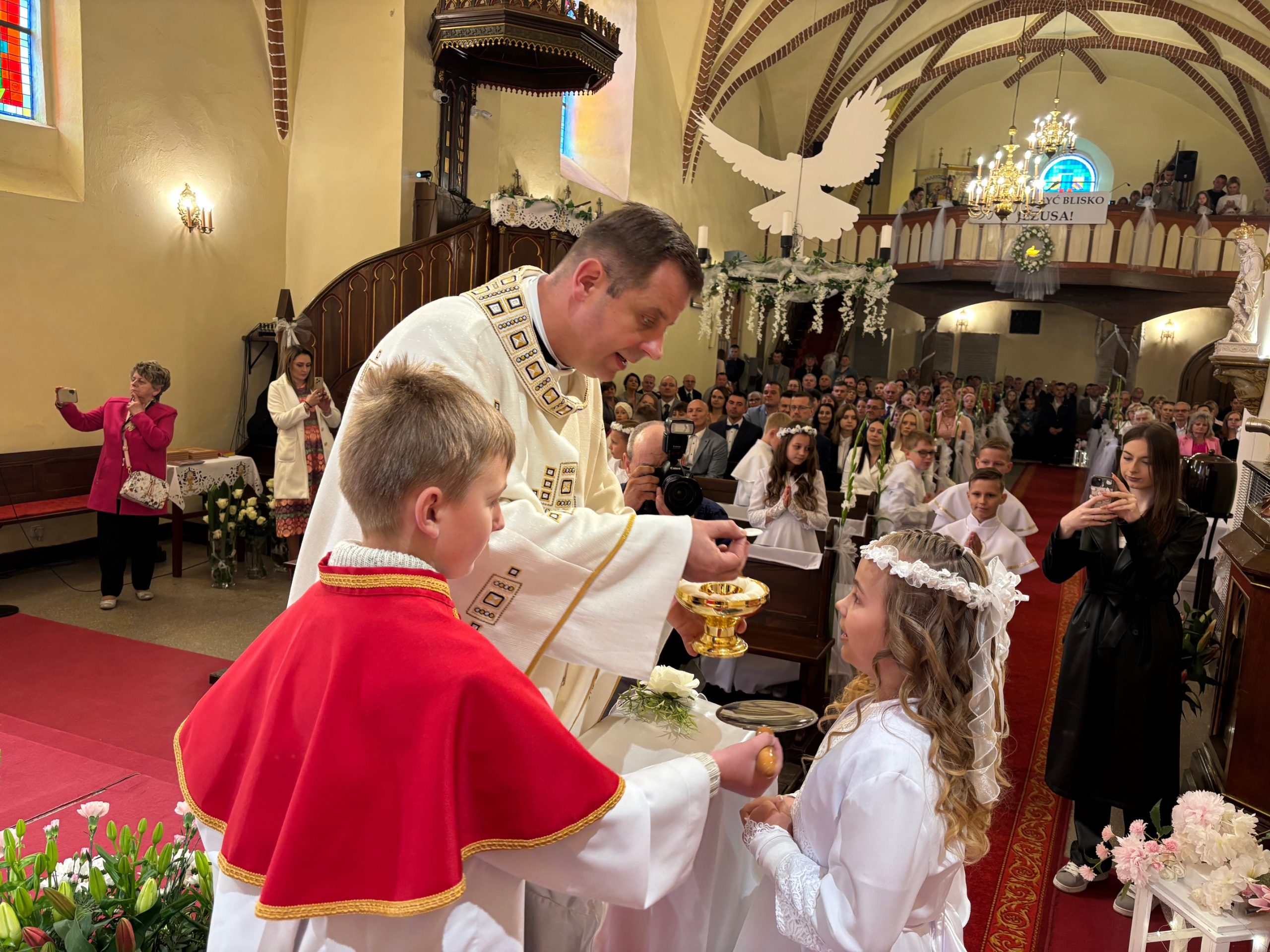 W sobotę 24 maja w naszej wspólnocie parafialnej odbyła się Pierwsza Komunia Święta. W kazaniu ks. Marcin. zachęcał nie tylko dzieci, ale i ich rodziców do częstego korzystania z sakramentów, za przykład ukazując postać bł. Carla Acutisa. Mówił: dzisiejsza Ewangelia zaczyna się od bardzo ważnych słów, nad którymi chciałbym się dziś zatrzymać. Przypomnijmy je sobie: „Jezus powiedział do swoich uczniów: «Jeśli Mnie kto miłuje, będzie zachowywał moją naukę (…)»”. Jak rozumieć te słowa? Kto będzie słuchał Jego słów i żył zgodnie z tym, co mówi Pan Jezus – to właśnie oznacza zachowywanie czyjejś nauki. Nie chodzi o to, aby coś tylko spisać i zachować na później, ale o to, aby przyjąć taką naukę do serca i prowadzić życie zgodne z przyjętymi wskazówkami. Tak rozumiał to Carlo, wasz patron sakramentu. I niech On będzie motywacją dla was. Po komunii dzieci podziękowały za dar Eucharystii, przyrzekając, że będą chętnie przystępować do sakramentu pokuty i do Komunii Świętej. Na koniec Mszy św. ks. Marcin poświęcił pamiątkowe obrazki, które następnie zostały wręczone dzieciom. Na popołudniowym nabożeństwie majowym dzieci zawierzyły Matce Bożej swoją nową drogę i poprosiły Maryję o opiekę.