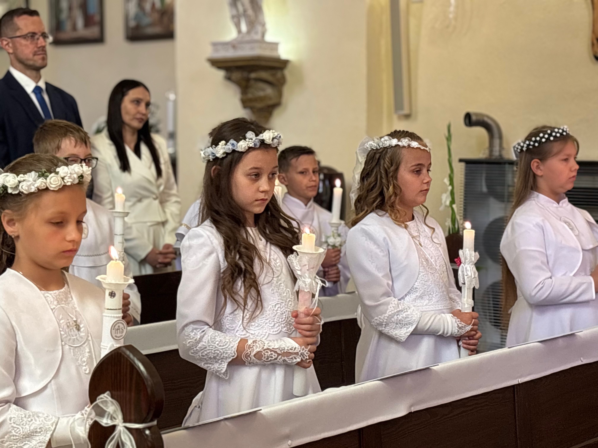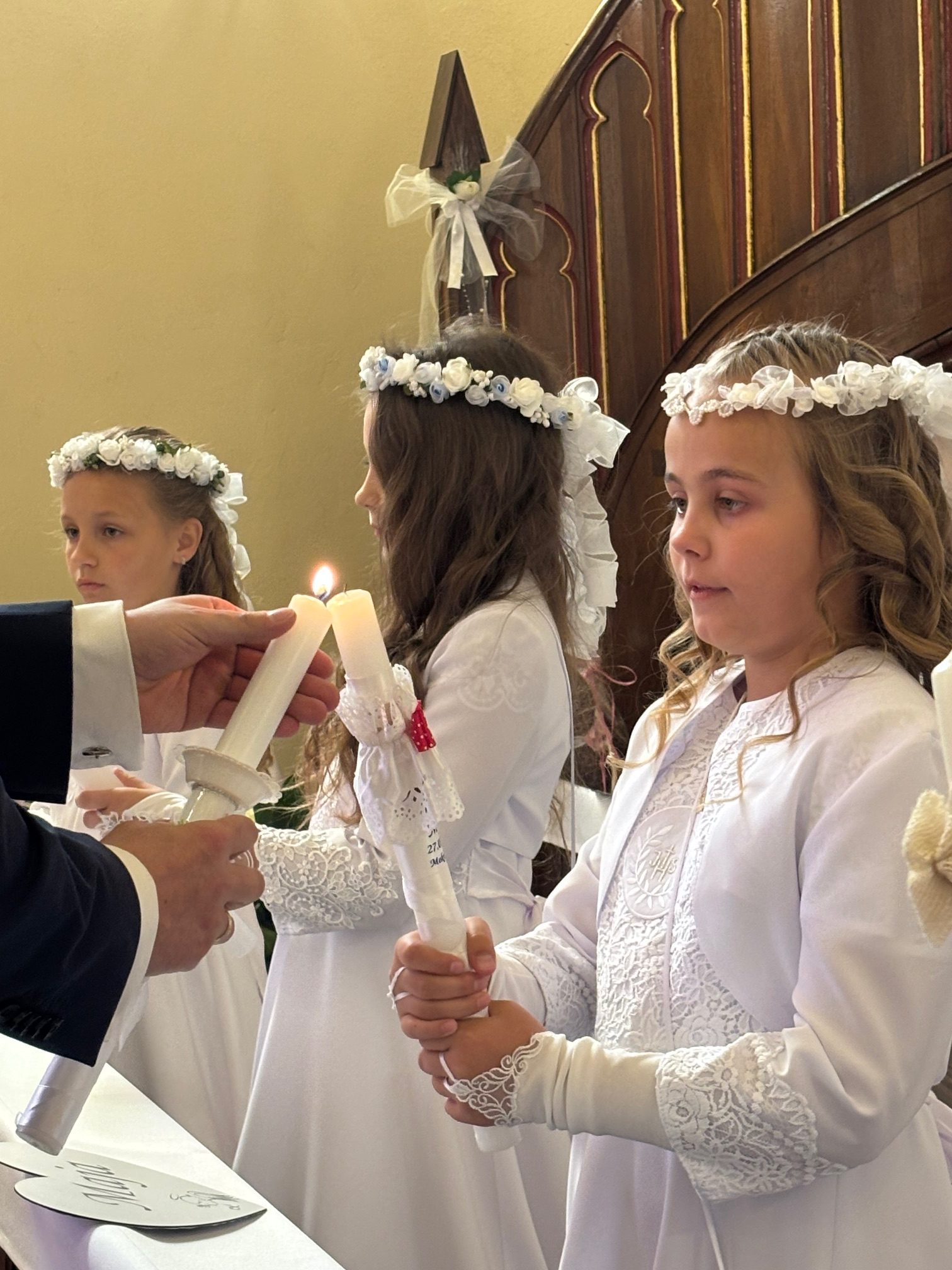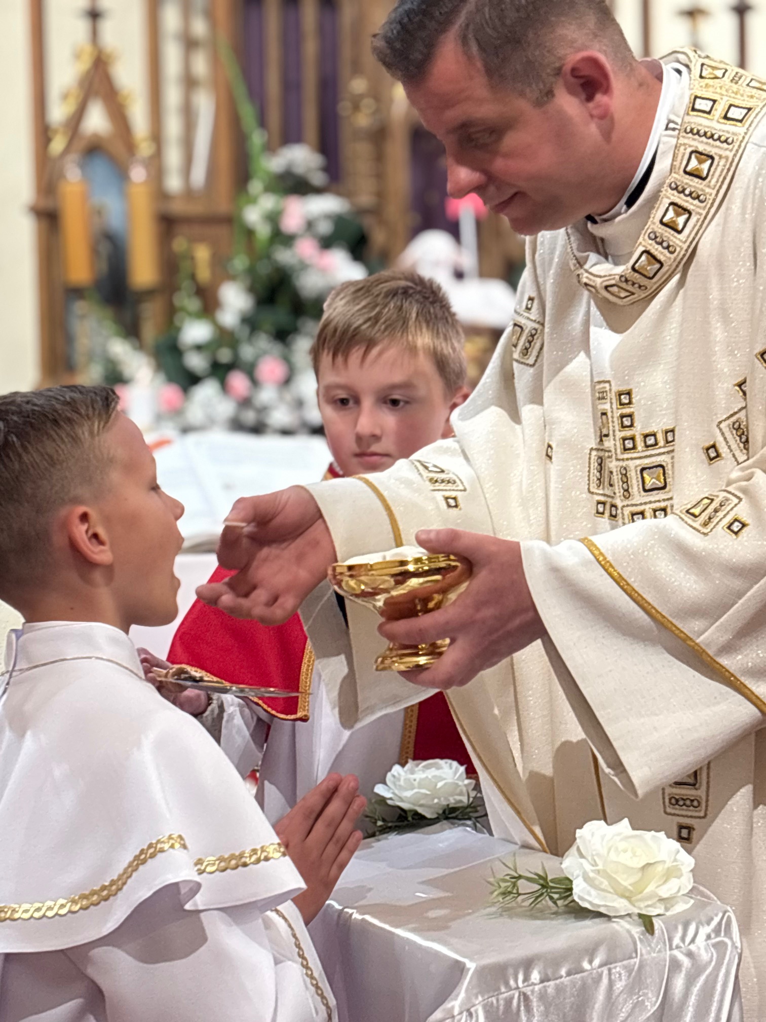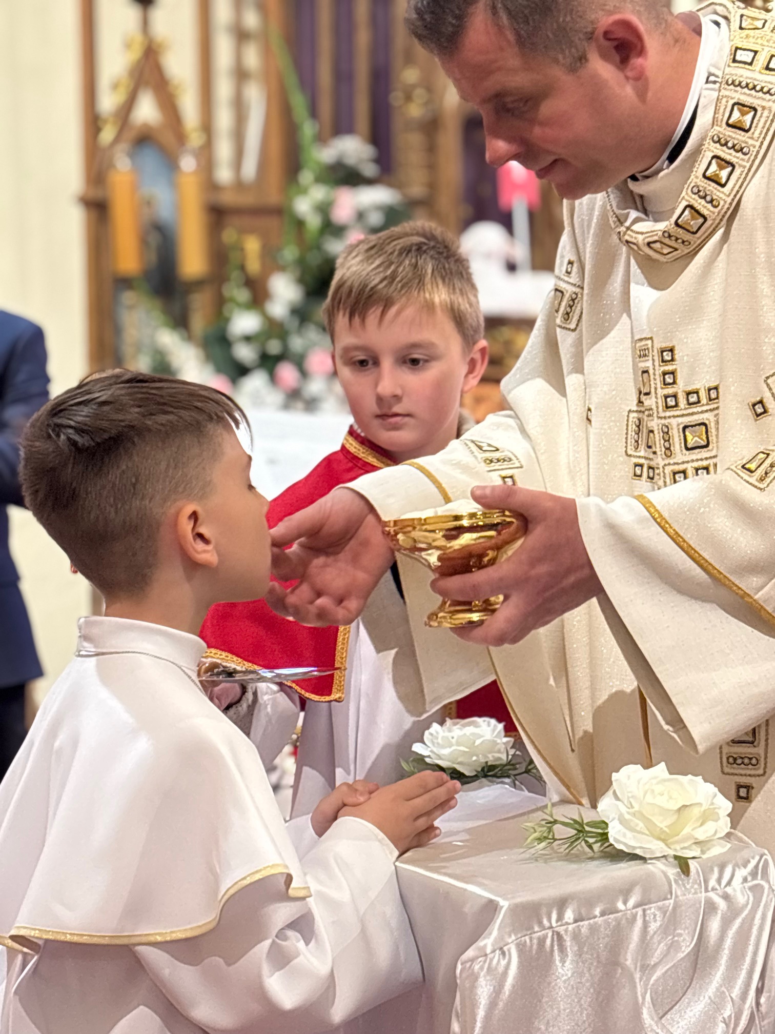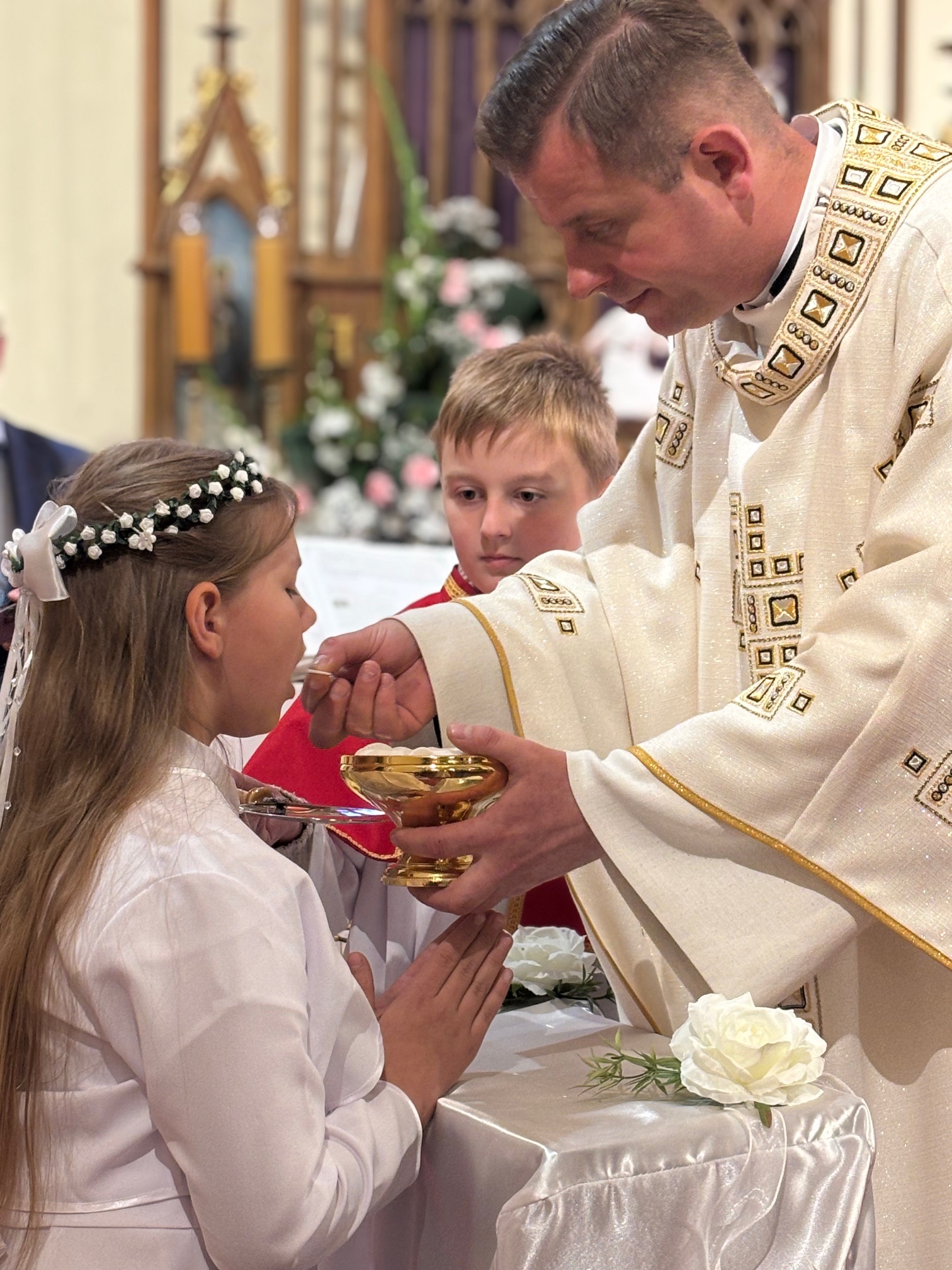 W sobotę 24 maja w naszej wspólnocie parafialnej odbyła się Pierwsza Komunia Święta. W kazaniu ks. Marcin. zachęcał nie tylko dzieci, ale i ich rodziców do częstego korzystania z sakramentów, za przykład ukazując postać bł. Carla Acutisa. Mówił: dzisiejsza Ewangelia zaczyna się od bardzo ważnych słów, nad którymi chciałbym się dziś zatrzymać. Przypomnijmy je sobie: „Jezus powiedział do swoich uczniów: «Jeśli Mnie kto miłuje, będzie zachowywał moją naukę (…)»”. Jak rozumieć te słowa? Kto będzie słuchał Jego słów i żył zgodnie z tym, co mówi Pan Jezus – to właśnie oznacza zachowywanie czyjejś nauki. Nie chodzi o to, aby coś tylko spisać i zachować na później, ale o to, aby przyjąć taką naukę do serca i prowadzić życie zgodne z przyjętymi wskazówkami. Tak rozumiał to Carlo, wasz patron sakramentu. I niech On będzie motywacją dla was. Po komunii dzieci podziękowały za dar Eucharystii, przyrzekając, że będą chętnie przystępować do sakramentu pokuty i do Komunii Świętej. Na koniec Mszy św. ks. Marcin poświęcił pamiątkowe obrazki, które następnie zostały wręczone dzieciom. Na popołudniowym nabożeństwie majowym dzieci zawierzyły Matce Bożej swoją nową drogę i poprosiły Maryję o opiekę.
