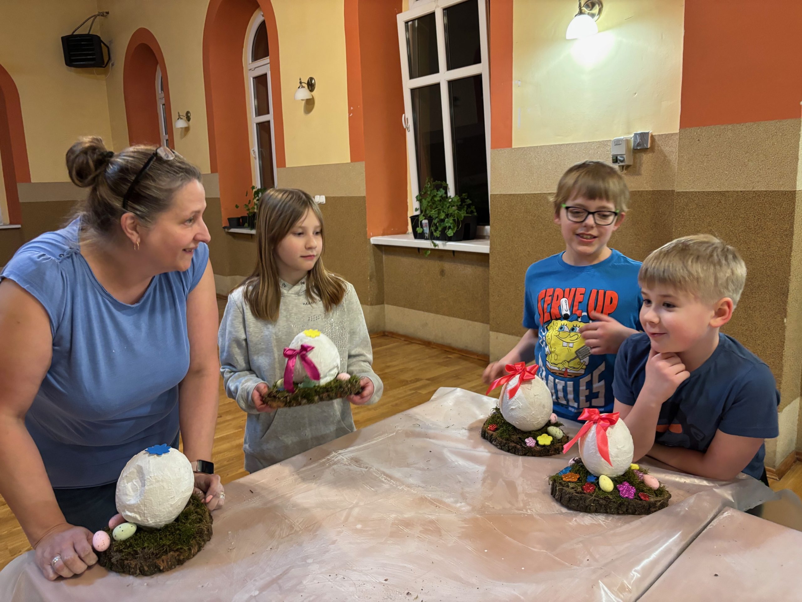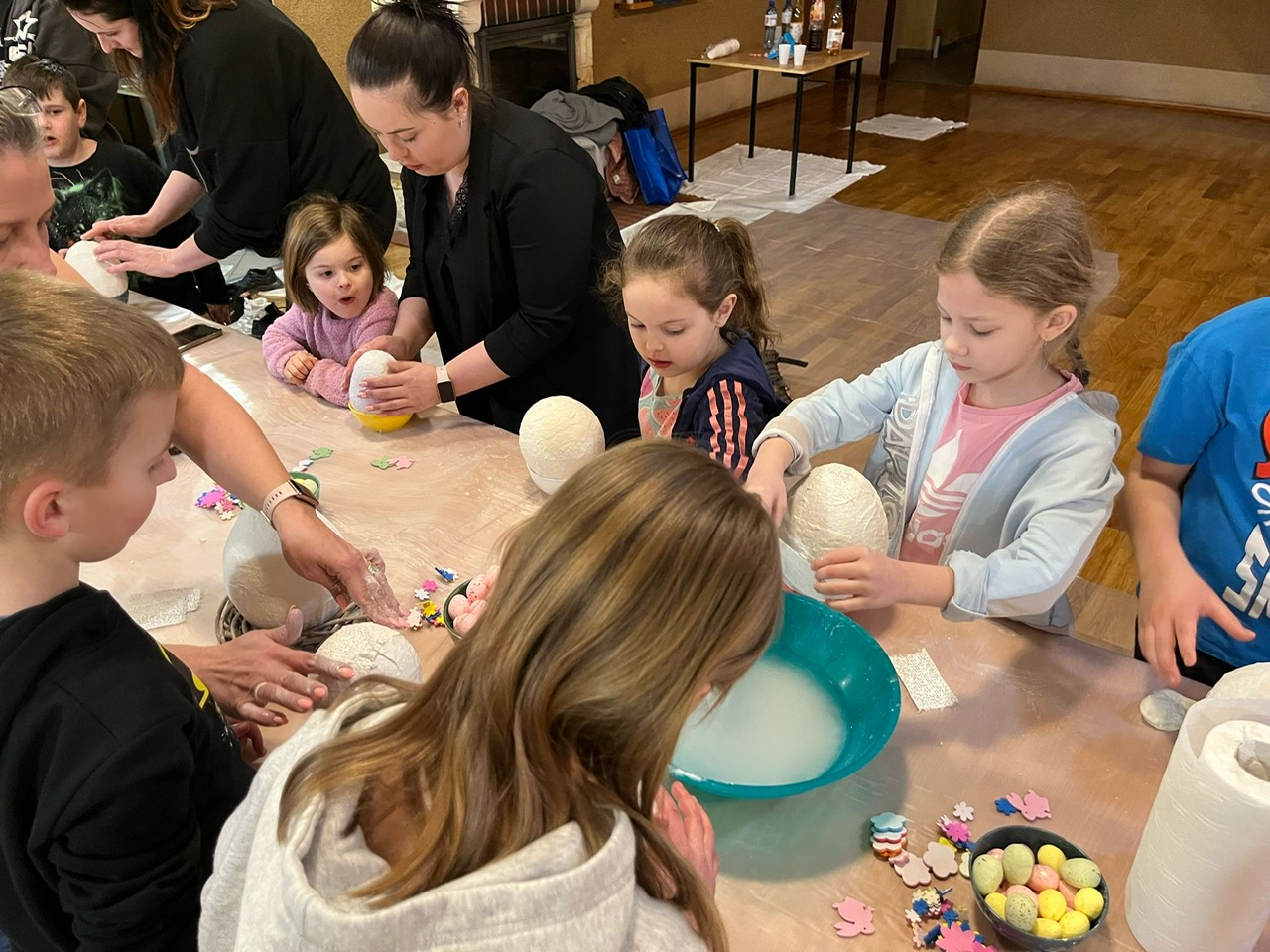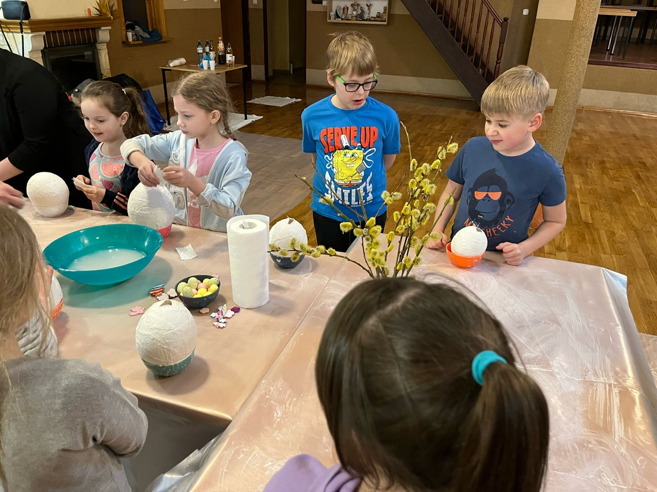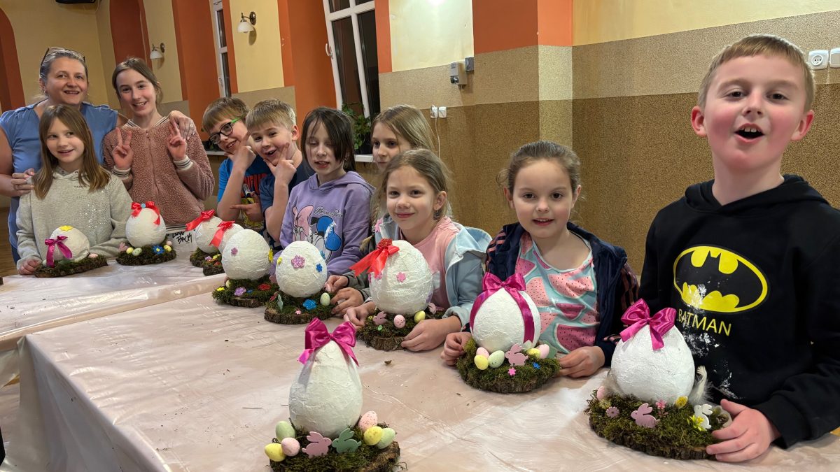 Dziś w naszej parafii odbyły się warsztaty florystyczne dla dzieci. Tematem przewodnim było „Jajko wielkanocne z gipsu”. Dzieci miały niełatwe zadanie, bo praca wymagała dużo skupienia, delikatności i cierpliwości. Towarzyszyły nam małe trudności, jak np. pękające balony, ale nasza determinacja i chęci do pracy pomogły nam pokonać wszystkie przeszkody. Dziękuję wszystkim uczestnikom za świetną zabawę i za chęci, których nikomu nie zabrakło. Podczas tworzenia jaj, trochę wszyscy zgłodnieli i niespodzianką była super pyszna pizza, która dodała nam sił do wykończenia prac. Nasze dzieci wyszły do domu zadowolone i dumne, niosąc piękną ozdobę stołu na nadchodzące święta wielkanocne. Pani Agnieszka dziękuje wszystkim za miło spędzony czas, Wasze zaangażowanie i dobry humor.