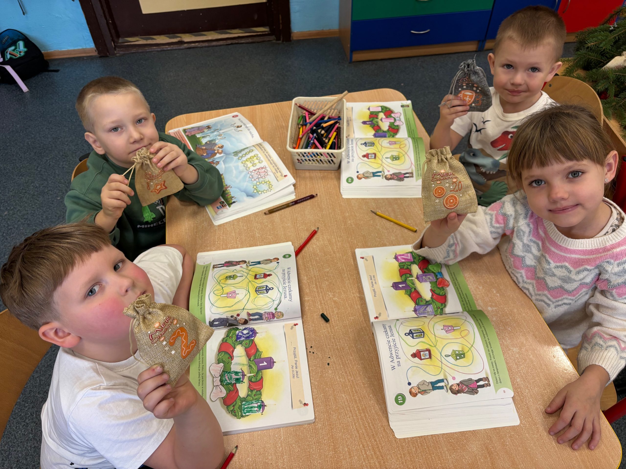 Adwent już w samej swej łacińskiej nazwie adventus oznacza czas wyczekiwania na przyjście, czyli narodzenie Jezusa. Jest podobny do całego ludzkiego życia, które jest ciągłym oczekiwaniem na spotkanie z Bogiem. To także czas, w którym chcemy na katechezie porozmawiać o historii zbawienia i roku liturgicznym oraz o tym, co dla chrześcijanina oznacza „czuwać”. 25 listopada na lekcji religii uczniowie szkoły podstawowej w zeszytach zapisali: „czuwać” to znaczy być człowiekiem sumienia, chodzić na roraty, być w łączności z Chrystusem przez modlitwę i sakramenty, służyć bliźniemu, dostrzegać potrzeby biednych, być odpowiedzialnym za losy Ojczyzny, strzec wielkiego dobra, jakim jest wiara. Zatem Adwent to również czas uporządkowania hierarchii wartości oraz pomoc w uszlachetnieniu. Prawdą jest, że im więcej wysiłku włożymy w to przygotowanie, im bardziej będzie ono dla nas tak po ludzku trudne – tym większa później będzie radość świętowania. W jednej ze swoich homilii papież Franciszek mówił, że w Adwencie dążymy przede wszystkim do spotkania z Jezusem. Zatem to czas wyruszenia w drogę na spotkanie Pana, a nie czas, aby biernie siedzieć. Dlatego będąc ludźmi „działania” podążyliśmy za myślą: „Pomagając innym, pomagasz i sobie”. Jednym z symboli Adwentu jest kalendarz adwentowy. Uczniowie klas młodszych, wykorzystując dostępne materiały, tj.: papier, filc, wstążki, sznurek jutowy, drewno, wykonali zgodnie ze wskazówkami przepiękny kalendarz. Każdy z 24 dni kalendarza zawiera cytat z Ewangelii, postanowienie adwentowe – zarówno dla uczniów przygotowujących kalendarz, jak i dla przedszkolaków – oraz mały prezent świąteczny i słodycze, które były jedynie uzupełnieniem całości. Przygotowany samodzielnie kalendarz jest jedyny i niepowtarzalny, a jego tworzenie sprawiło uczniom radość. „Boże, nasz Ojcze, wzbudź w nas pragnienie wyjścia na spotkanie Chrystusa” poprzez dobre uczynki.