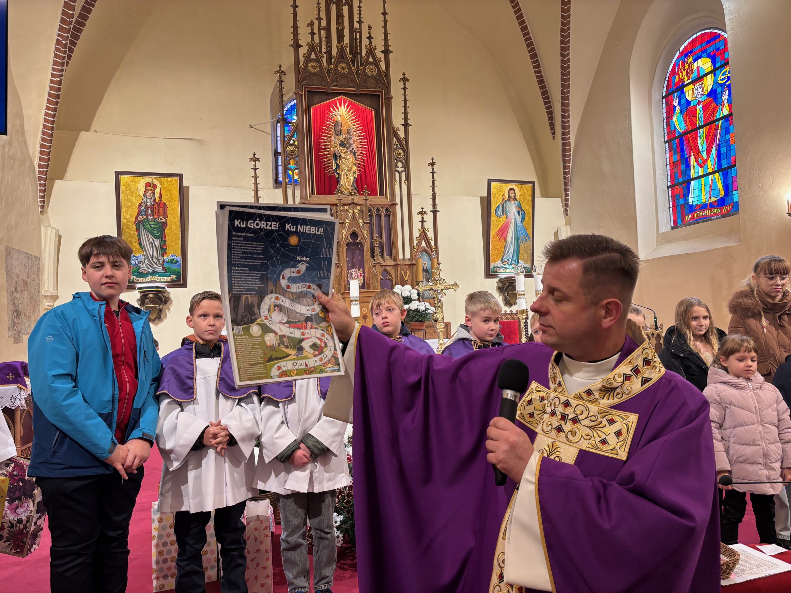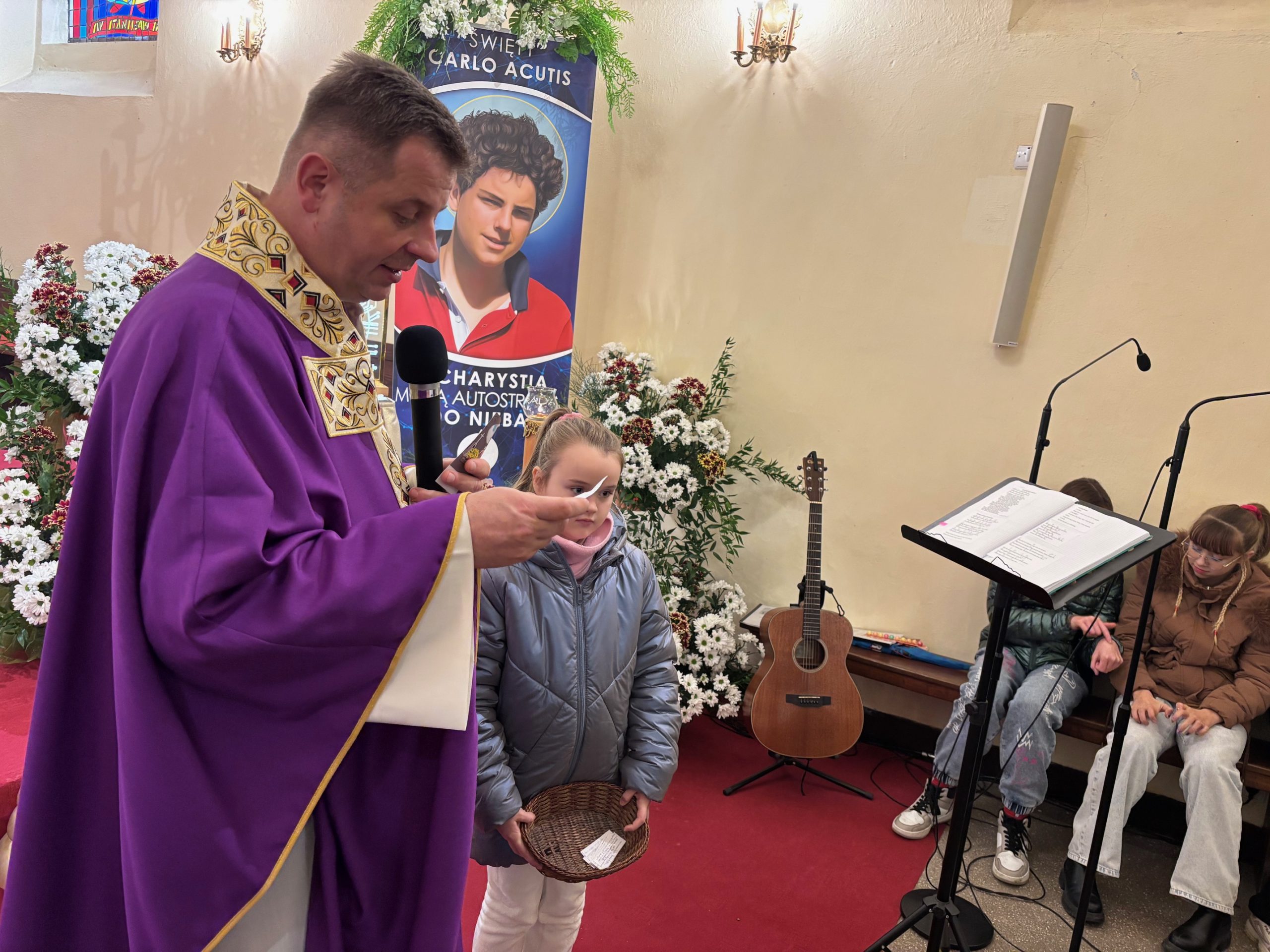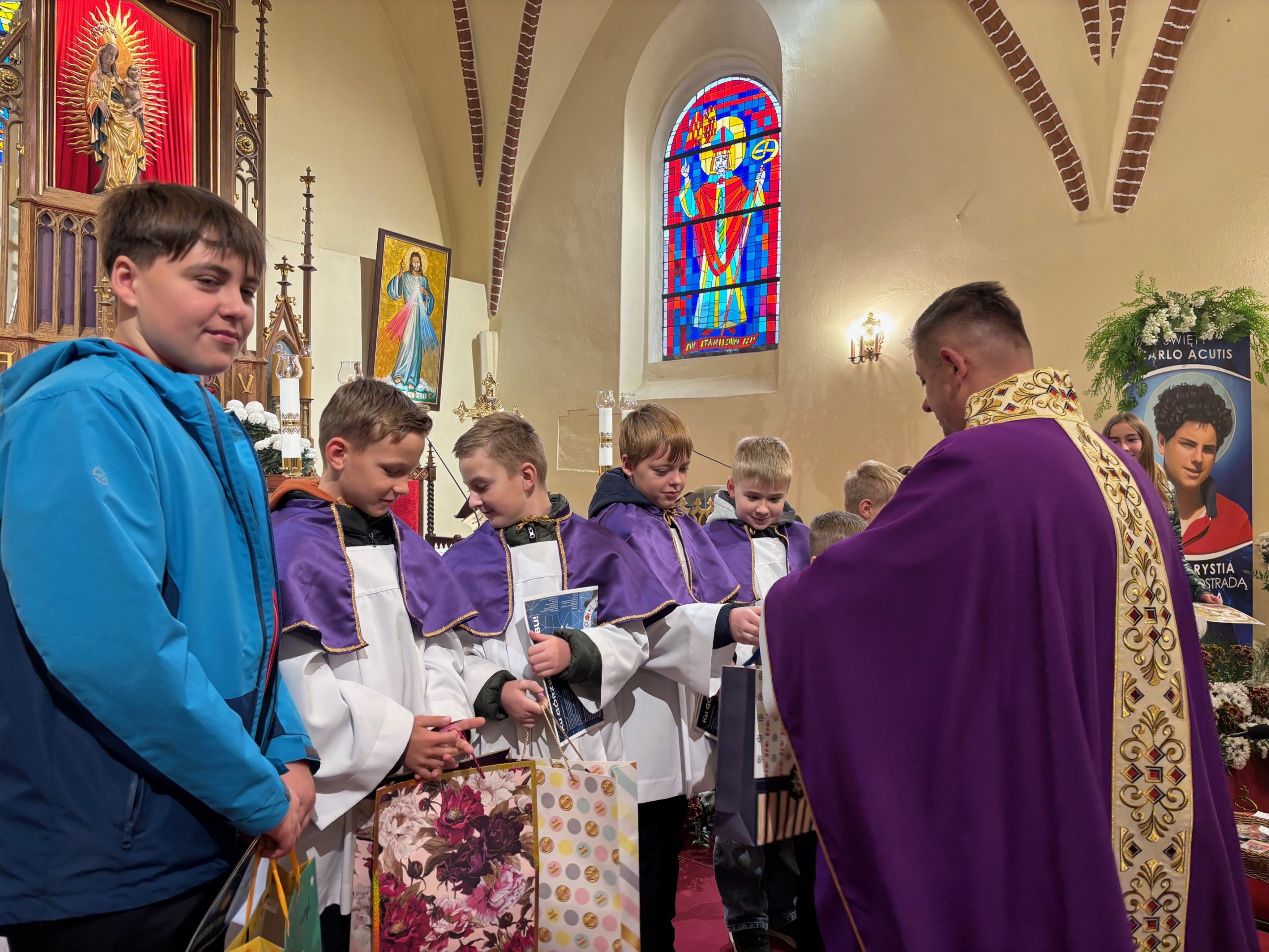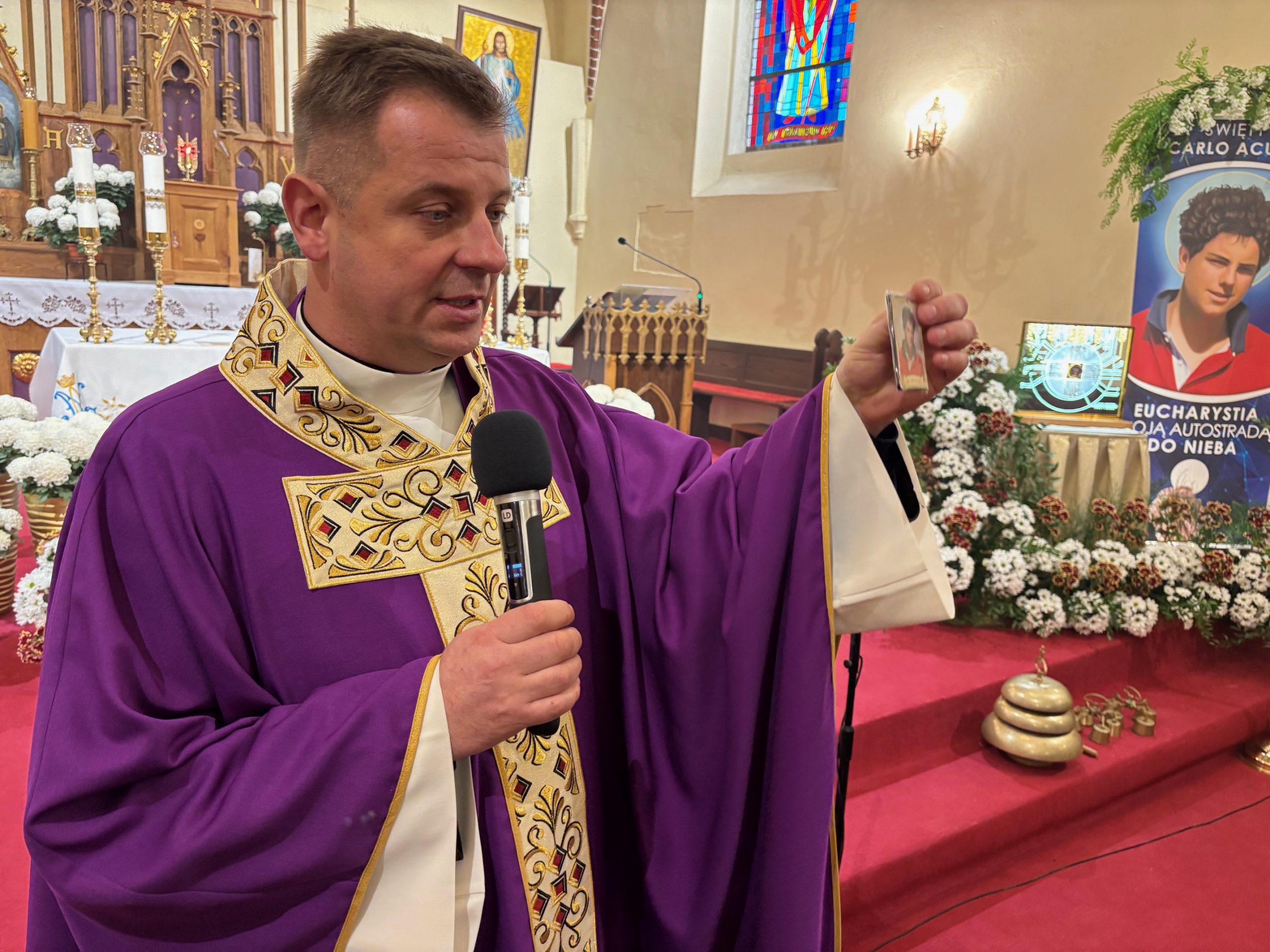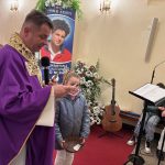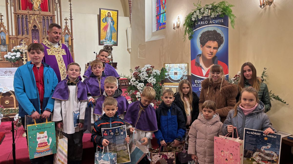 Niebo nie może czekać, mawiał święty Carlo Acutis. W Dzień Zaduszny, kiedy stoimy nad grobami naszych bliskich i myślimy o tych, którzy jeszcze potrzebują modlitwy i przebywają w czyśćcu, św. Carlo w relikwii gości w naszej parafii. To czas na zapytanie siebie o świętość i niebo. Rano, po Mszy o godz. 9.00 wierni udali się na cmentarz, aby się modlić za zmarłych Koronką do Bożego Miłosierdzia. Na Mszy św. o godz. 11.00 w kazaniu ks. Marcin przypomniał, że śmierć nie jest końcem, a podstawą do wiary w życie wieczne jest zmartwychwstanie Jezusa. W wyznaniu wiary co niedzielę wypowiadamy: „wierzę w (…) ciała zmartwychwstanie, żywot wieczny”. W to głęboko wierzył św. Carlo Acutis i mimo choroby ufał Bogu. Pomocą w przybliżeniu podczas kazania postaci tego świętego był krótki film o nim. Św. Carlo kochał różaniec i Matkę Bożą, dlatego na koniec Mszy św. dzieci, które uczestniczyły w nabożeństwach różańcowych otrzymały pamiątkowe upominki, a wszystkie dzieci dostały magnesy z wizerunkiem św. Carla Acutisa.