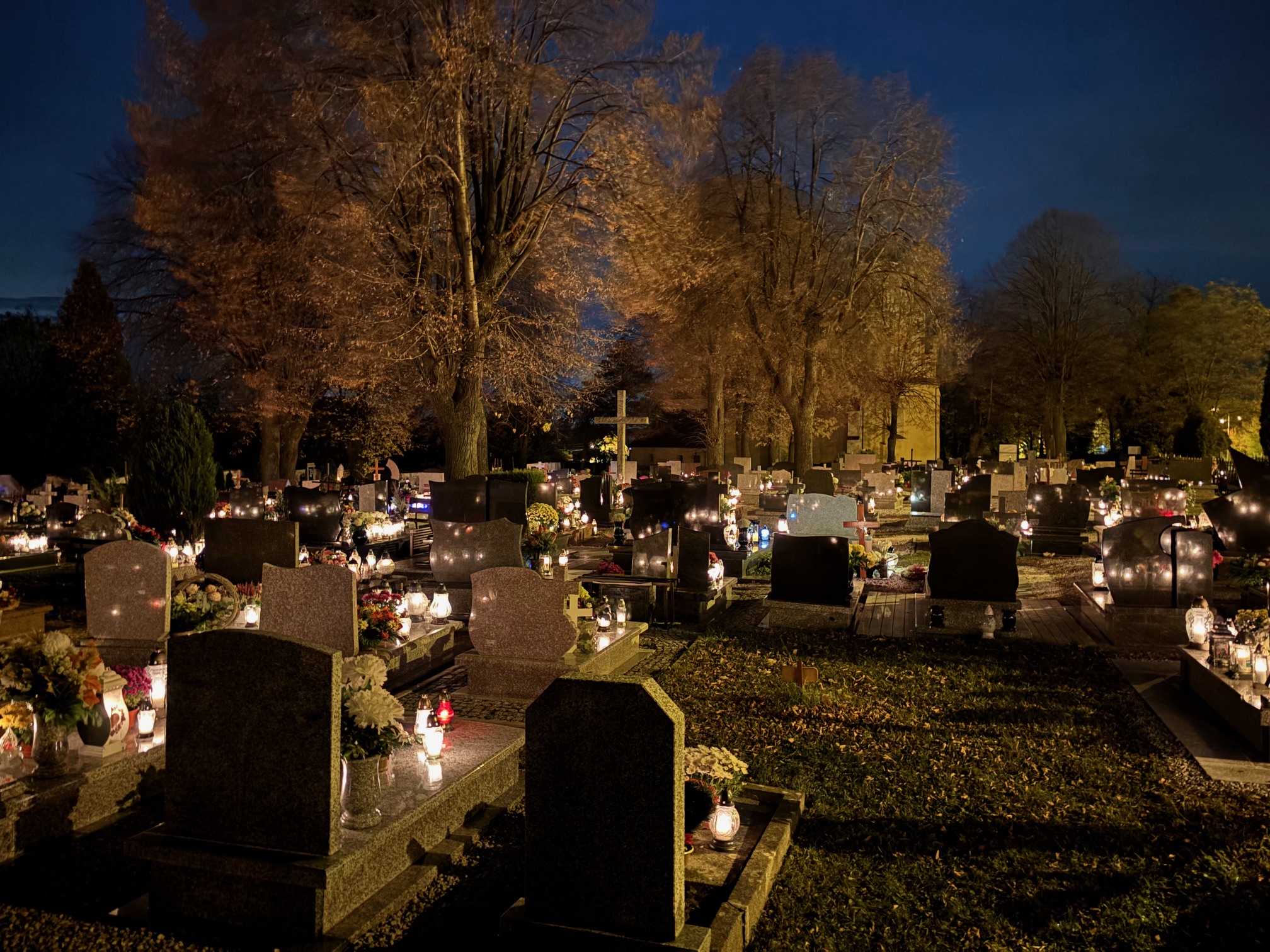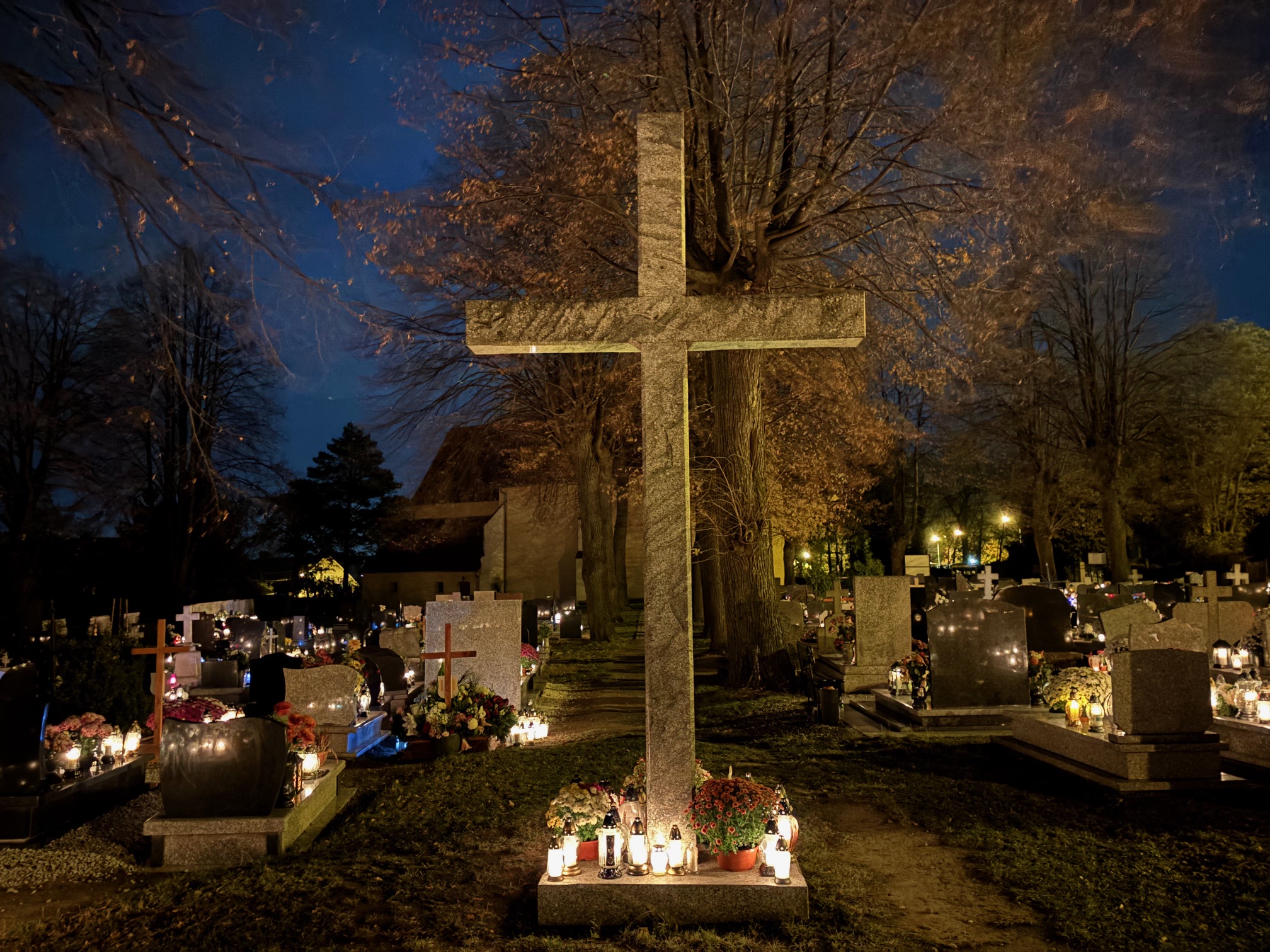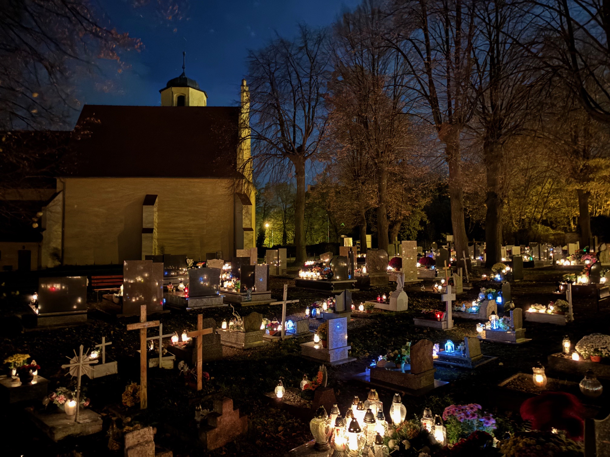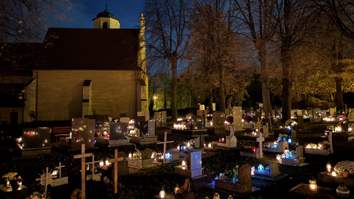 Wieczorna modlitwa na cmentarzu parafialnym w Uroczystość Wszystkich Świętych skłania do zadumy i refleksji. Trwajmy na modlitwie.