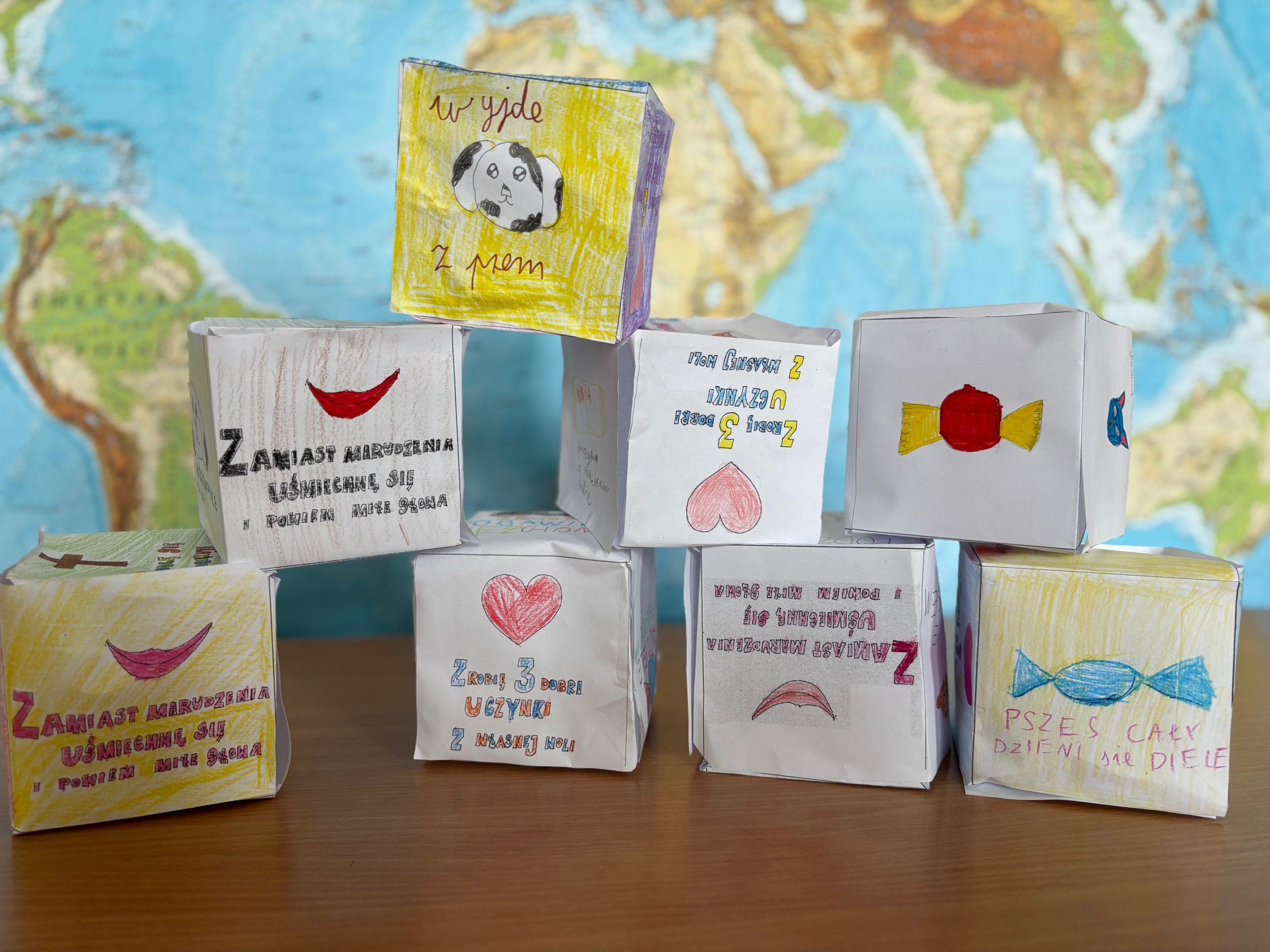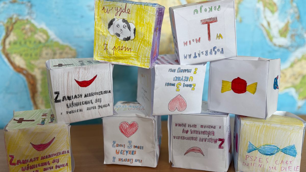 W ramach katechezy dzieci z młodszych klas przygotowały papierowe kostki z gotowych szablonów. Do tego potrzebne były klej i nożyczki. Na gotowych kserówkach dzieci pokolorowały obrazki, a na wolnych polach przedstawiły swoje własne rysunkowe pomysły na wielkopostne postanowienie, np.: cukierek, Biblia, czy miotła. Tak przygotowana kostka posłuży do losowania postanowień na każdy dzień, obrazek na kostce będzie okazją, by pracować nad sobą danego dnia. Bo, jak śpiewamy w jednej z piosenek „Wielki Post to taki czas, co do świąt szykuje nas. Każdy może się poprawić, to co złe naprawić”. Bawiąc się, robimy dobry uczynek. Życzymy nie tylko dzieciom miłej zabawy, ale i zapraszamy całe rodziny do takiej formy pracy nad sobą w Wielkim Poście.