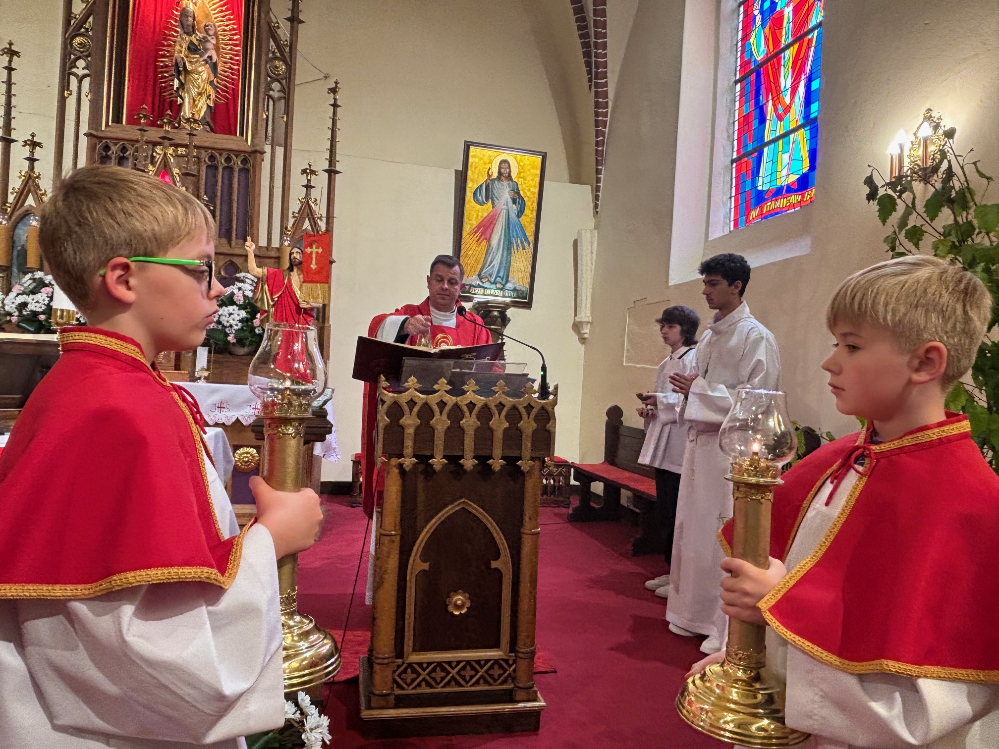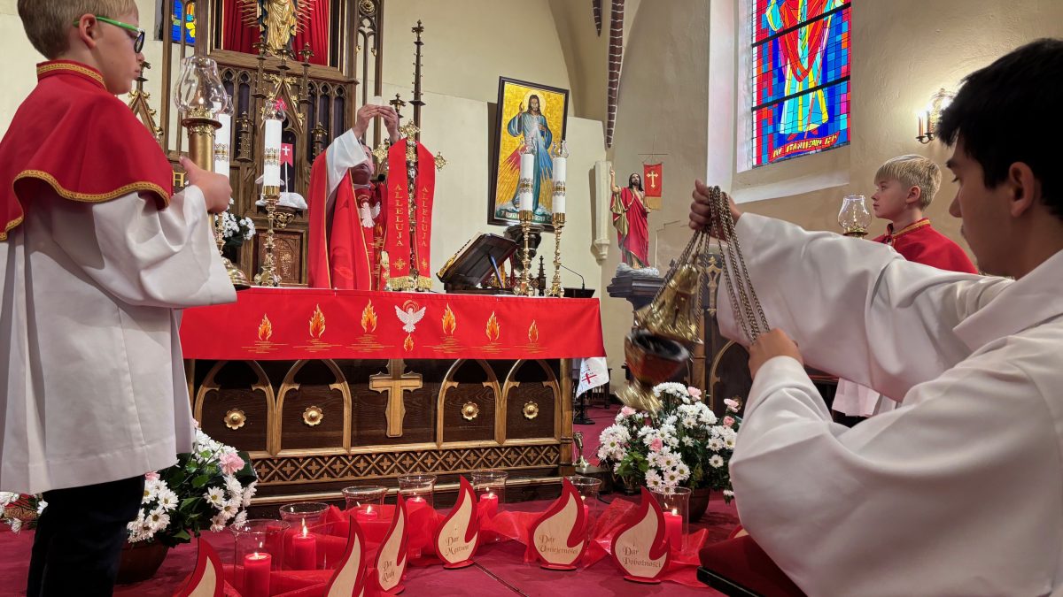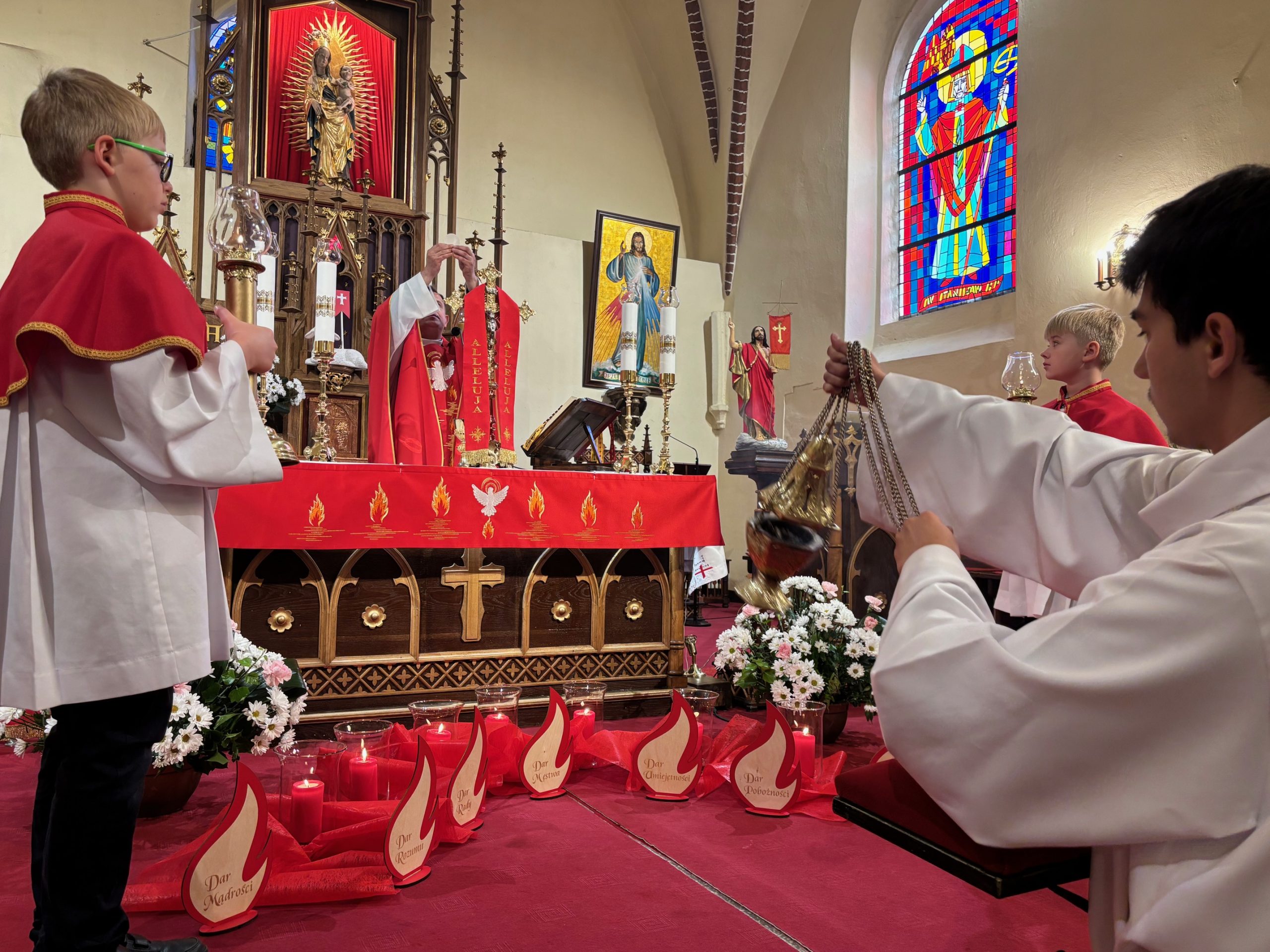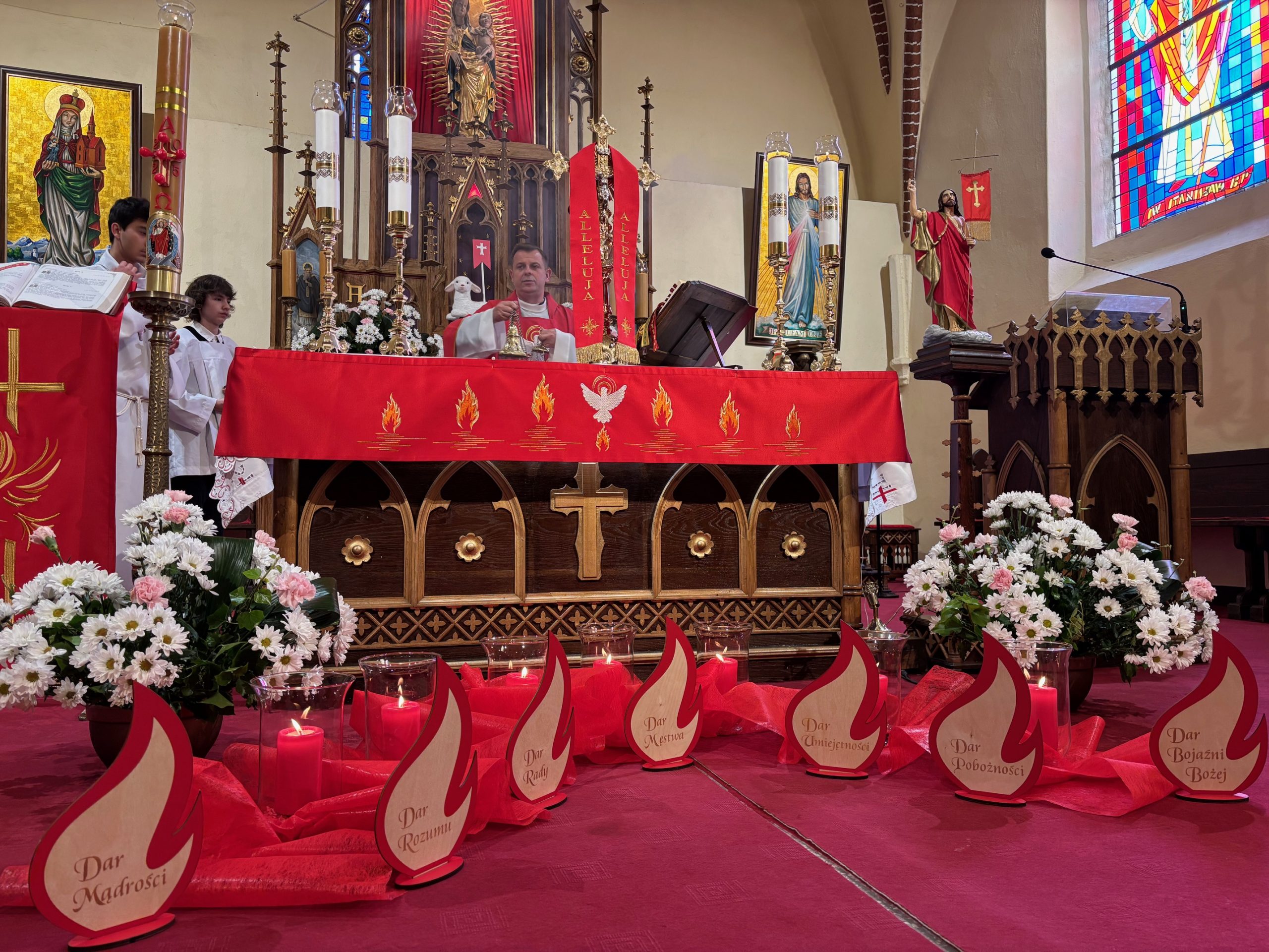 Przeżywamy pięćdziesiąty dzień po Zmartwychwstaniu Pana Jezusa, jest to dzień Zesłania Ducha Świętego. W ten dzień po święcie Paschy świętowano pierwsze zbiory plonów Izraela. W ten radosny i świąteczny dzień apostołowie zgromadzeni byli na modlitwie. Pan nakazał im oczekiwać na obietnicę, a więc oni posłuszni Jezusowi trwali na modlitwie w Wieczerniku. Nagle dał się posłyszeć szum, uderzenie wiatru, jak mówi autor Dziejów Apostolskich. Było to zjawisko o charakterze nadprzyrodzonym. Cud Ducha Świętego to cud języków. Apostołowie wychodzą na ulice Jerozolimy, a tłumy przybyszó w ze wszystkich stron świata słyszą nauczanie głoszone w swoim ojczystym języku. Pamiętajcie, że Duch Święty i Jego dary mają łączyć, budować. Celem tych darów jest wspólne dobro. Najpierw dobro Kościoła, później dobro każdej wspólnoty, także tej wspólnoty małżeńskiej i rodzinnej. Koniecznie musimy przyjąć dary Ducha Świętego i rozwijać je w sobie, aby być dobrym rodzicem, małżonkiem, a także dobrym chrześcijaninem. Dary Ducha Świętego związane są z owocami działania w naszym życiu. Są nimi: miłość, radość, pokój, cierpliwość, uprzejmość, dobroć, wierność, łagodność i opanowanie.