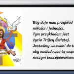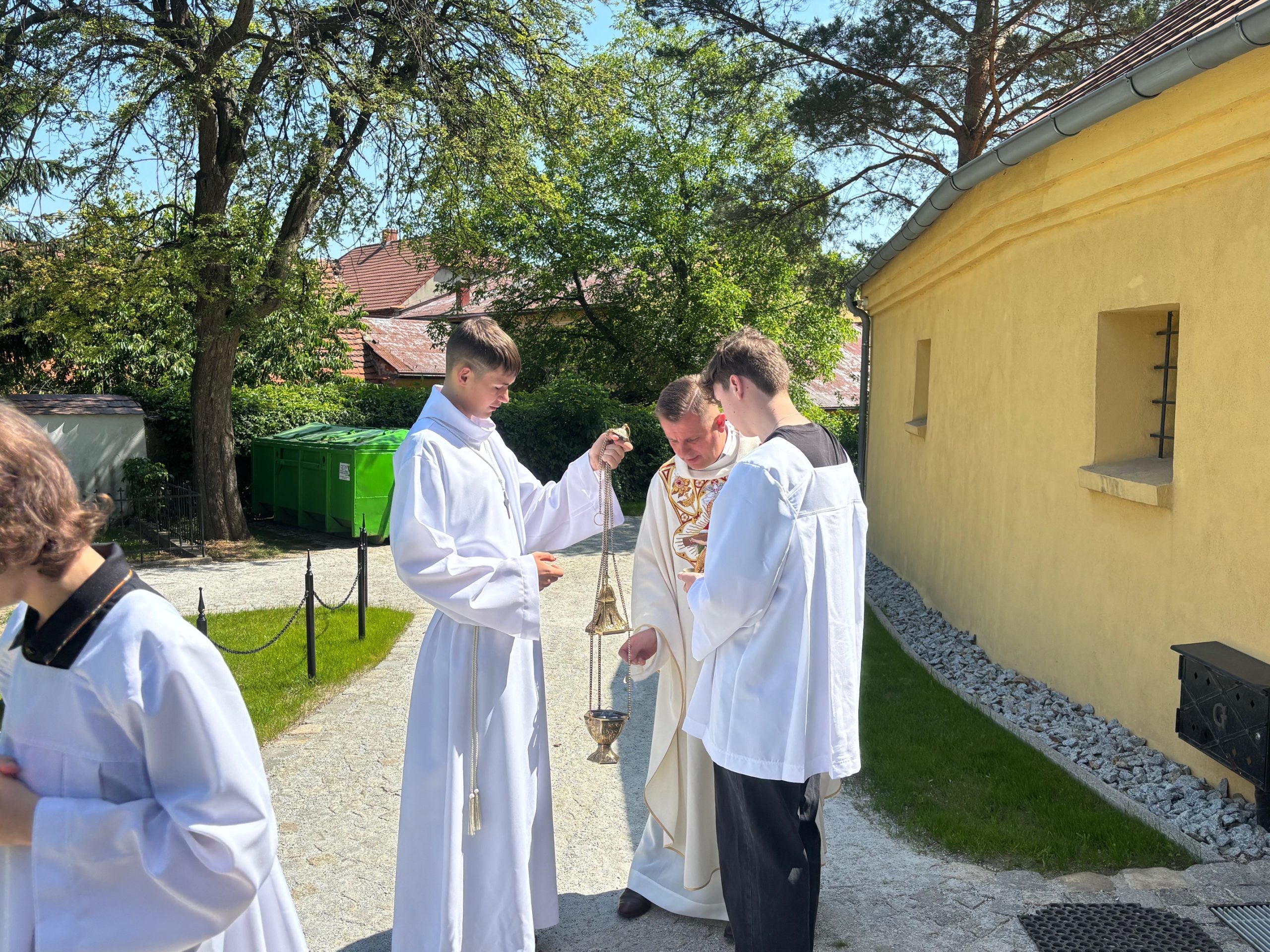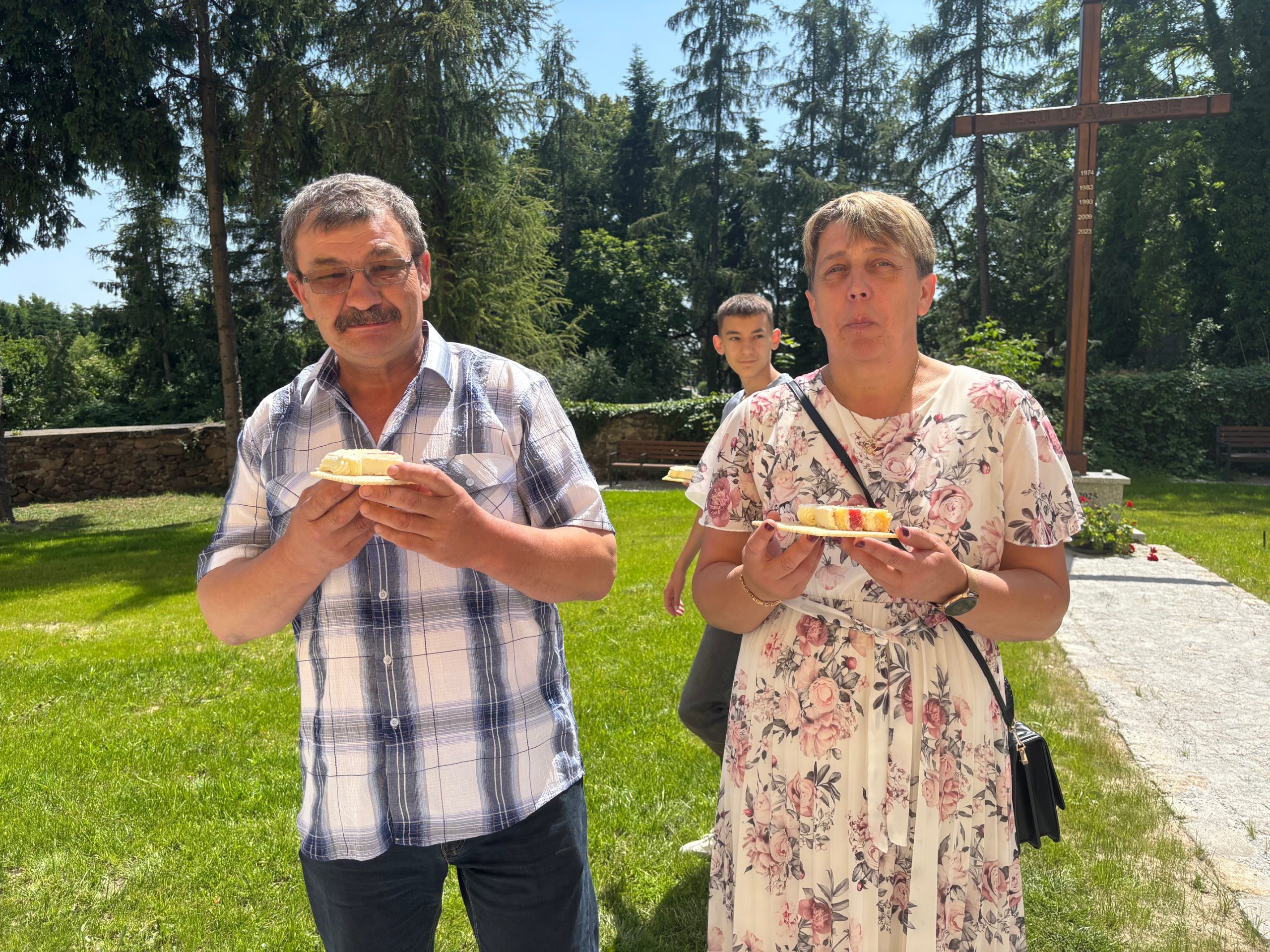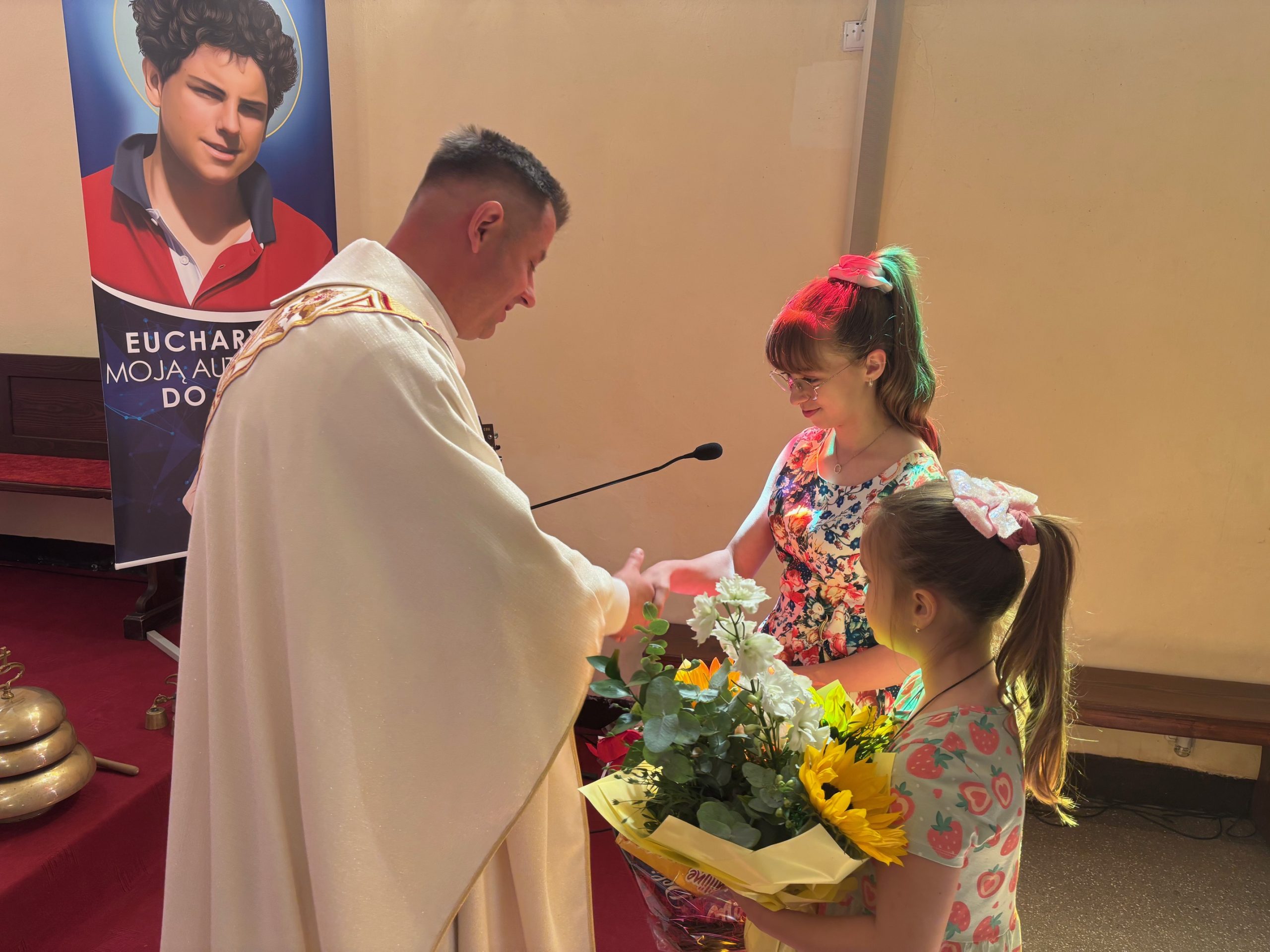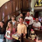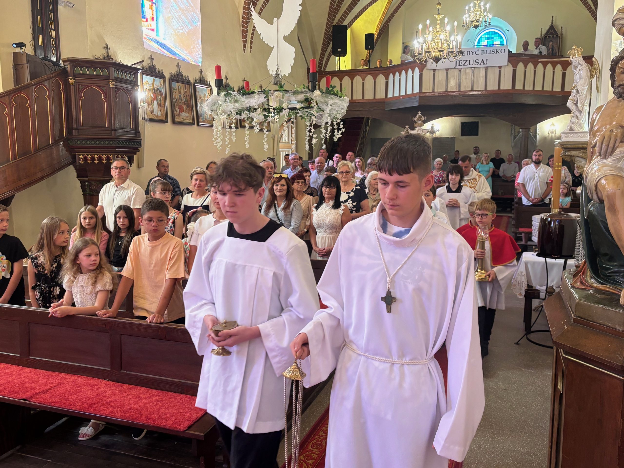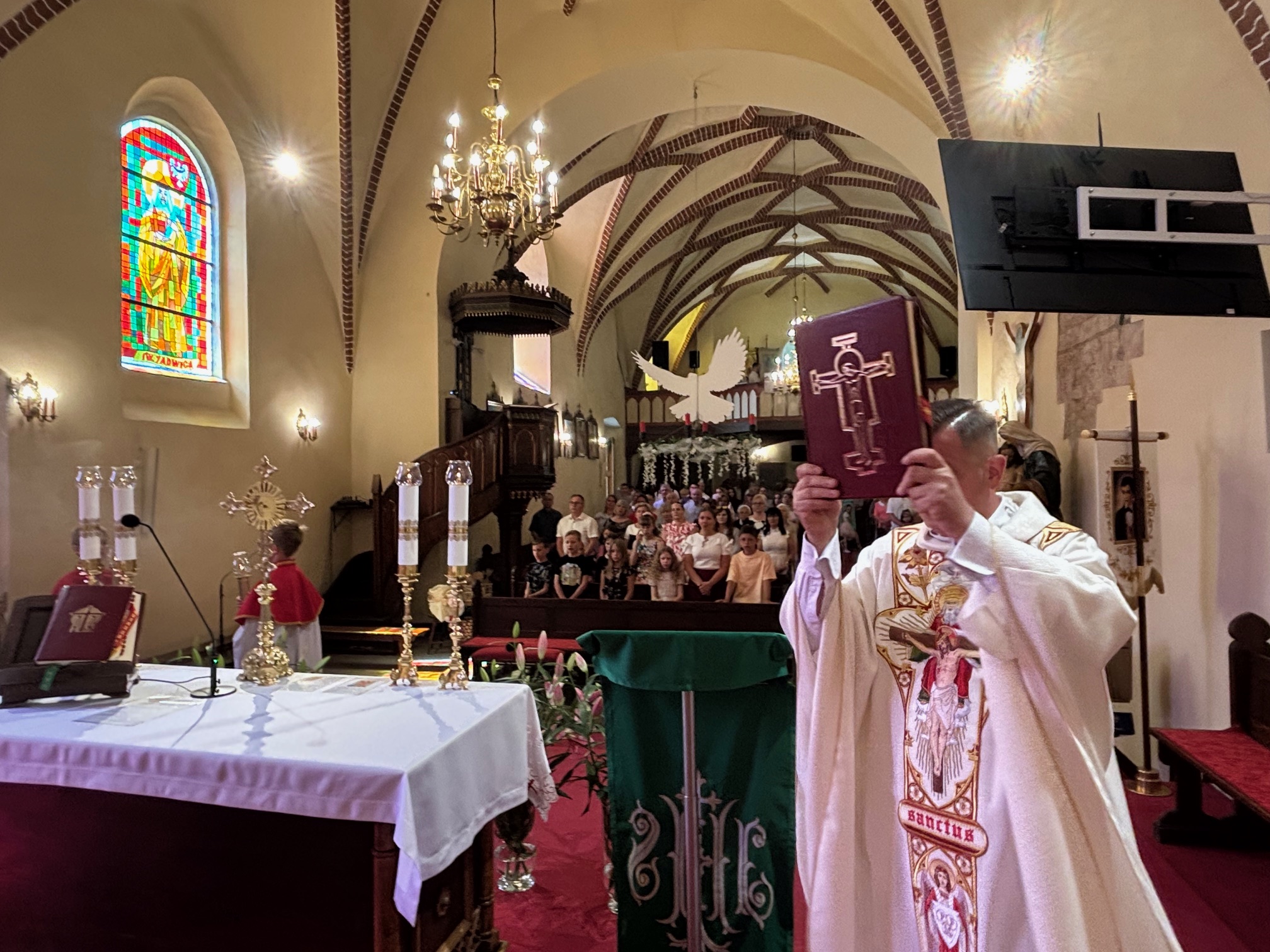 Zauważmy, że Trójca Święta towarzyszy nam od początku naszego życia. Modlitwa do Trójcy Świętej jest pierwszą, której się nauczyliśmy, jest nią znak krzyża: „W imię Ojca i Syna, i Ducha Świętego”. Od tego wezwania Trójcy rozpoczynamy każdą Eucharystię, od niego rozpoczęliśmy także tę Mszę św., po czym dzieci odśpiewały modlitwę „W imię Ojca i Syna i Ducha Świętego…”. Ks. Marcin przypomniał poszczególne Osoby Trójcy Świętej, i co zrobił dla nas Bóg Ojciec, Bóg Syn i Bóg Duch Święty. Kapłan podsumował, że Bóg, Trójca Święta, jest miłością i jednością, i jest tam, gdzie jest miłość i jedność. Po Mszy św. ks. Marcin z okazji swoich urodzin zaprosił wszystkich jej uczestników na tort. I tak słodki poczęstunek pomógł w ten ciepły dzień ucieszyć się sobą nawzajem.