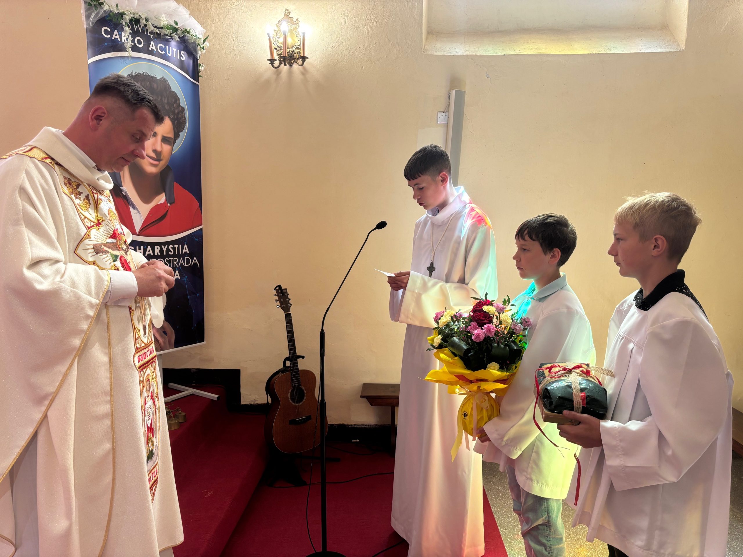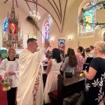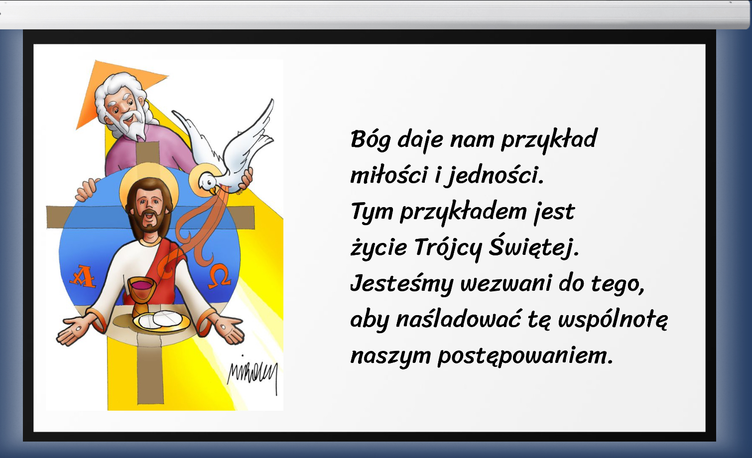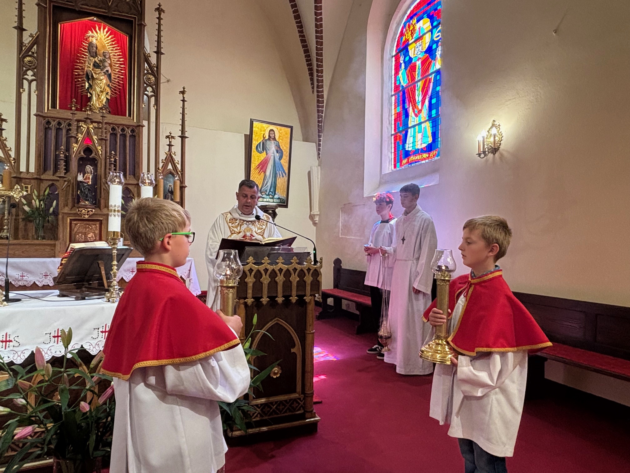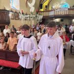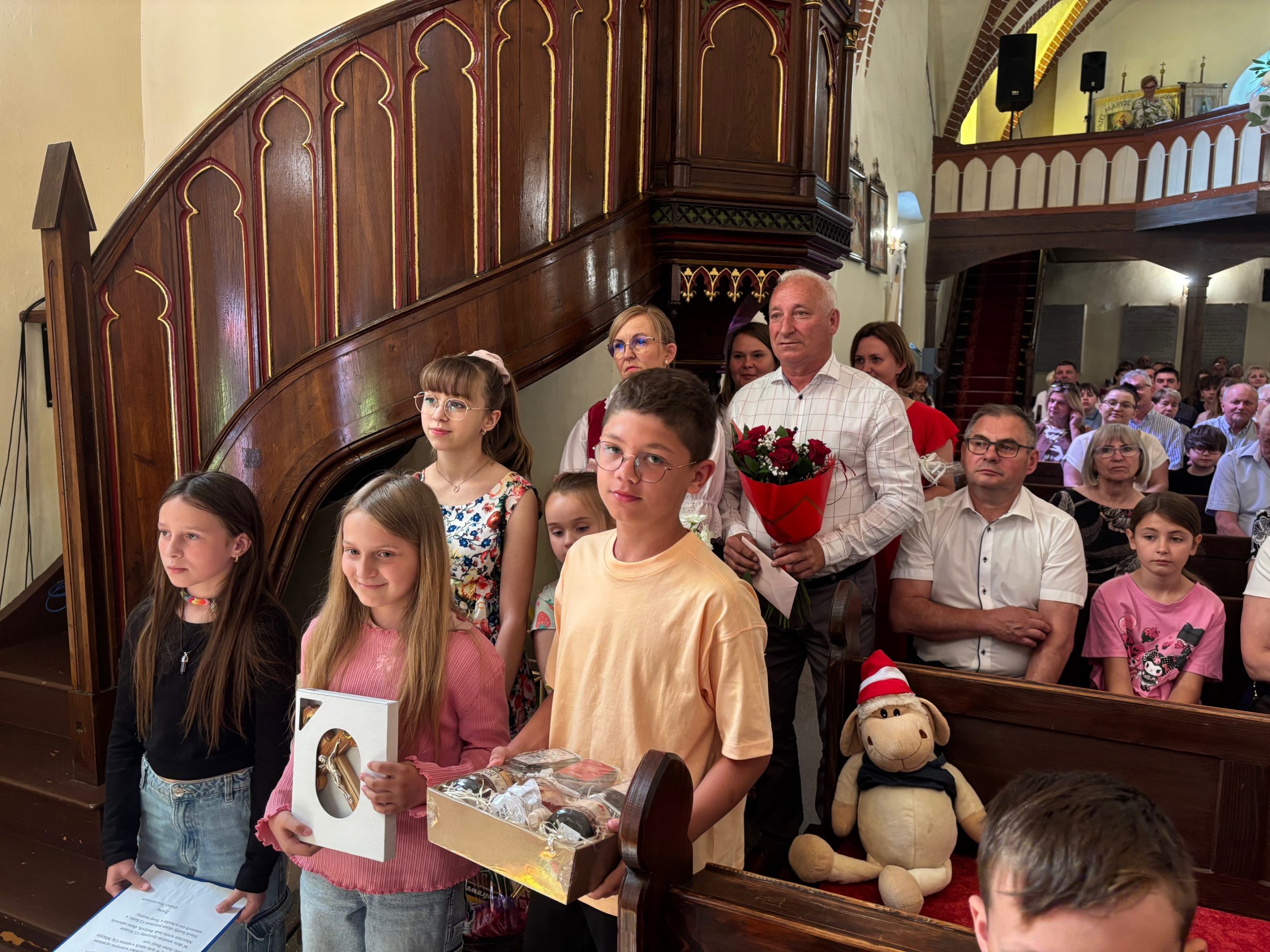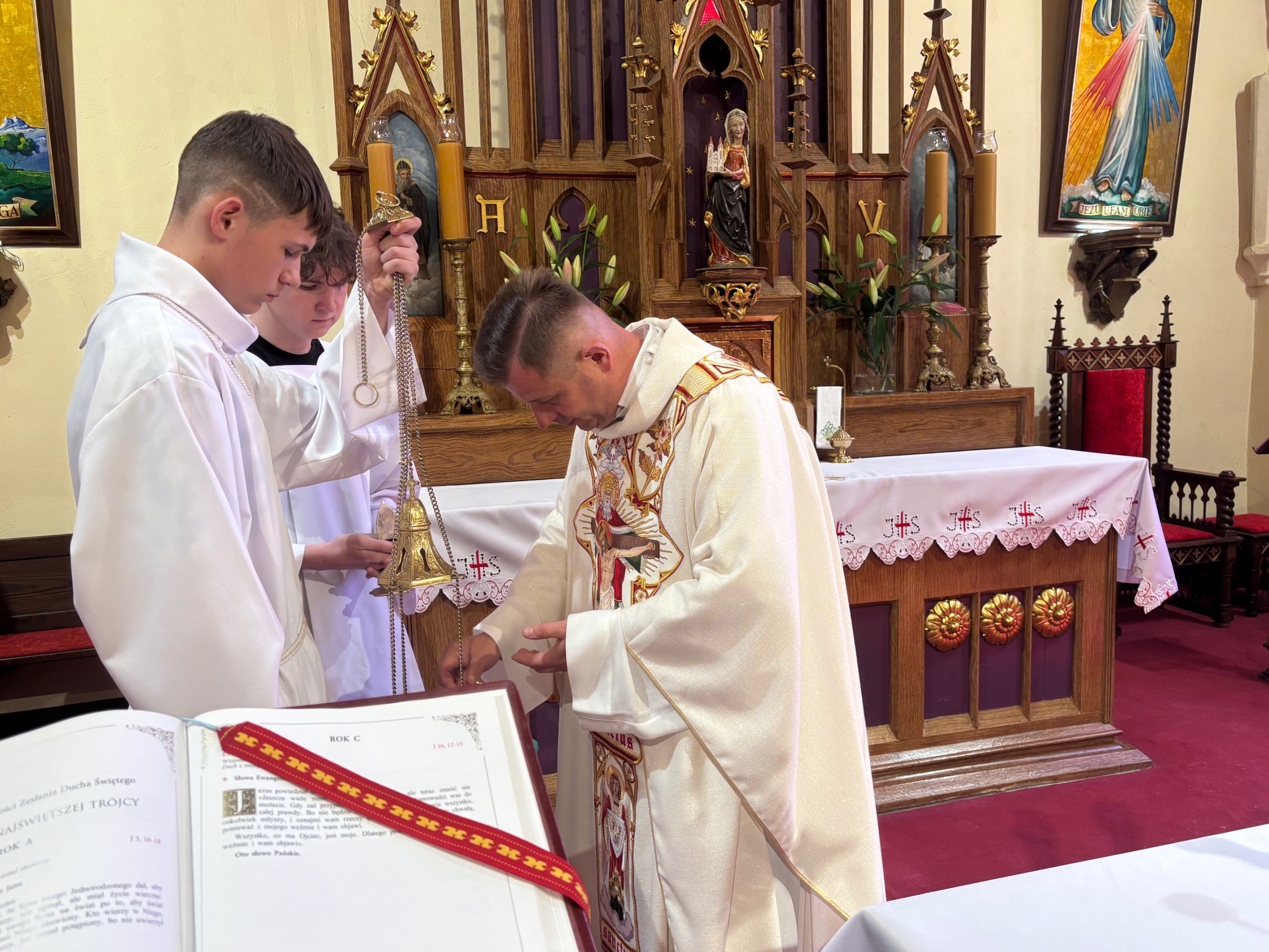 Zauważmy, że Trójca Święta towarzyszy nam od początku naszego życia. Modlitwa do Trójcy Świętej jest pierwszą, której się nauczyliśmy, jest nią znak krzyża: „W imię Ojca i Syna, i Ducha Świętego”. Od tego wezwania Trójcy rozpoczynamy każdą Eucharystię, od niego rozpoczęliśmy także tę Mszę św., po czym dzieci odśpiewały modlitwę „W imię Ojca i Syna i Ducha Świętego…”. Ks. Marcin przypomniał poszczególne Osoby Trójcy Świętej, i co zrobił dla nas Bóg Ojciec, Bóg Syn i Bóg Duch Święty. Kapłan podsumował, że Bóg, Trójca Święta, jest miłością i jednością, i jest tam, gdzie jest miłość i jedność. Po Mszy św. ks. Marcin z okazji swoich urodzin zaprosił wszystkich jej uczestników na tort. I tak słodki poczęstunek pomógł w ten ciepły dzień ucieszyć się sobą nawzajem.