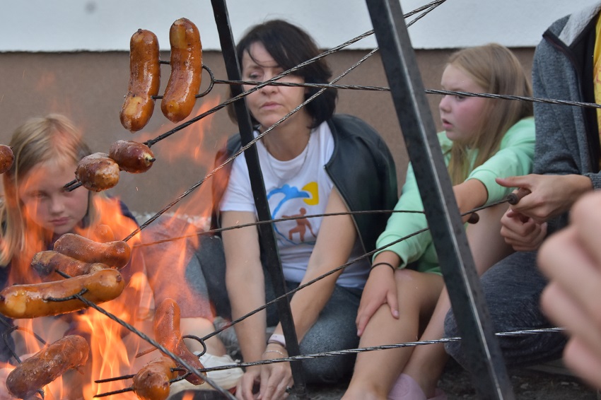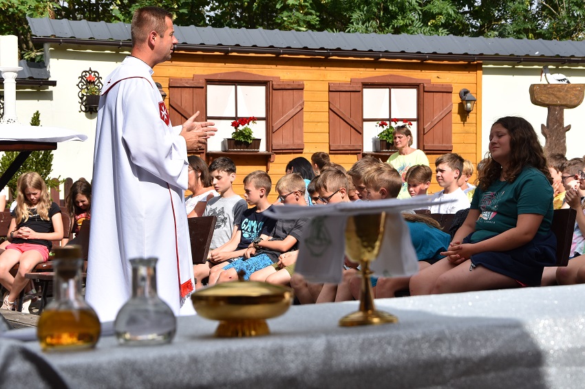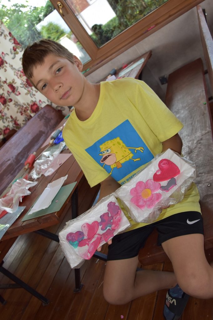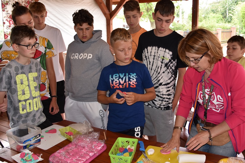 Dzisiaj mija 8 dzień naszego obozu. Zaczęliśmy go od super śniadania, którym się nasyciliśmy. Na stołówce ksiądz Marcin przedstawił nam plan dzisiejszego dnia. Po posiłku mieliśmy godzinę wolną, by przygotować się na warsztaty z ceramiki, odbywające się w trzech turach. Tworzyliśmy z kolorowej masy. Lepiliśmy z nich serca i zwierzątka dla siebie oraz swoich bliskich. Później miała miejsce przerwa na przebranie się i szybkie wyjście na obiad. Nasz kolega Mikołaj wraz z przyjacielem, rozpoczął casting na “najlepszego zioma”. Rywalizacja była zacięta. Wychowankowie bawili się super. Nasza kochana pani Irenka, wzięła udział w konkursie i go wygrała!!! Zachwyciła jurorów pięknym głosem w utworze ,, Panie Janie “. Po castingu przyjechała do nas, już dobrze nam znana, pani Jadzia Kozakowska, by towarzyszyć nam w ostatnich dniach kolonii. Popołudniu odbyła się msza święta. Jej motywem przewodnim była litera “M”, jak miłość. Nasz przewodnik duchowy modlił się o odnalezienie miłości w różnych jej formach, byśmy nauczyli się kochać i byli odpowiedzialni za tych, których kochamy. Centralnym punktem dnia okazało się spotkanie przy ognisku, w trakcie którego były rozdane nagrody w kategoriach, np. najsympatyczniejszy uczestnik / uczestniczka, oprawa mszy świętej, niezniszczalny zawodnik mistrz ping ponga, “clean mop” – czyli osoby, które lubią sprzątać w nieswoich pokojach. Trochę pół-żartem, a pół- serio.