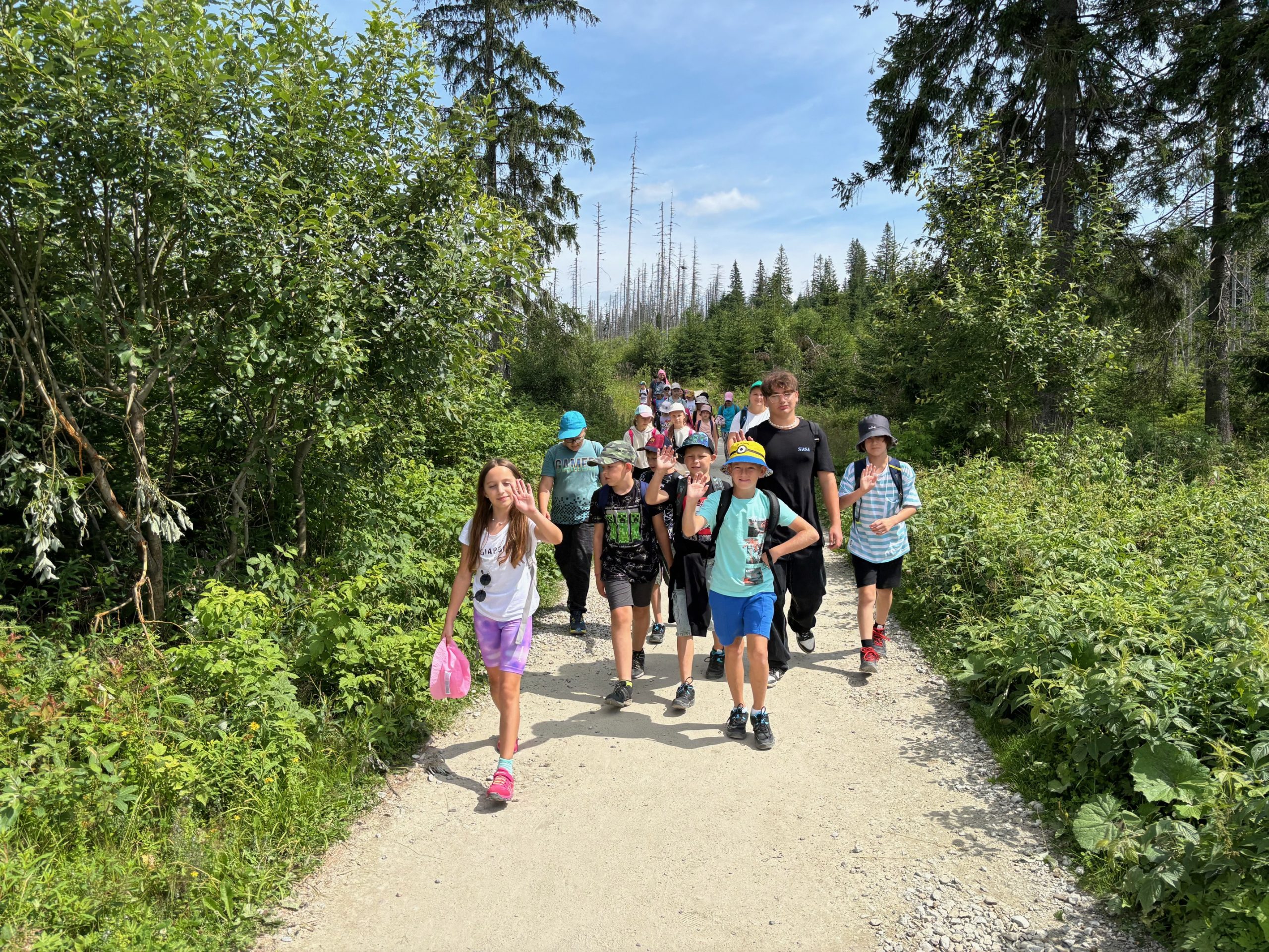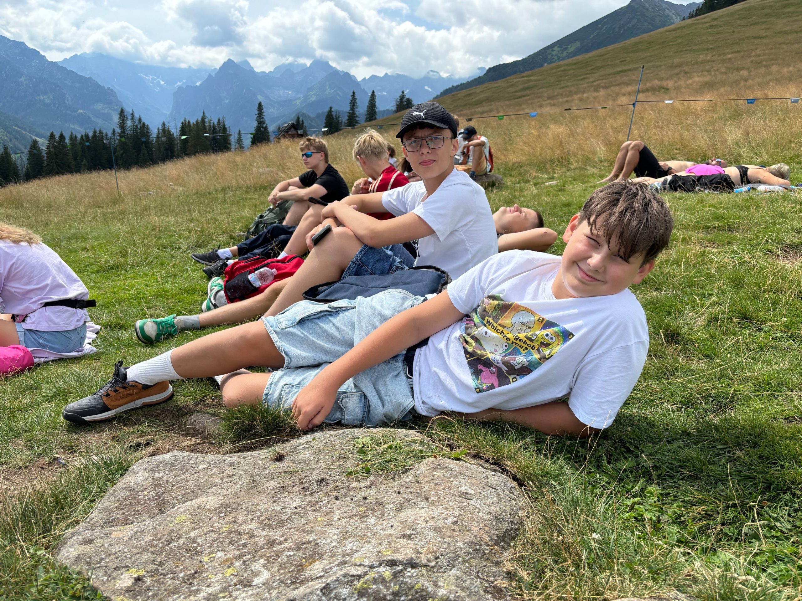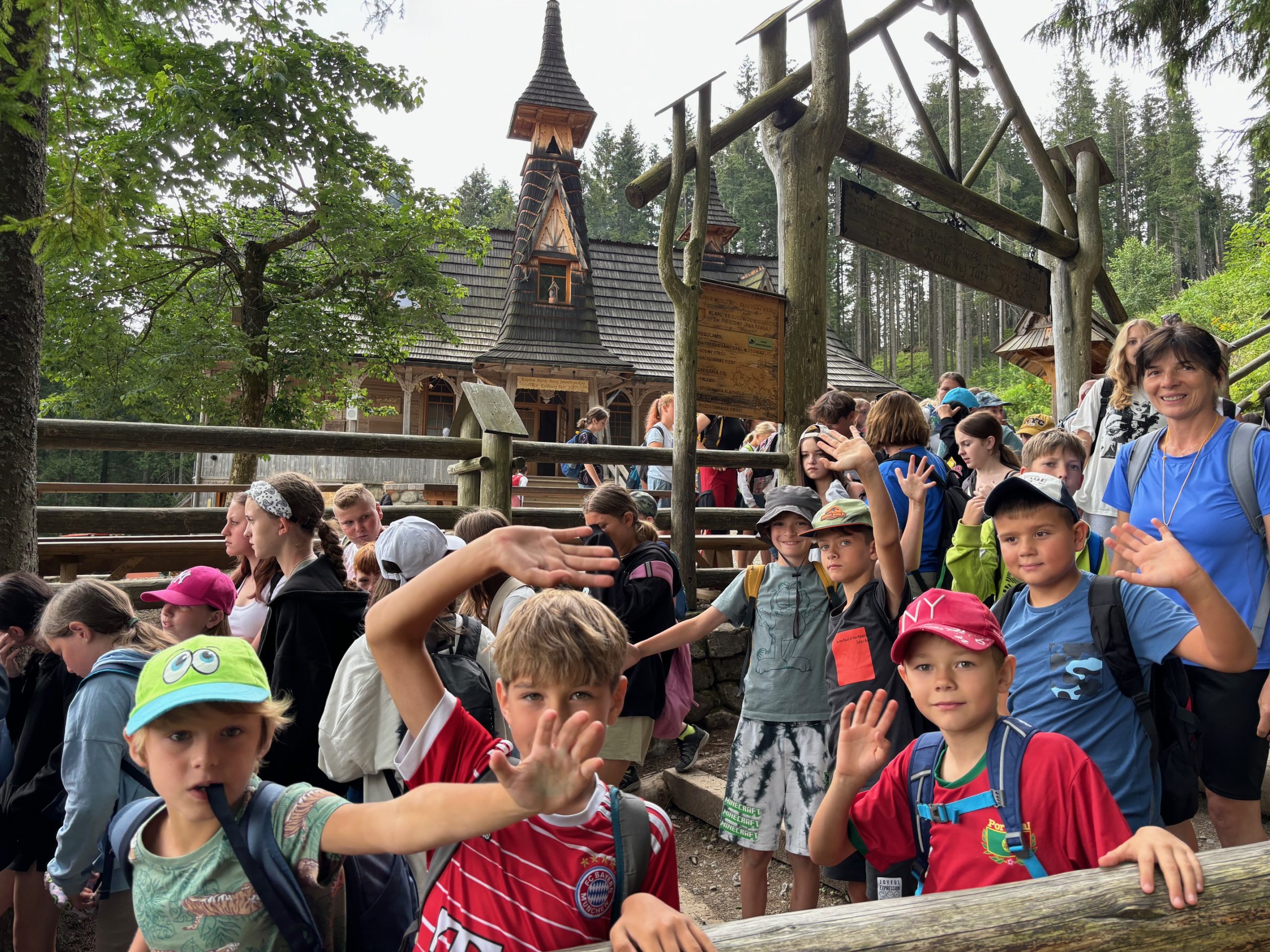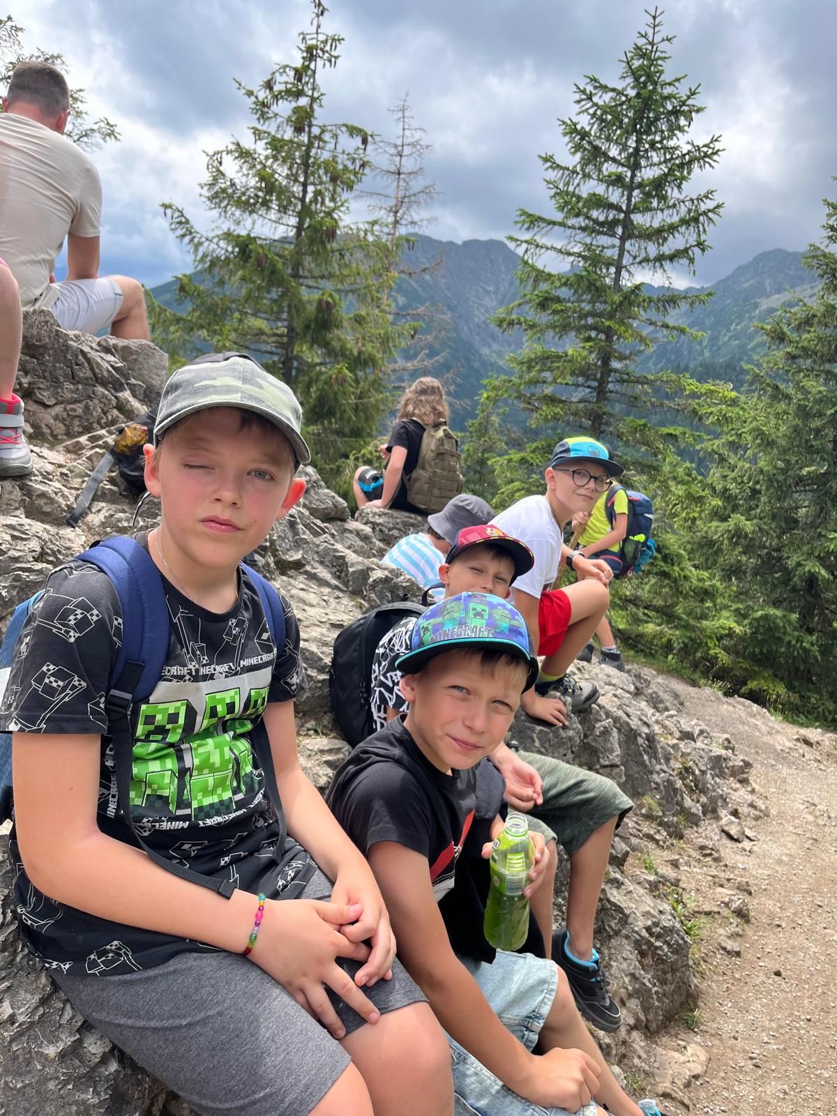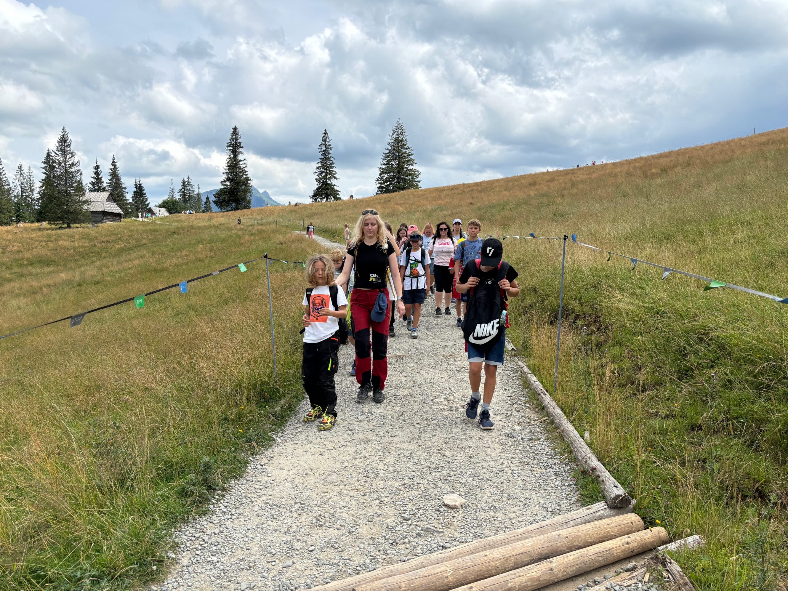 Za nami już połowa obozu. Mnóstwo atrakcji, moc radości i nowe znajomości. A dziś… kolejny punkt wakacyjnego programu został zrealizowany! Zdobyliśmy szczyt góry o nazwie Gęsia Szyja. To była nasza pierwsza wycieczka, dzięki której mogliśmy sprawdzić swoją wytrzymałość i wiedzę na temat pieszych wędrówek. Do celu prowadzili nas przewodnicy Tatrzańskiego Parku Narodowego. Na szlaku dbaliśmy o odpowiednie nawodnienie oraz odpoczynek. Podziwialiśmy wspaniały krajobraz Tatr z Rusinowej Polany, a potem z samego szczytu góry. Dla takich widoków warto było się trudzić. W bacówce degustowaliśmy oscypki, bundz i żętycę. W drodze powrotnej zeszliśmy na mszę świętą do malowniczego Sanktuarium pw.Matki Bożej Jaworzyńskiej Królowej Tatr na Wiktorówkach. Ksiądz Marcin w kazaniu nawiązał do kolejnej litery hasła: „G” jak GODNOŚĆ dziecka Bożego. Po trudach wędrówki, z radością zjedliśmy obiadokolację. Późnym popołudniem bawiliśmy się na boisku i w basenie na terenie ośrodka. Część uczestników, razem z wychowawcami, wybrała się na spacer po okolicy połączony z zakupami. Jutro czekają na nas kolejne atrakcje. Trzeba zbierać nowe siły.