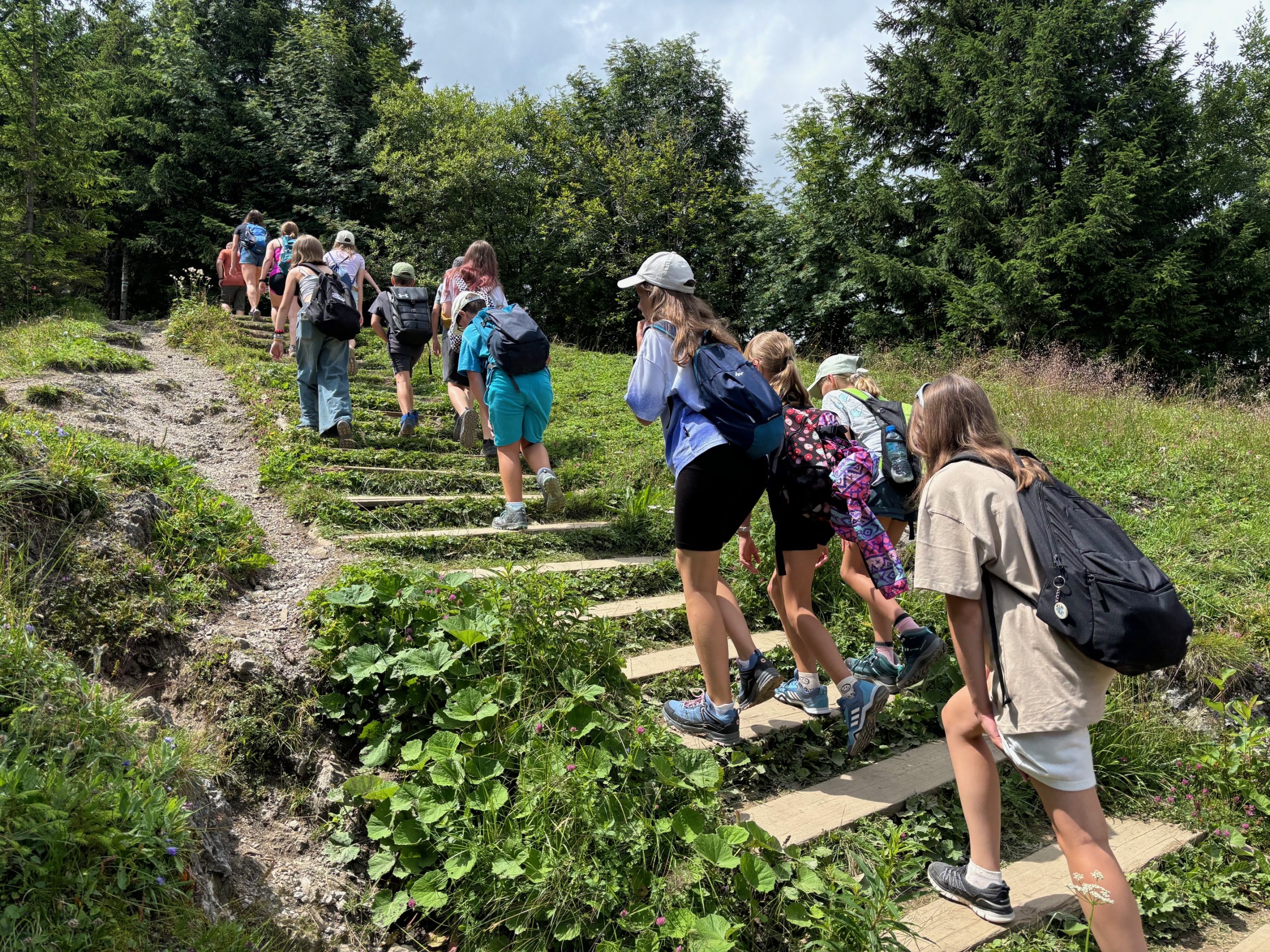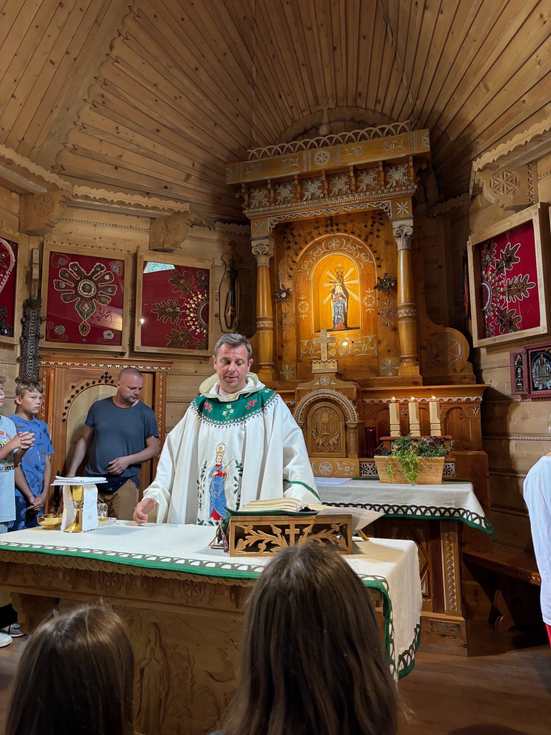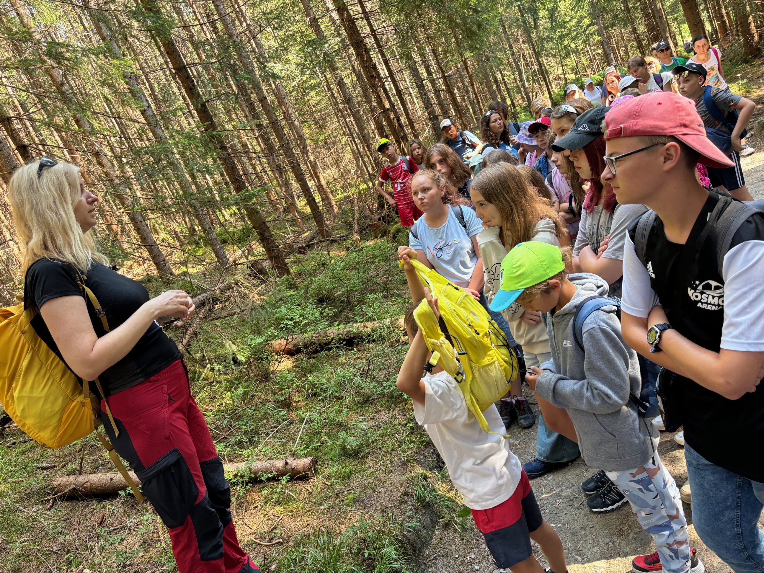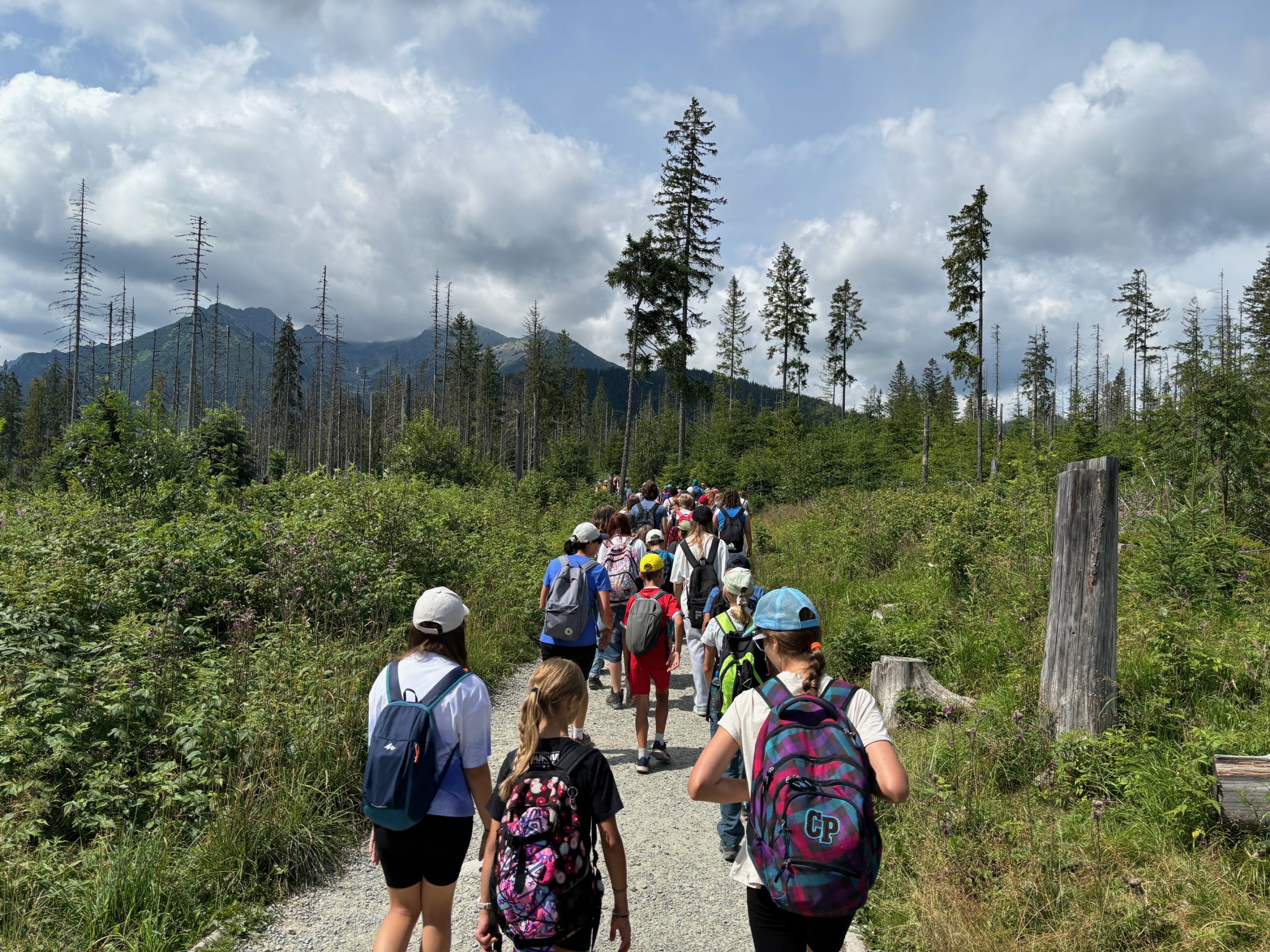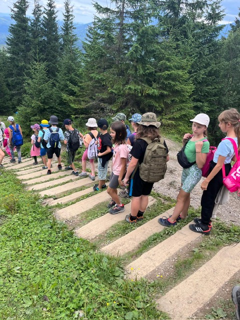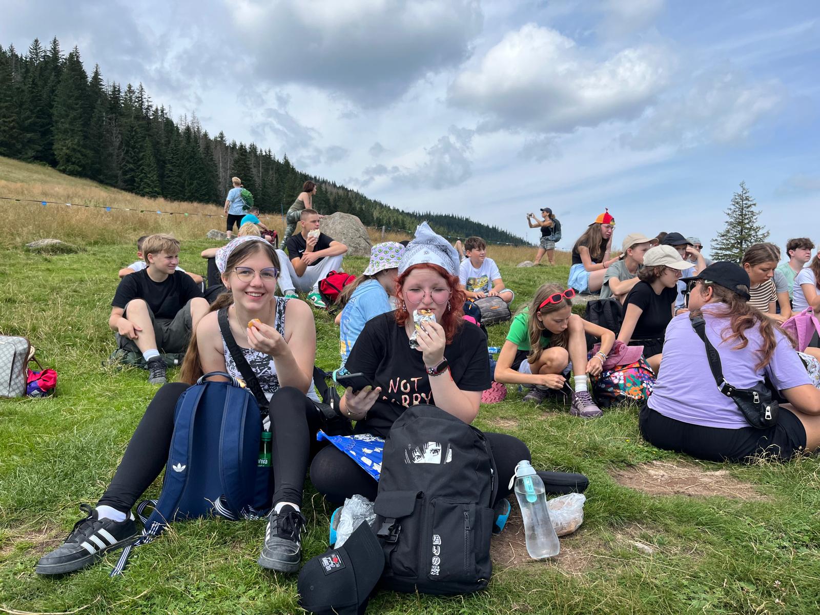 Za nami już połowa obozu. Mnóstwo atrakcji, moc radości i nowe znajomości. A dziś… kolejny punkt wakacyjnego programu został zrealizowany! Zdobyliśmy szczyt góry o nazwie Gęsia Szyja. To była nasza pierwsza wycieczka, dzięki której mogliśmy sprawdzić swoją wytrzymałość i wiedzę na temat pieszych wędrówek. Do celu prowadzili nas przewodnicy Tatrzańskiego Parku Narodowego. Na szlaku dbaliśmy o odpowiednie nawodnienie oraz odpoczynek. Podziwialiśmy wspaniały krajobraz Tatr z Rusinowej Polany, a potem z samego szczytu góry. Dla takich widoków warto było się trudzić. W bacówce degustowaliśmy oscypki, bundz i żętycę. W drodze powrotnej zeszliśmy na mszę świętą do malowniczego Sanktuarium pw.Matki Bożej Jaworzyńskiej Królowej Tatr na Wiktorówkach. Ksiądz Marcin w kazaniu nawiązał do kolejnej litery hasła: „G” jak GODNOŚĆ dziecka Bożego. Po trudach wędrówki, z radością zjedliśmy obiadokolację. Późnym popołudniem bawiliśmy się na boisku i w basenie na terenie ośrodka. Część uczestników, razem z wychowawcami, wybrała się na spacer po okolicy połączony z zakupami. Jutro czekają na nas kolejne atrakcje. Trzeba zbierać nowe siły.
