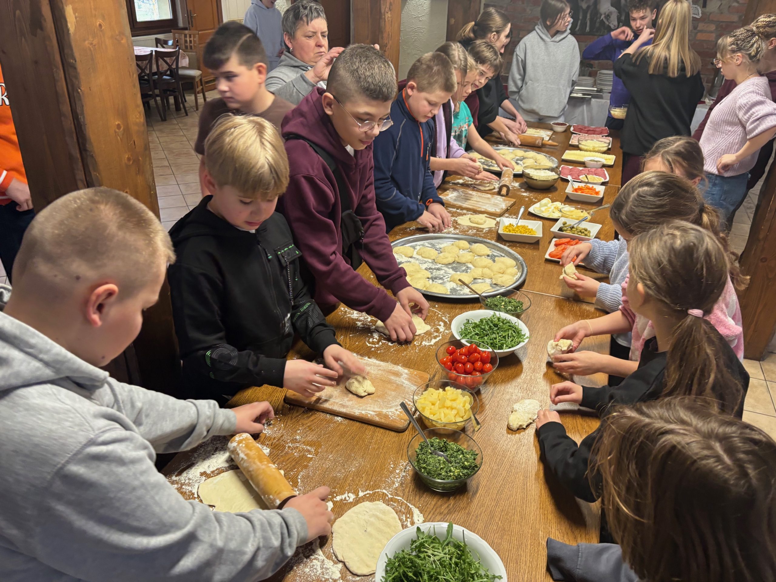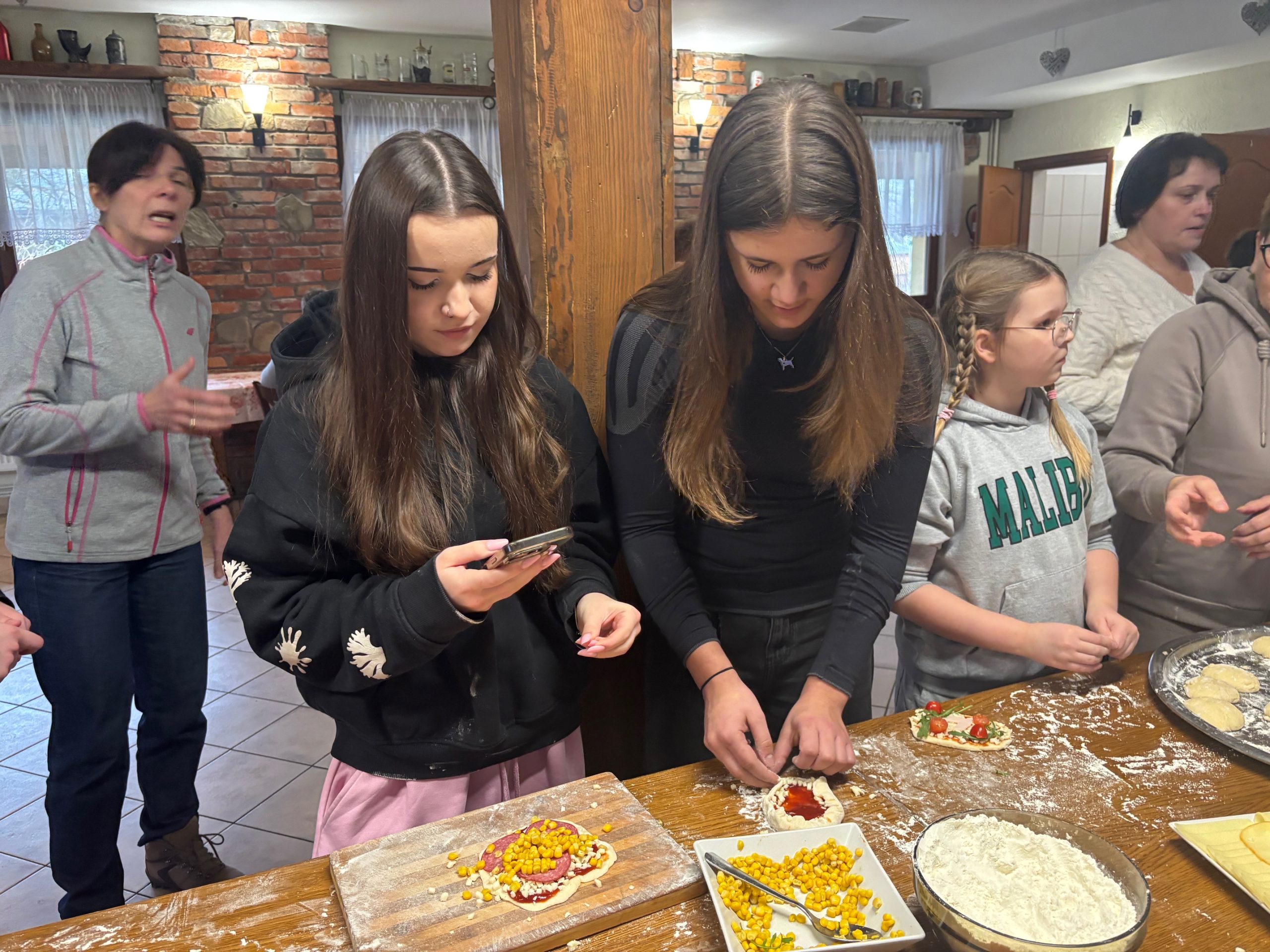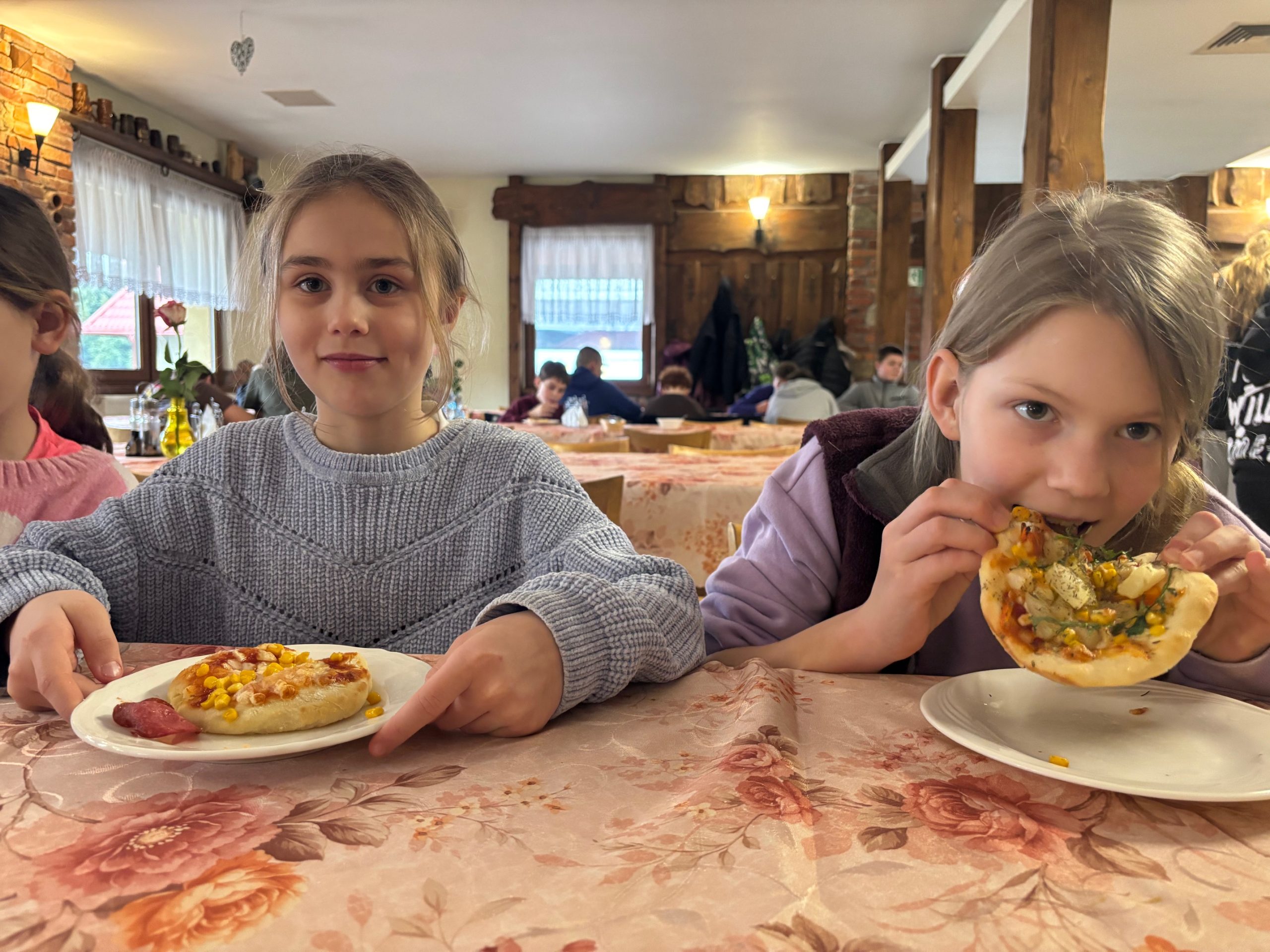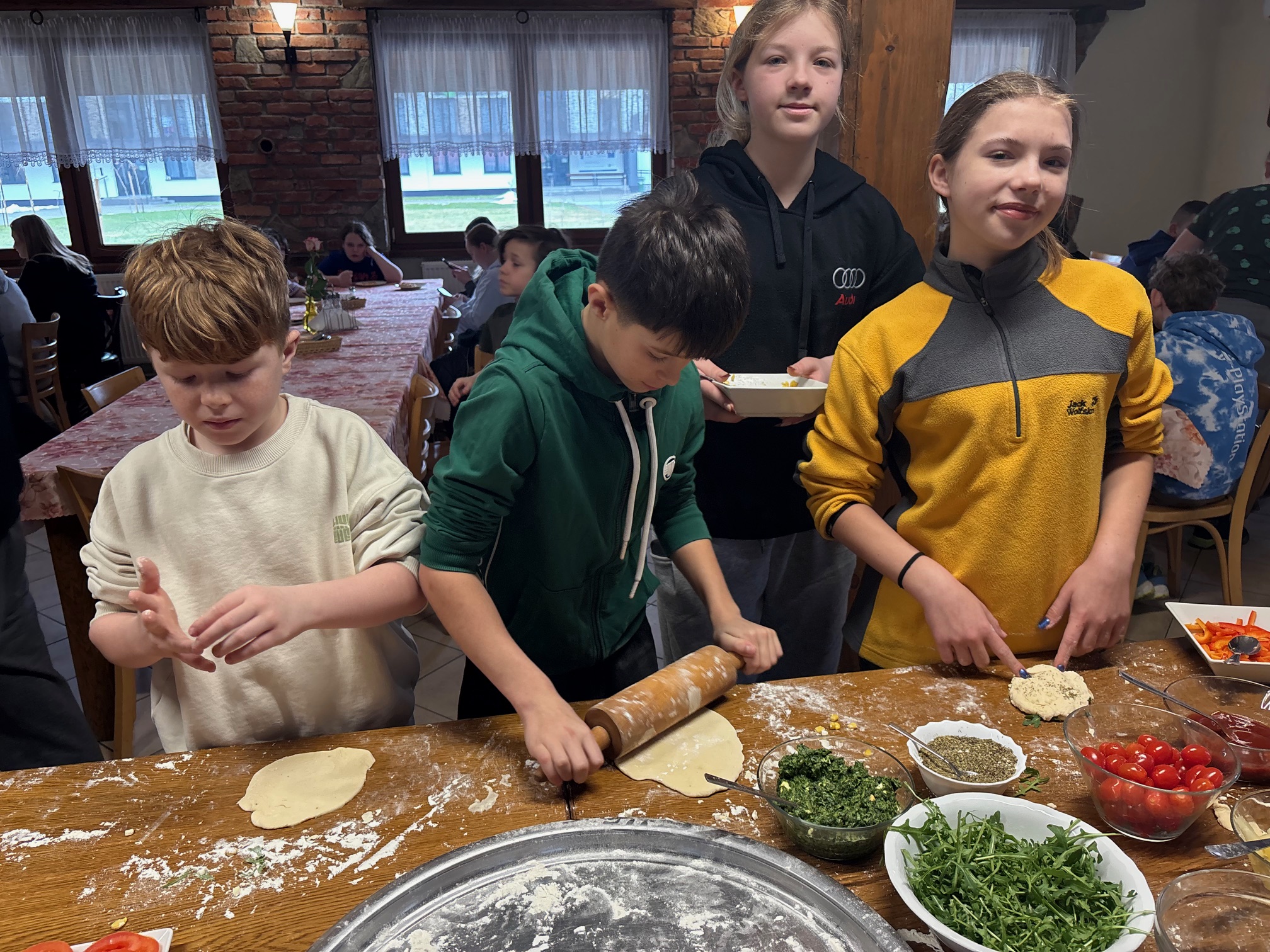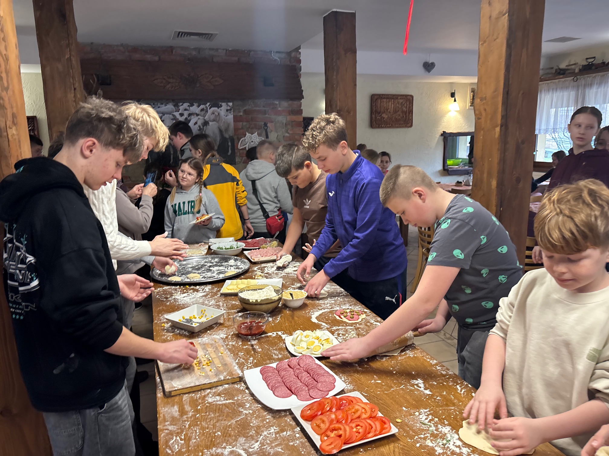 Dzień rozpoczęliśmy od pobudki i wspólnego wyjścia na śniadanie, które dało nam siłę na kolejne atrakcje🏋️♀️. Następnie wzięliśmy udział w warsztatach z robienia pizzy – każdy mógł przygotować swoją własną kompozycję smaków🍕. Po krótkiej przerwie ruszyliśmy na Dzień Sportu, pełen gier, zabaw i rywalizacji w duchu fair play🏃♀️➡️🏃♂️. Nie zabrakło też spaceru po okolicy, podczas którego mogliśmy nacieszyć się zimowym krajobrazem🏔️.