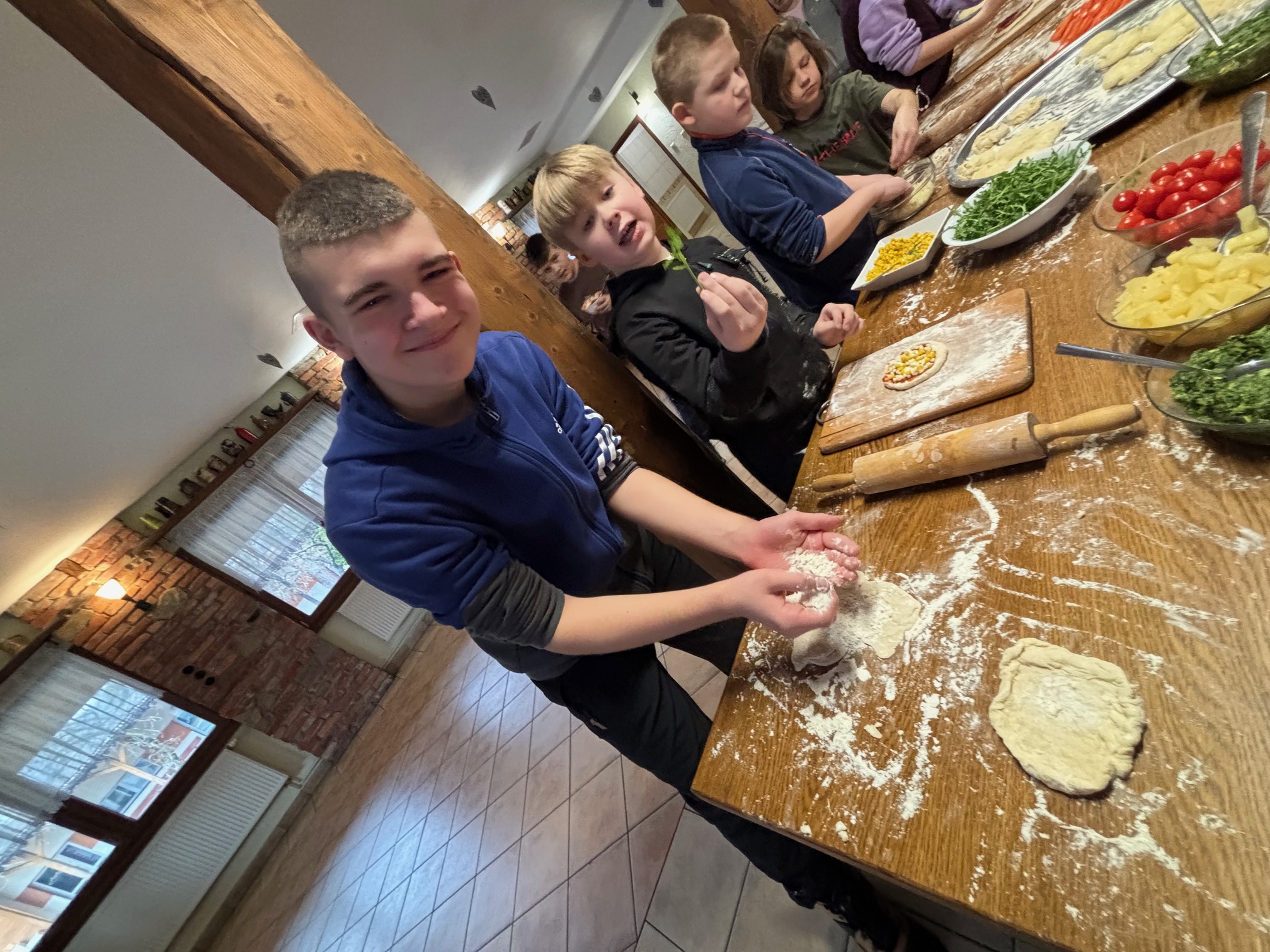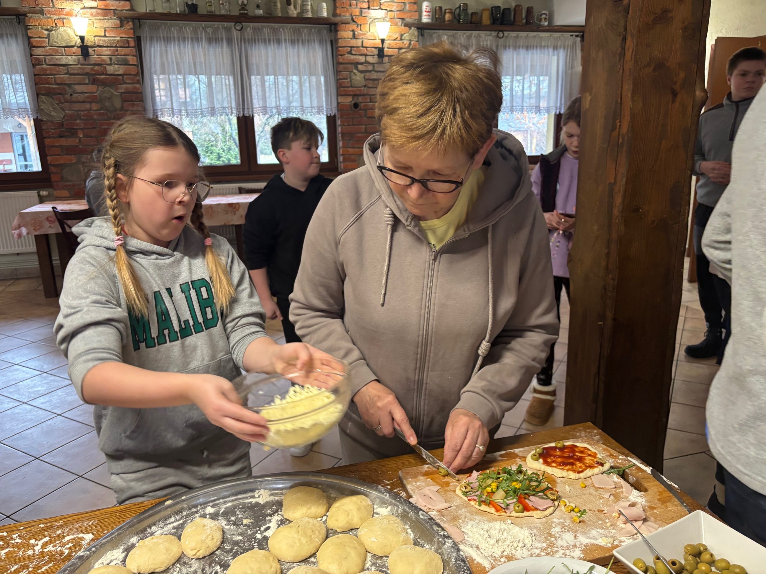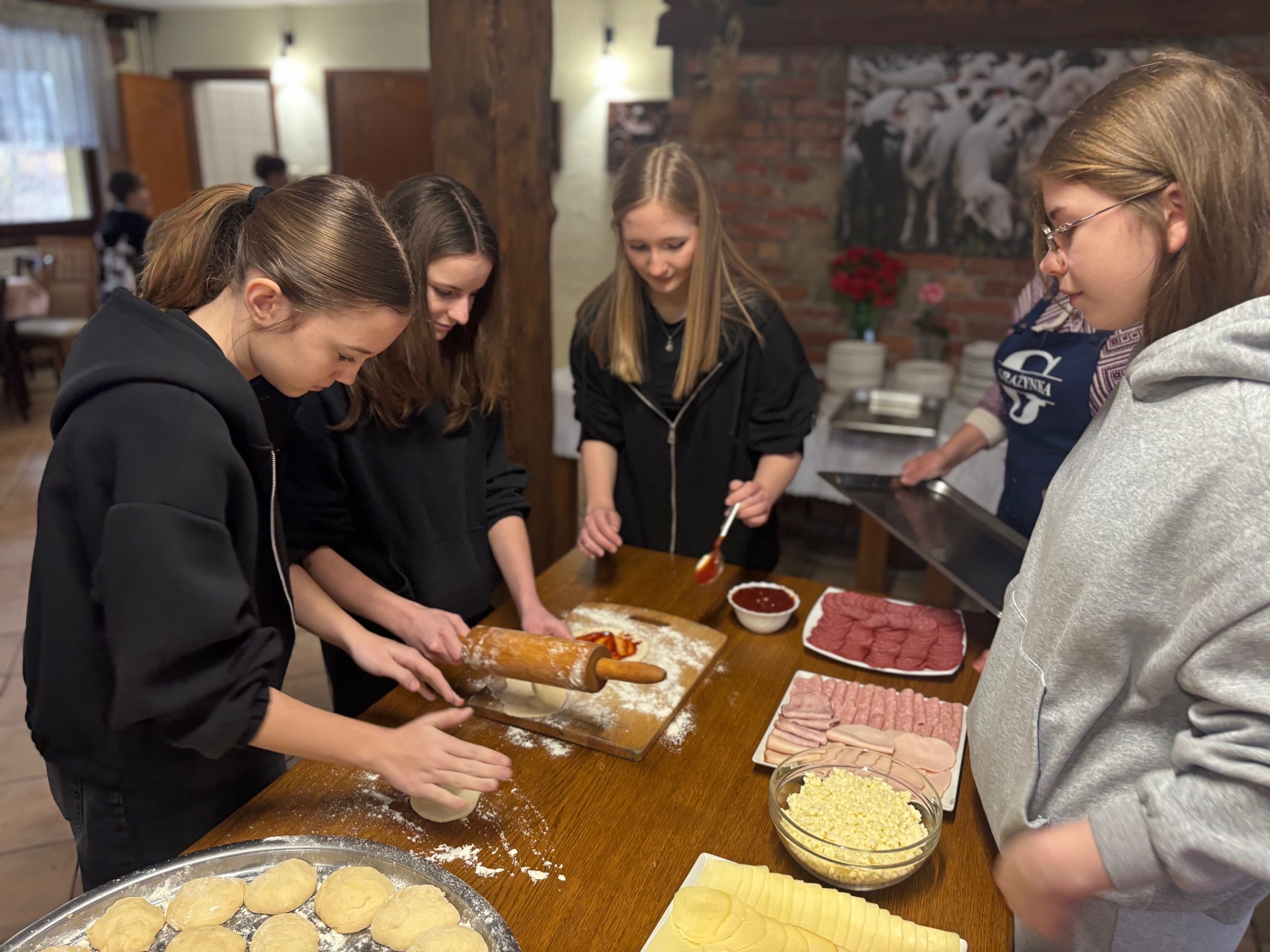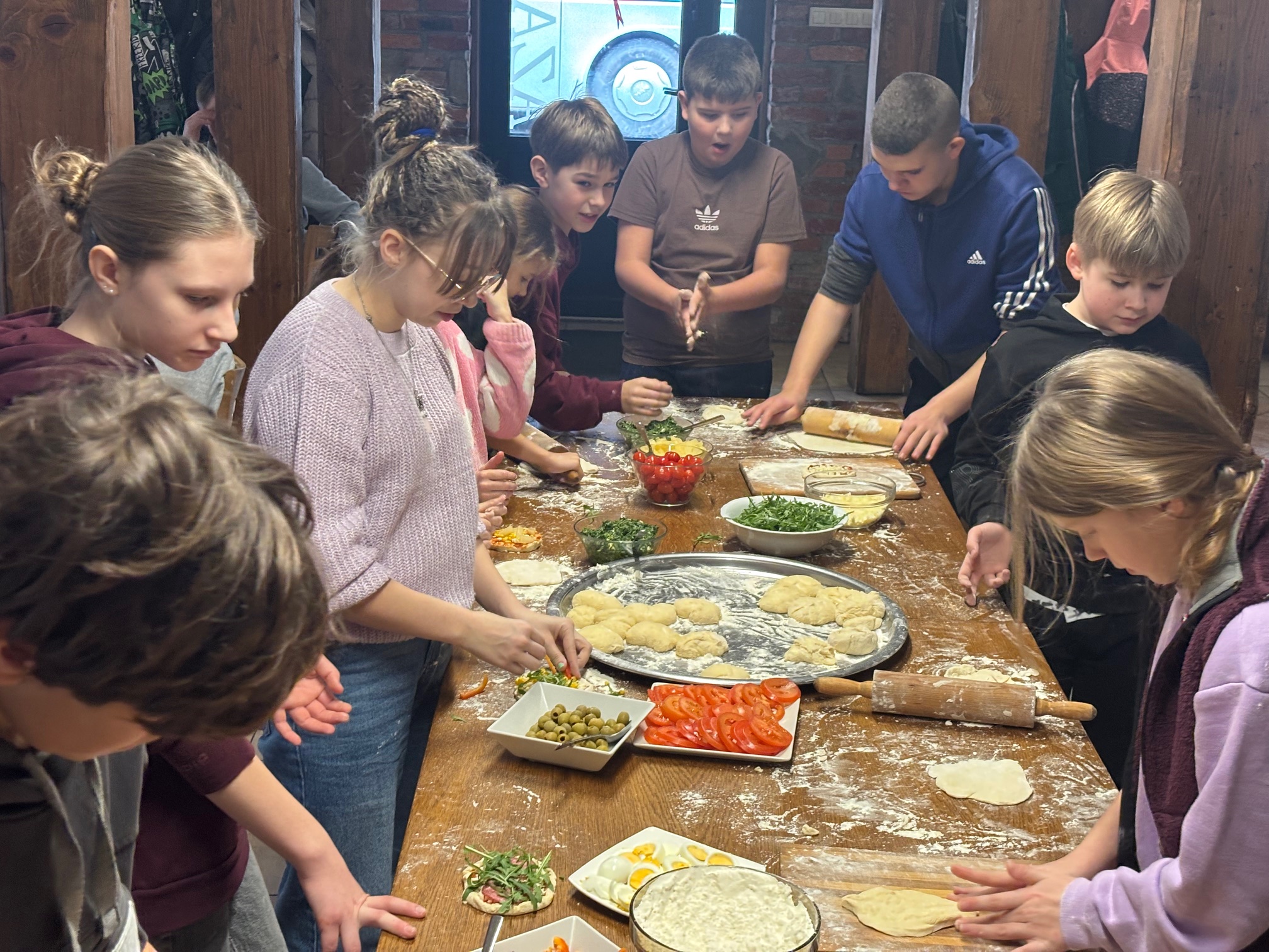 Dzień rozpoczęliśmy od pobudki i wspólnego wyjścia na śniadanie, które dało nam siłę na kolejne atrakcje🏋️♀️. Następnie wzięliśmy udział w warsztatach z robienia pizzy – każdy mógł przygotować swoją własną kompozycję smaków🍕. Po krótkiej przerwie ruszyliśmy na Dzień Sportu, pełen gier, zabaw i rywalizacji w duchu fair play🏃♀️➡️🏃♂️. Nie zabrakło też spaceru po okolicy, podczas którego mogliśmy nacieszyć się zimowym krajobrazem🏔️.